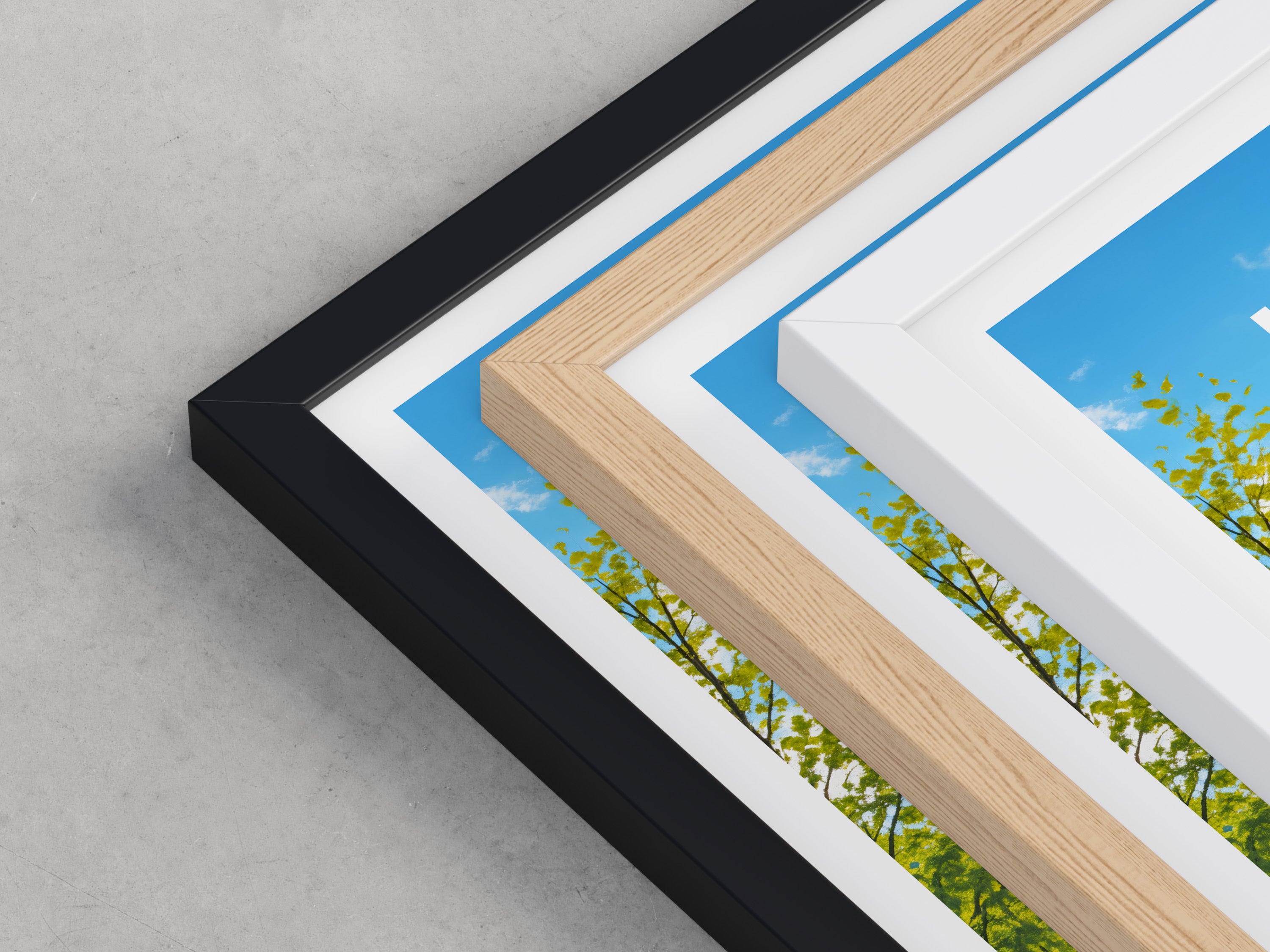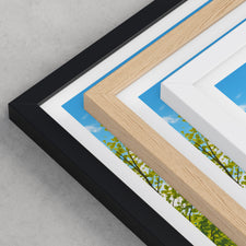 Framed options use sustainably sourced wooden frames in black, white, or natural wood, ready to hang.