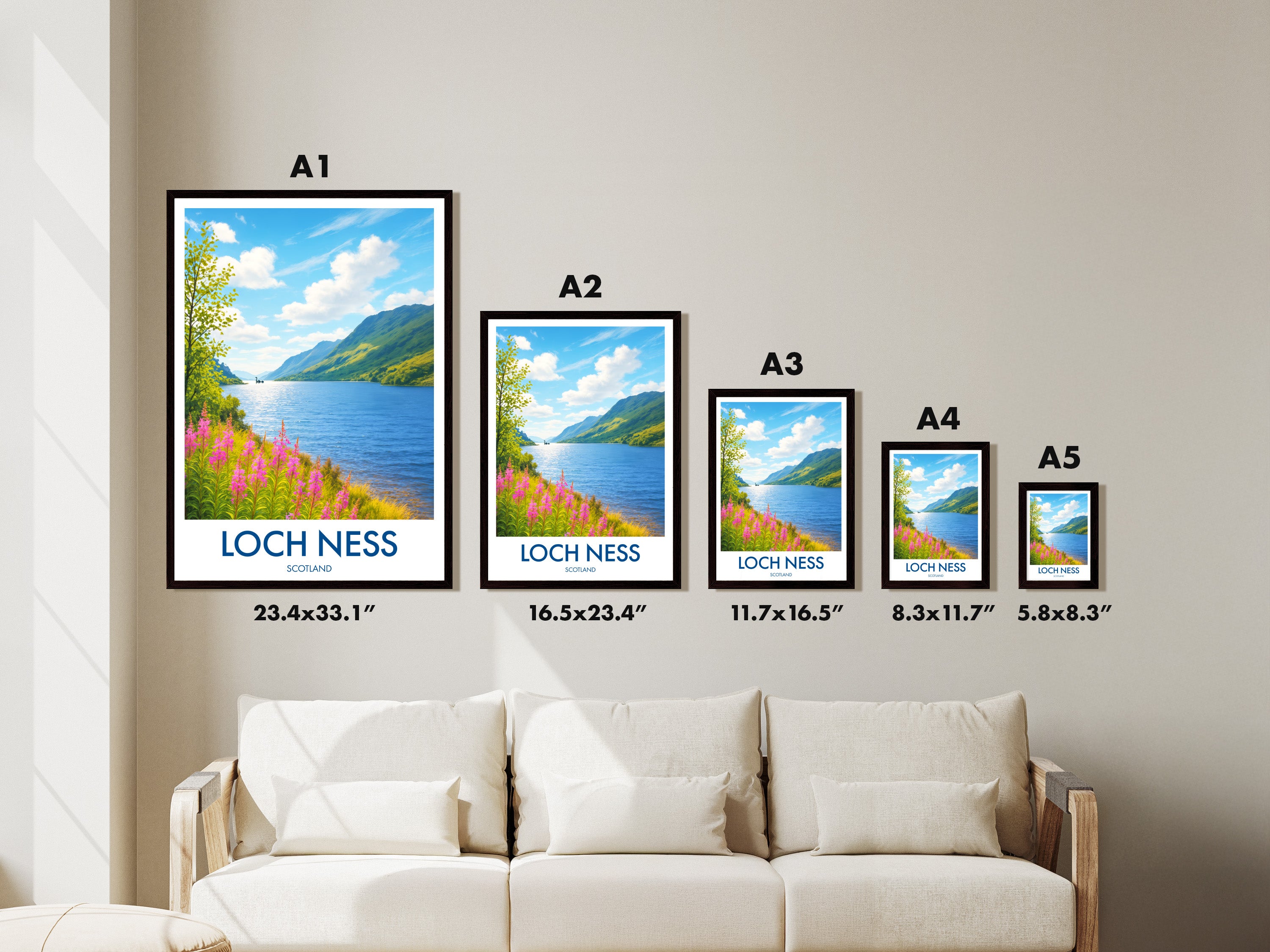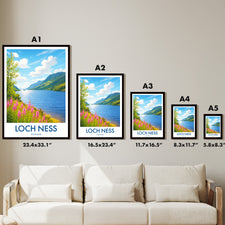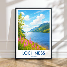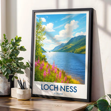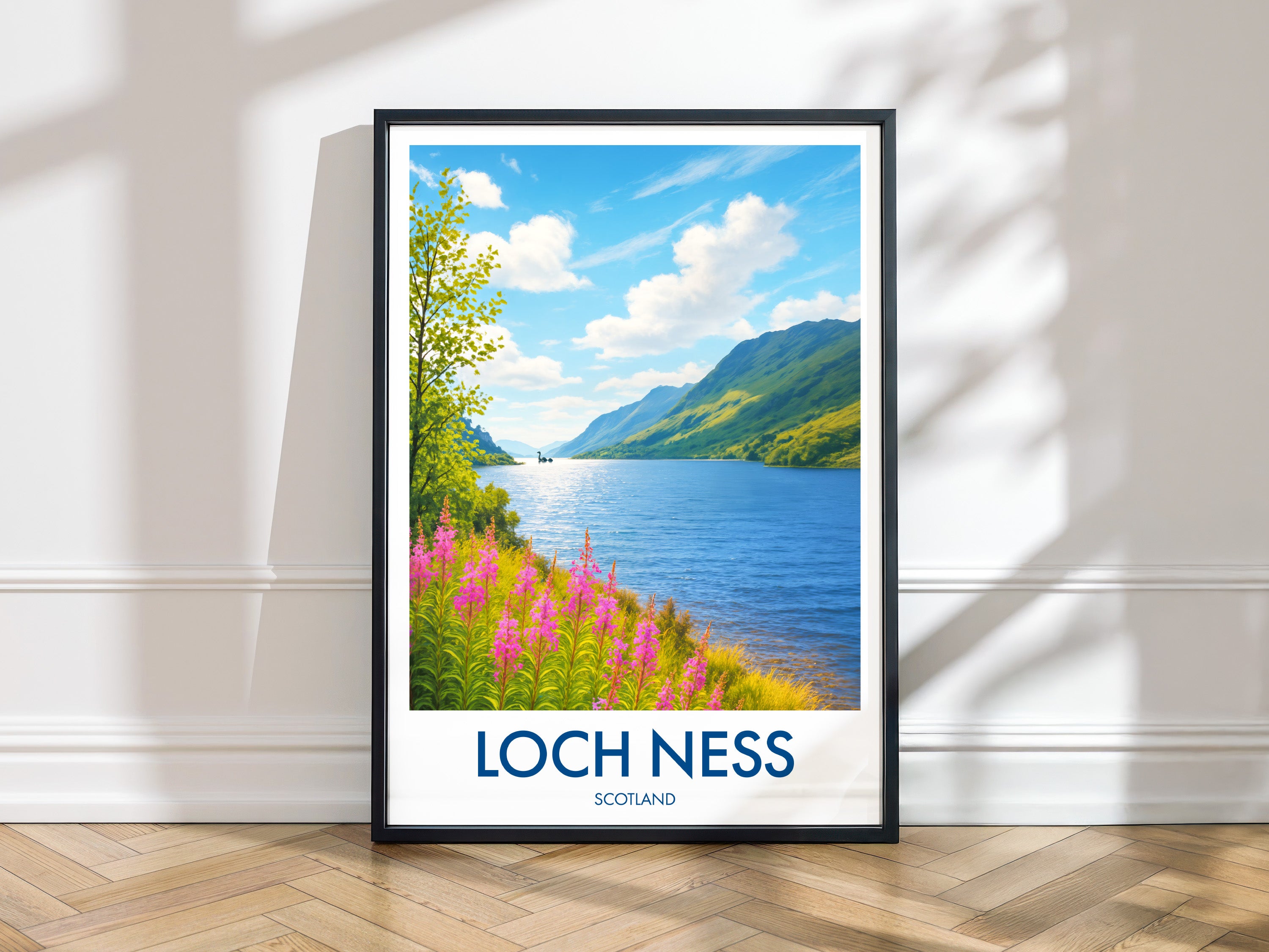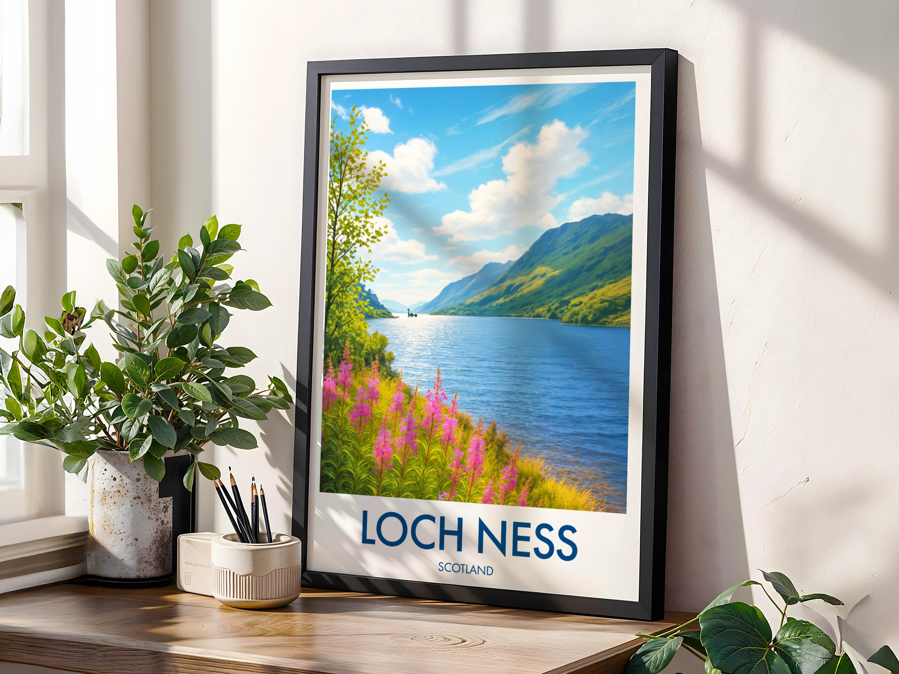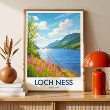 Framed by Highland hills and wildflowers, Loch Ness stretches into the horizon with shimmering waters. This illustrated print celebrates Scotland’s most legendary loch and mythical monster.