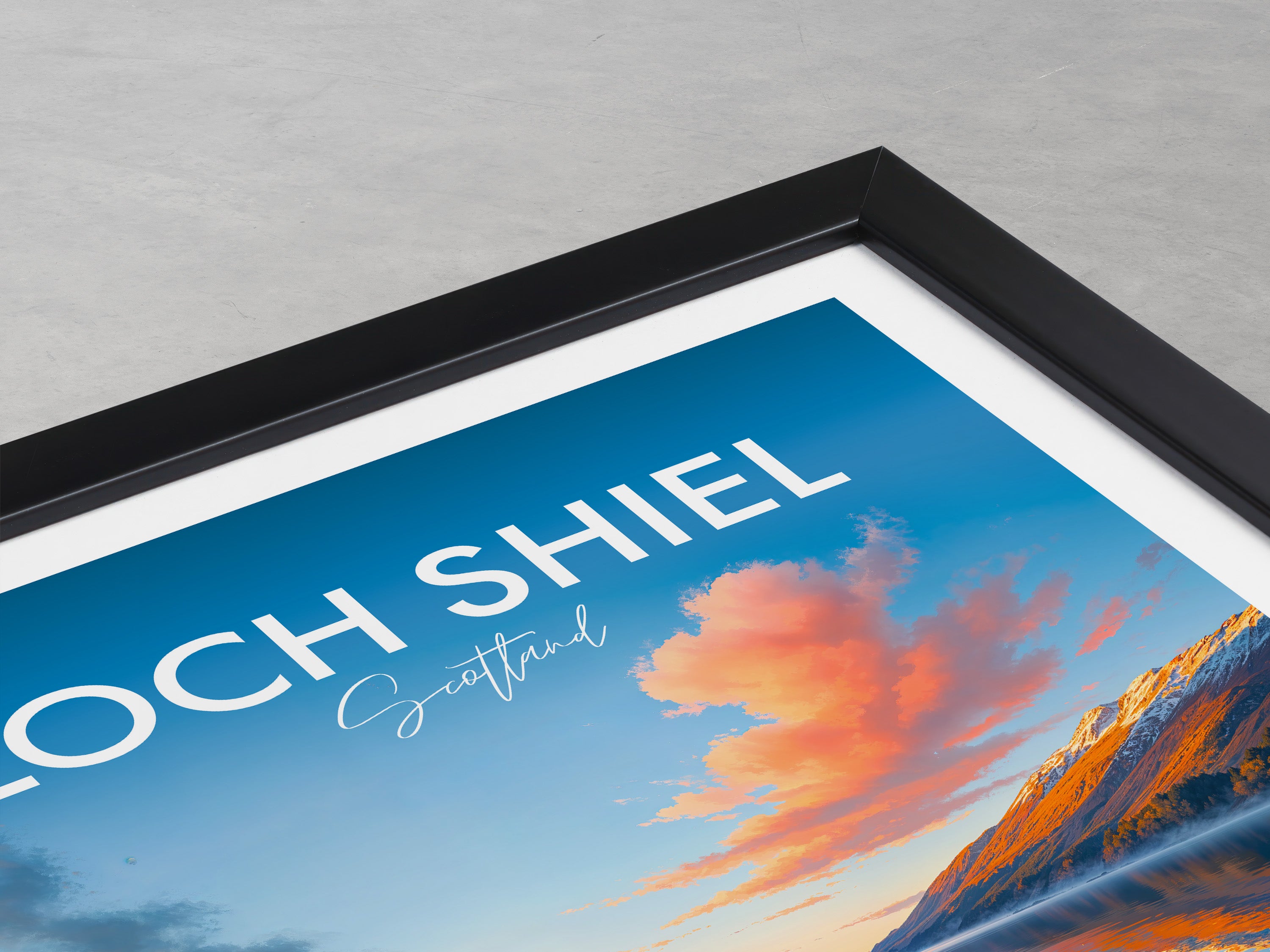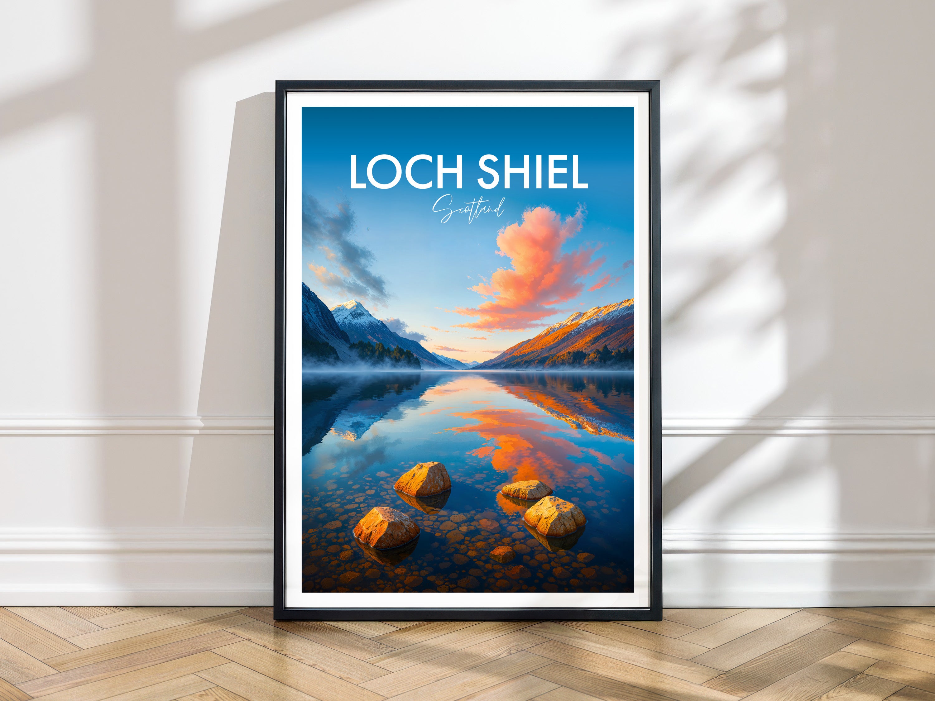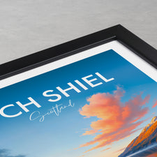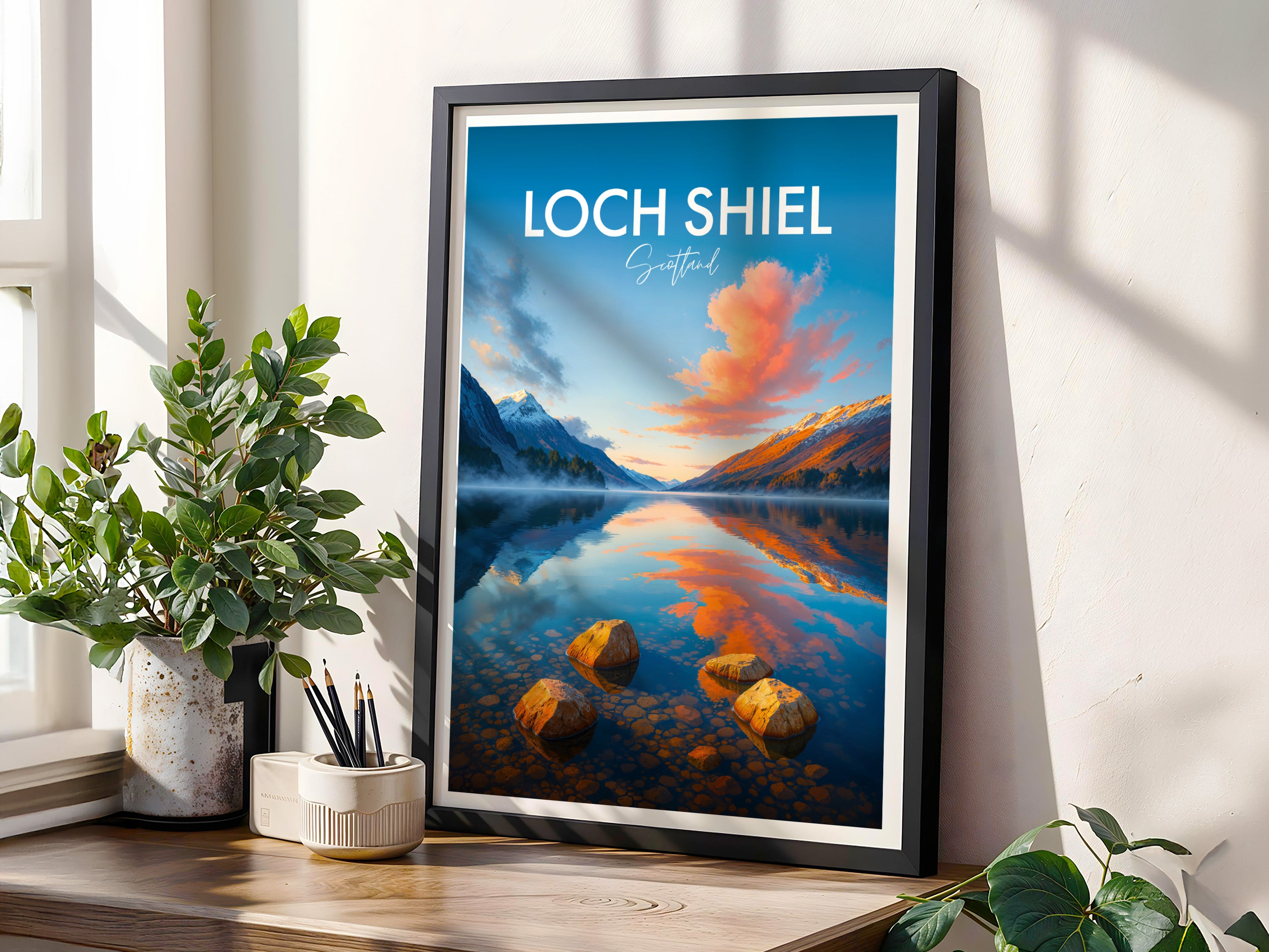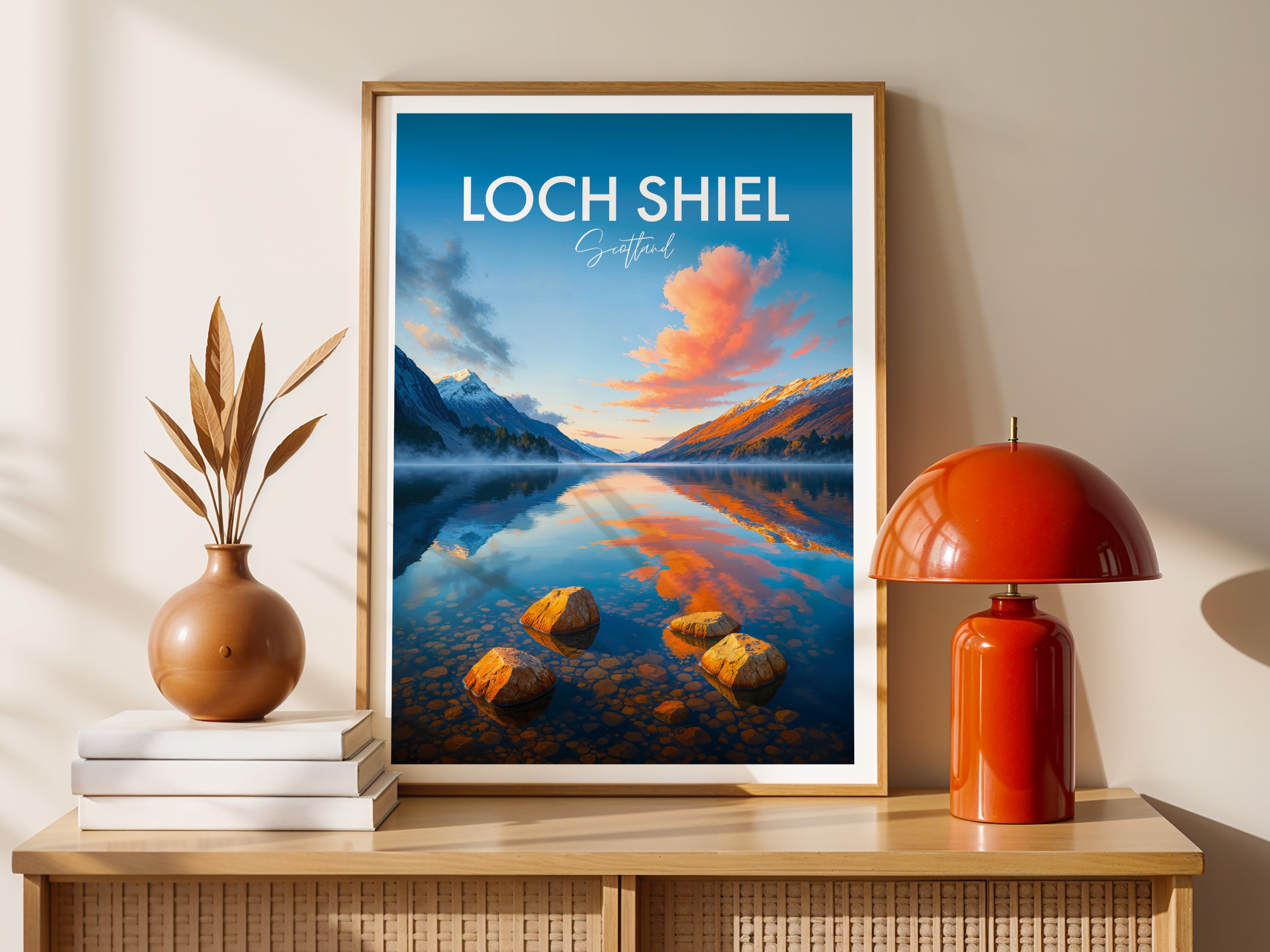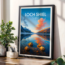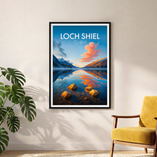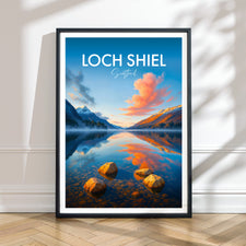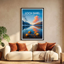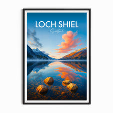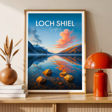 Capture the serene beauty of Loch Shiel with this picturesque travel poster. The illustrated print showcases the peaceful Scottish lake with stunning reflections and a vibrant sunset.
