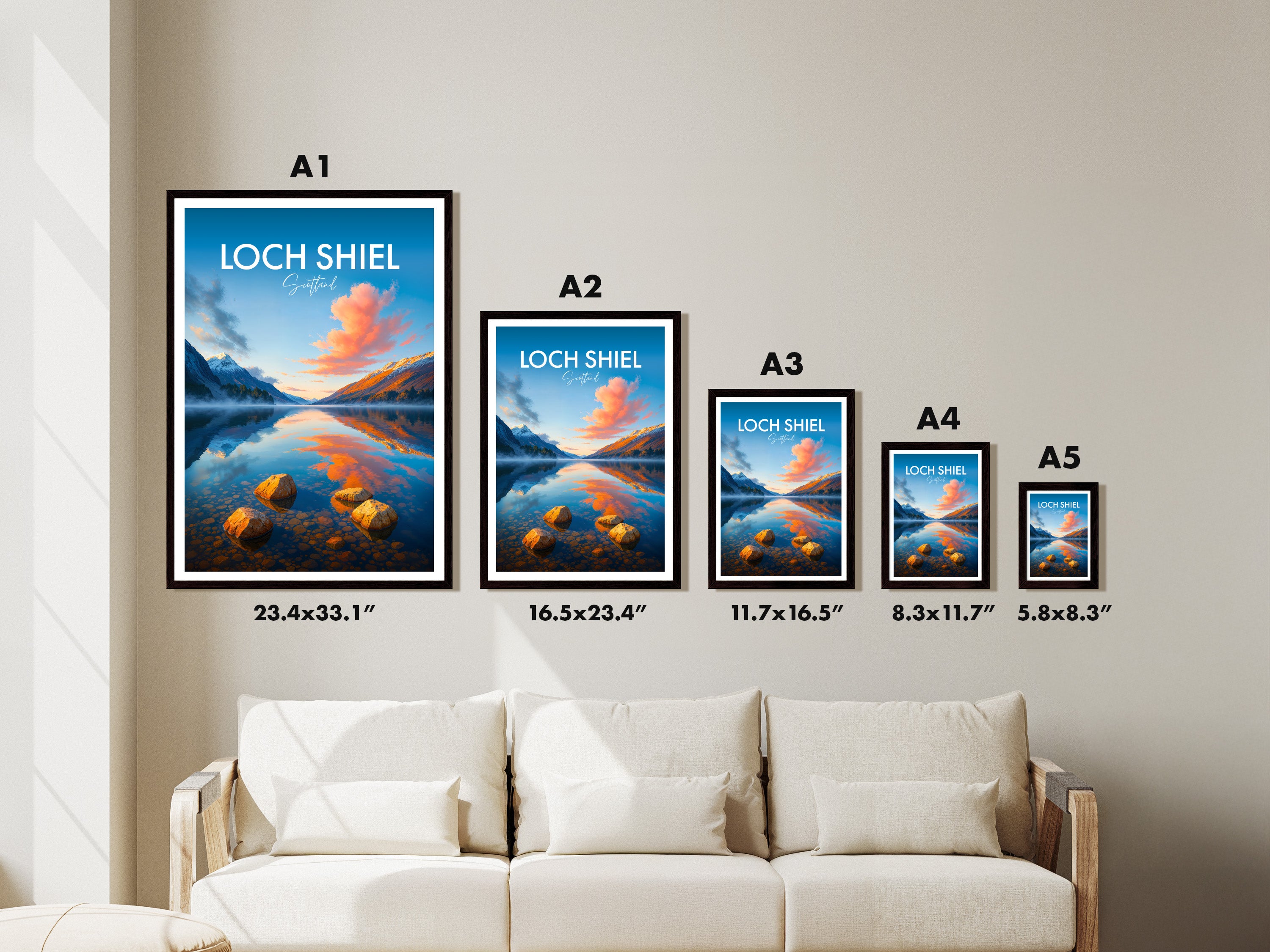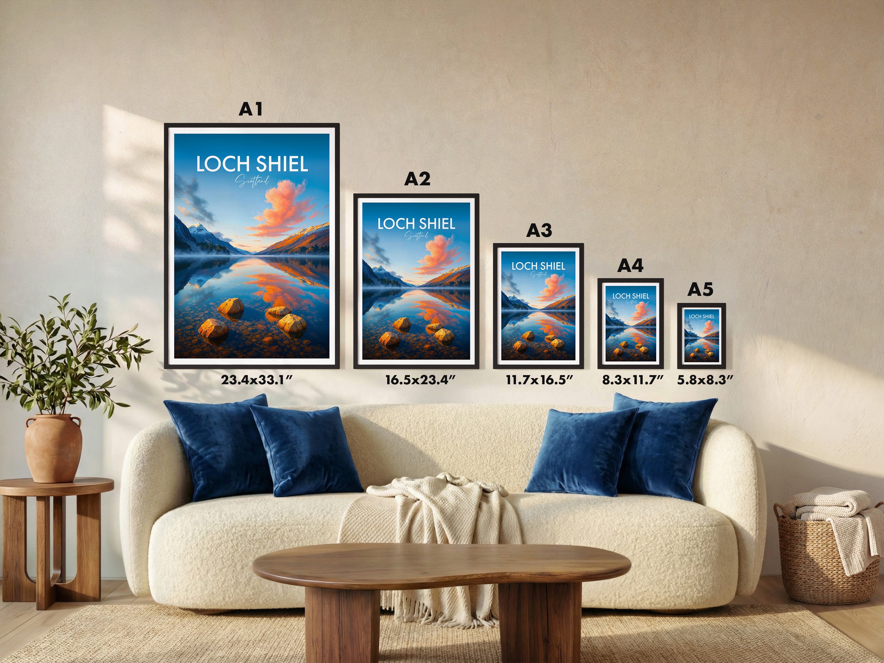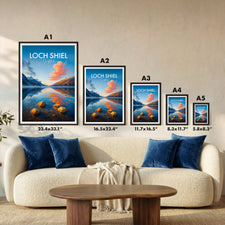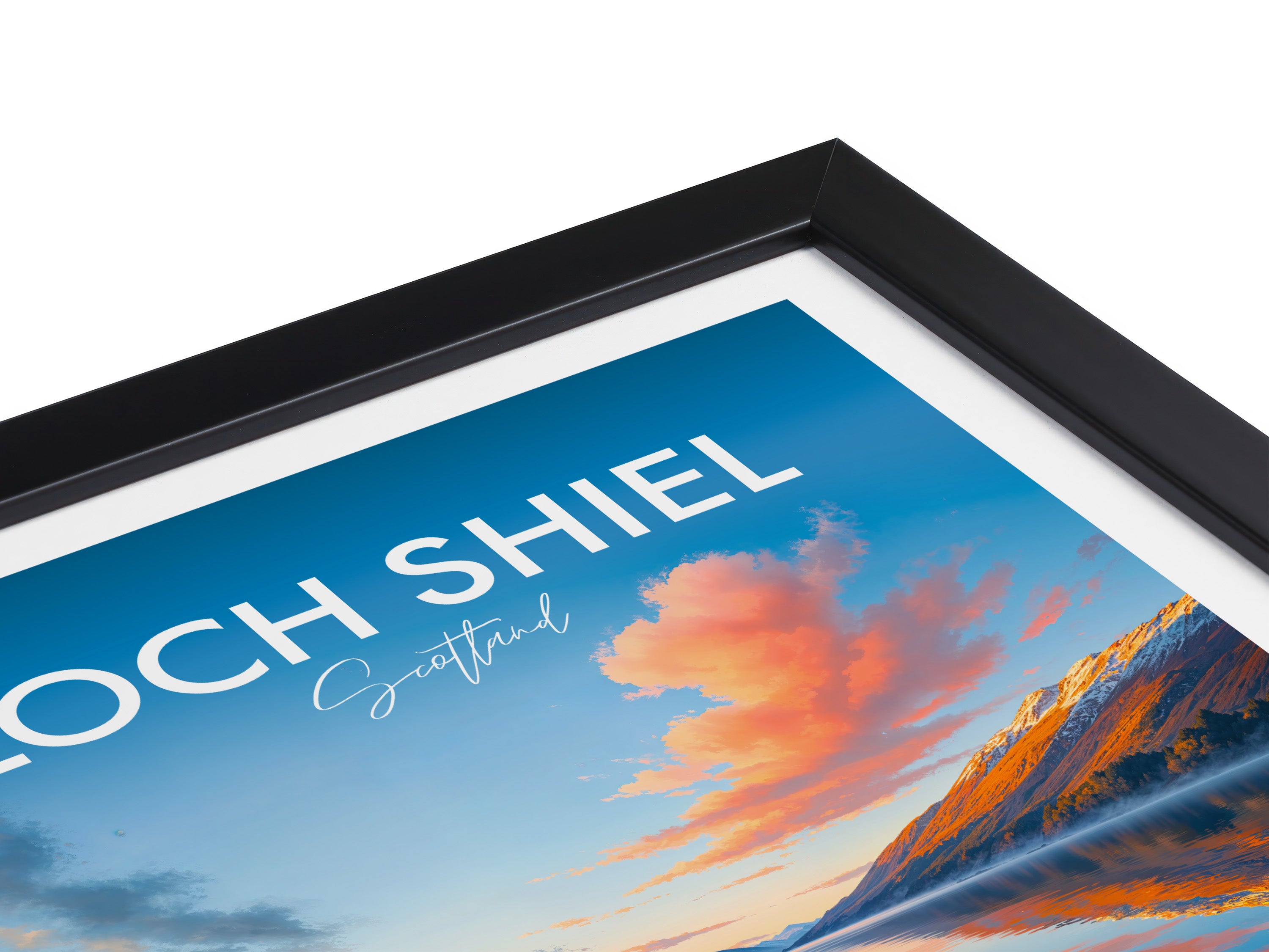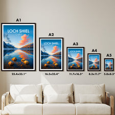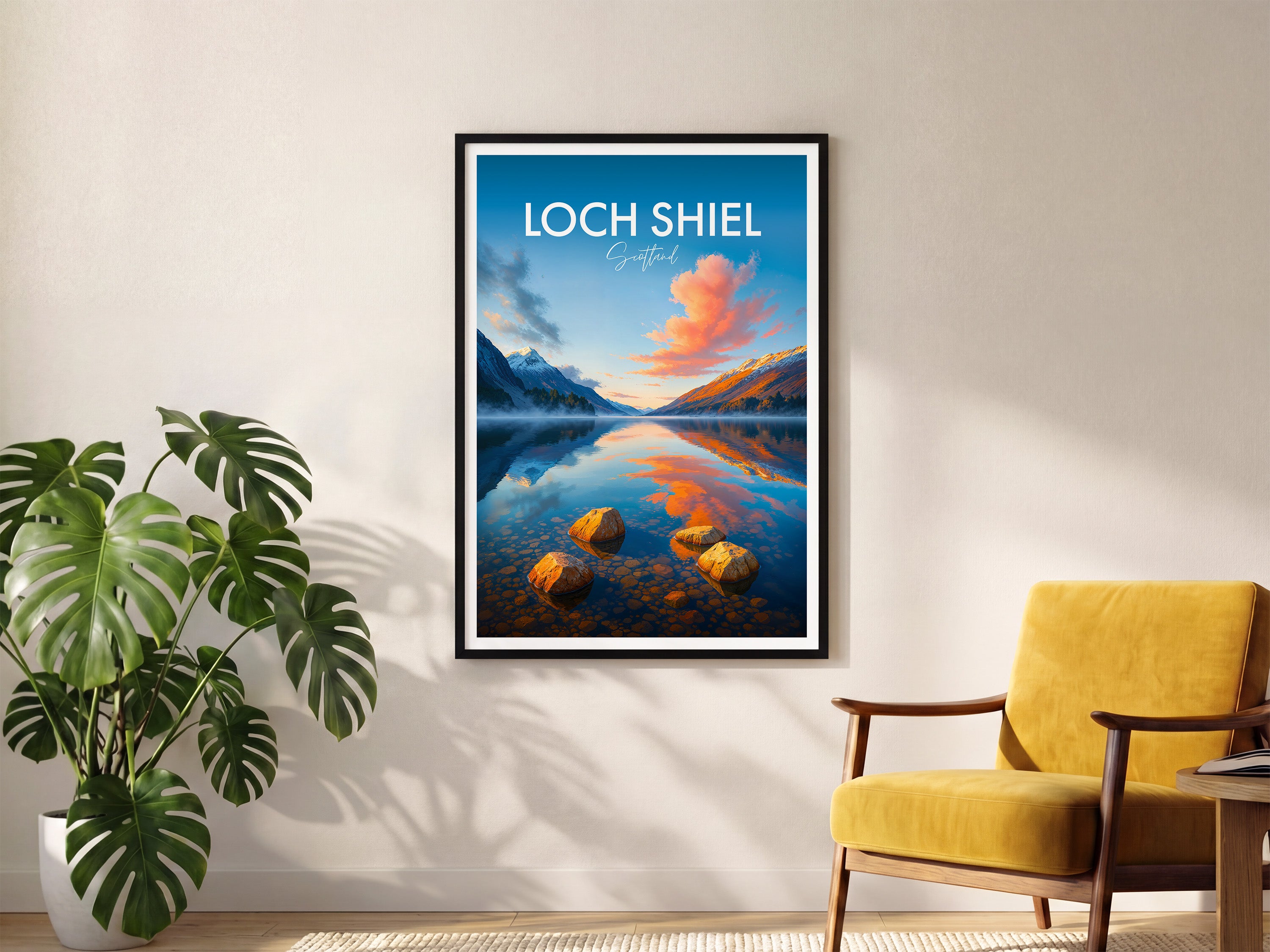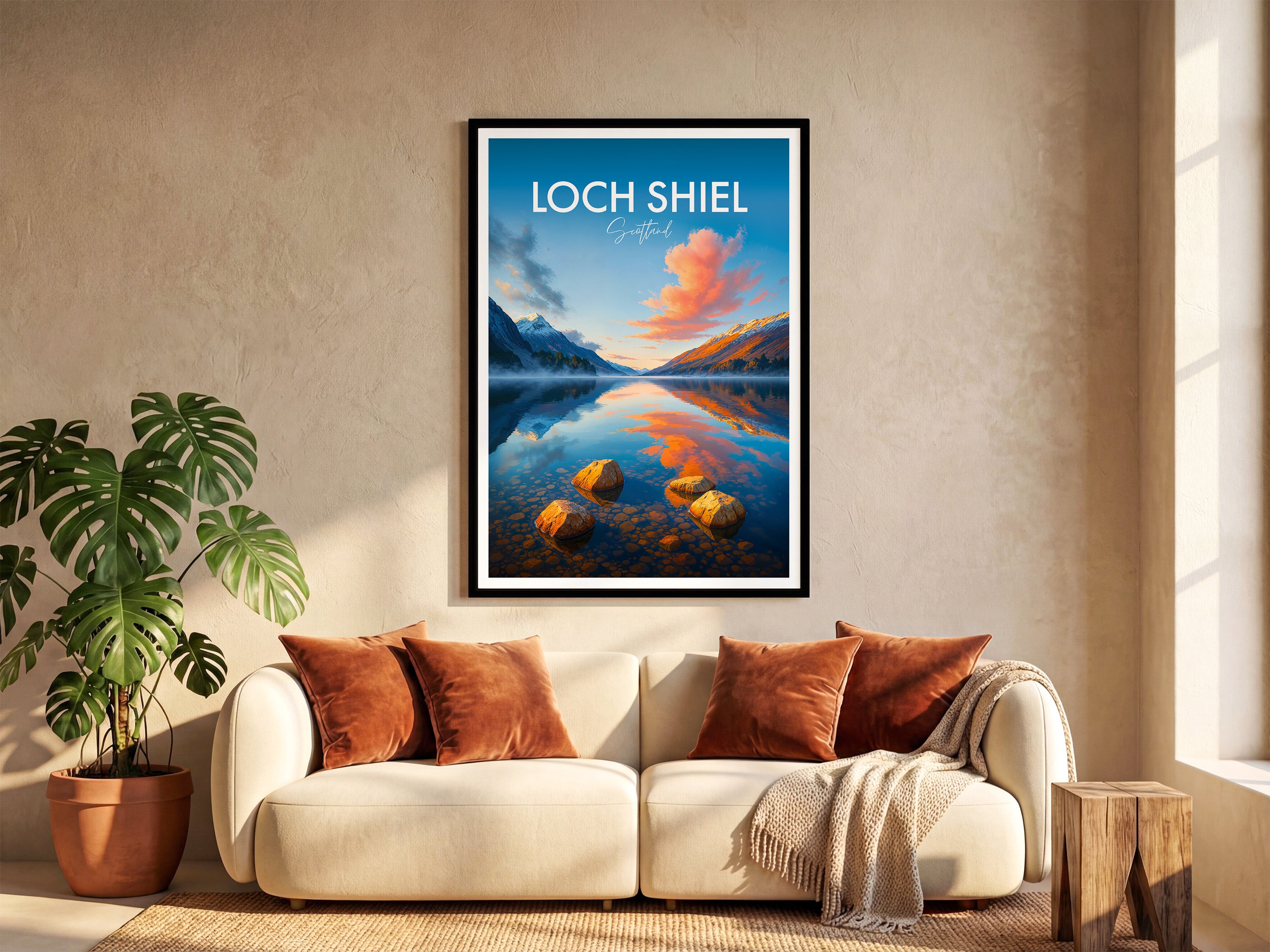 Capture the serene beauty of Loch Shiel with this picturesque travel poster. The illustrated print showcases the peaceful Scottish lake with stunning reflections and a vibrant sunset.