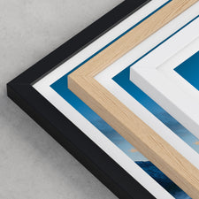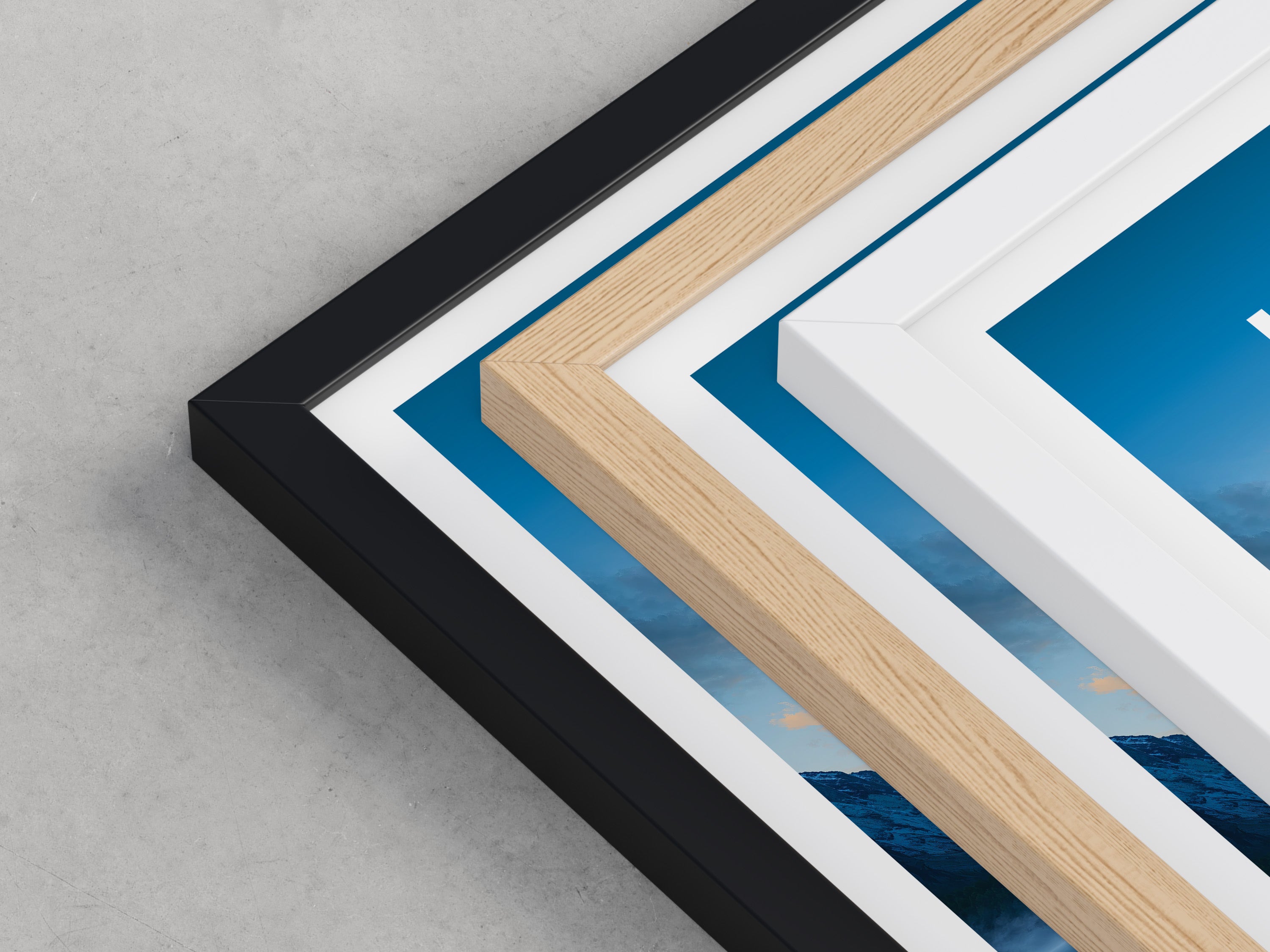 Framed options use sustainably sourced wooden frames in black, white, or natural wood, ready to hang.