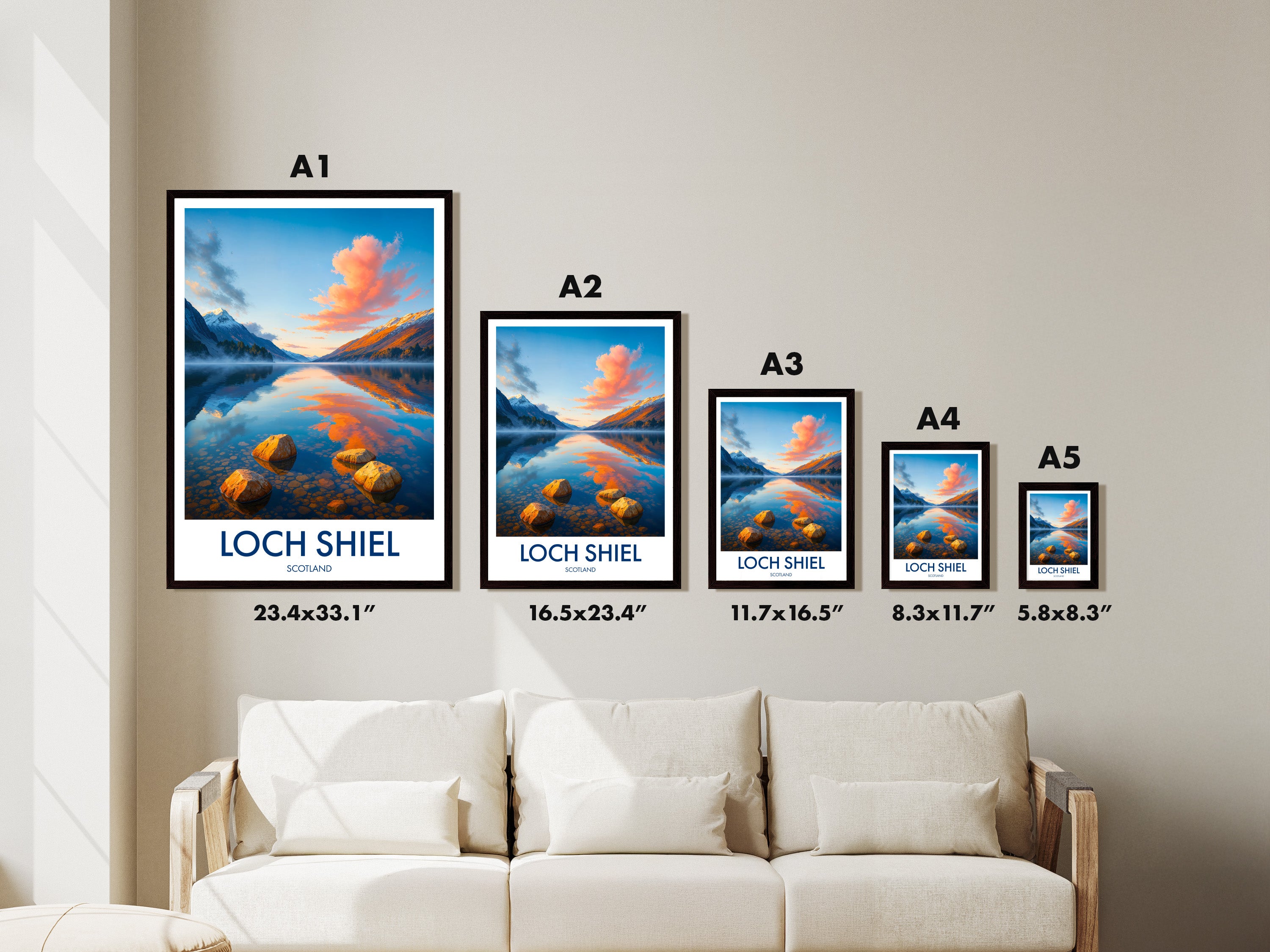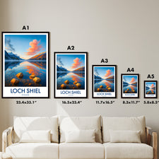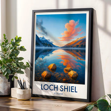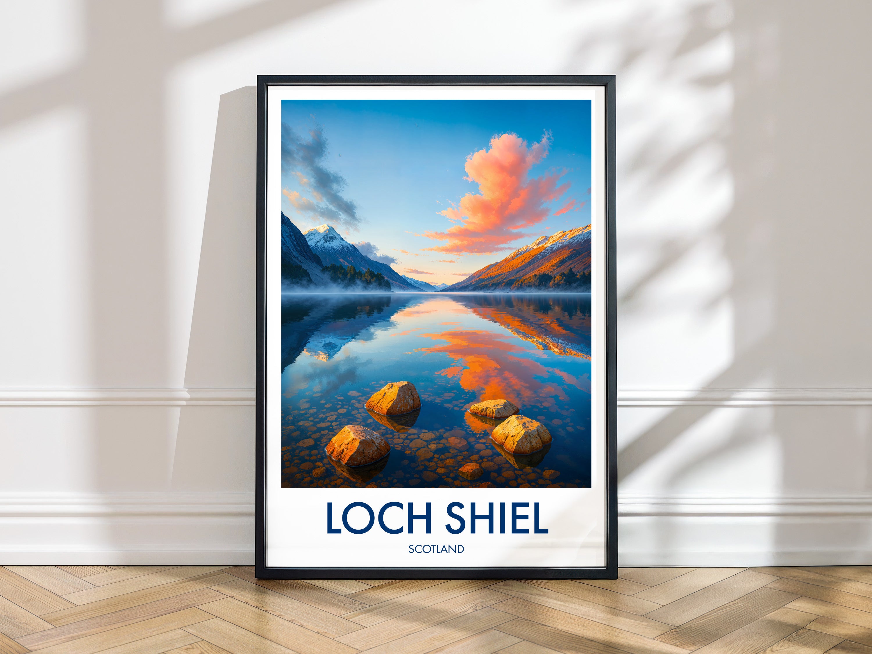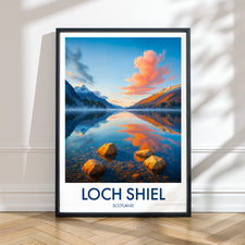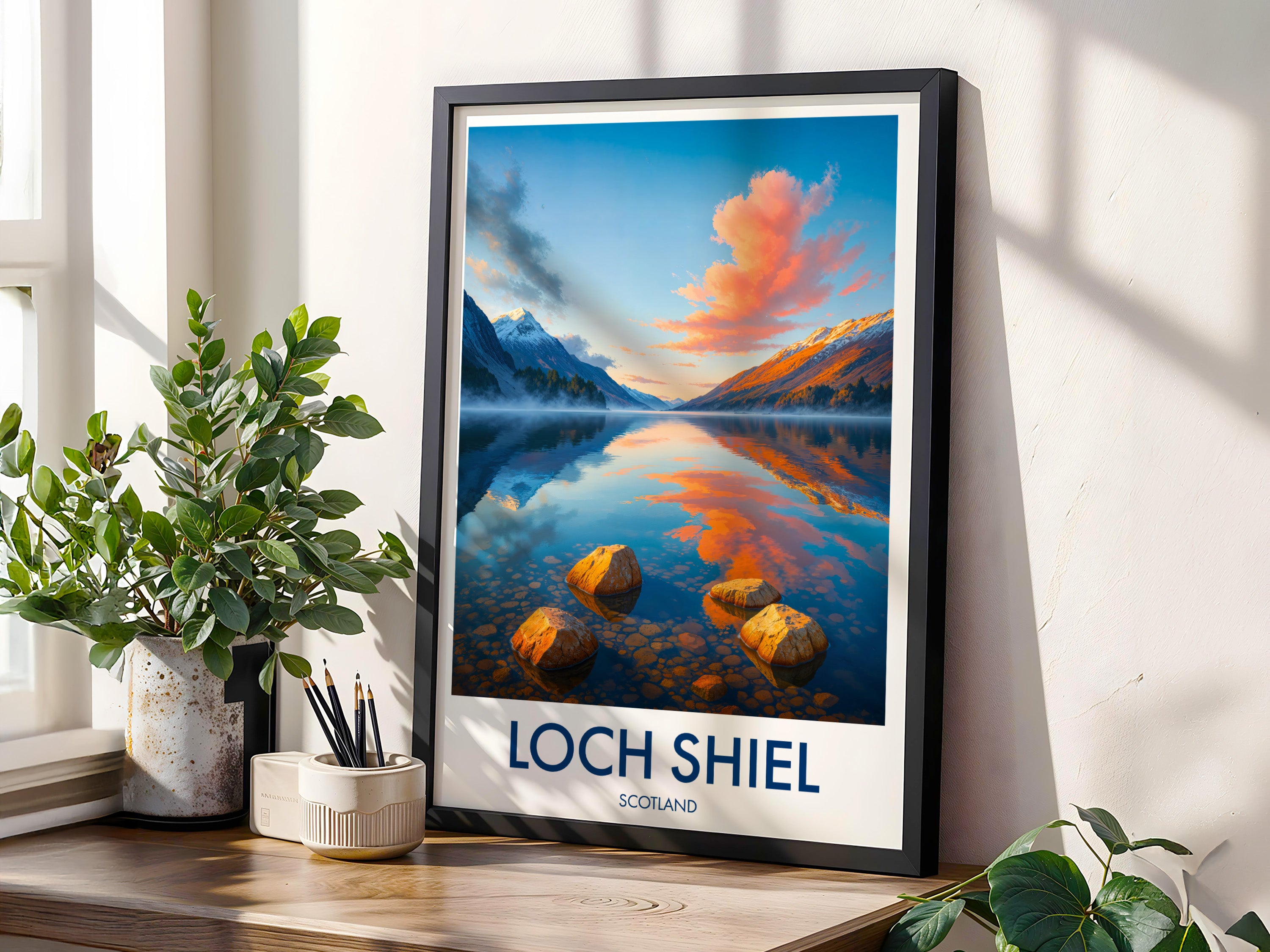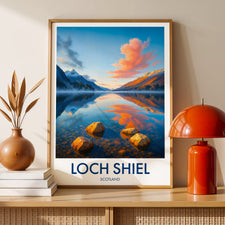Capture the serene beauty of Loch Shiel with this picturesque travel poster. The illustrated print showcases the peaceful Scottish lake with stunning reflections and a vibrant sunset.