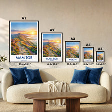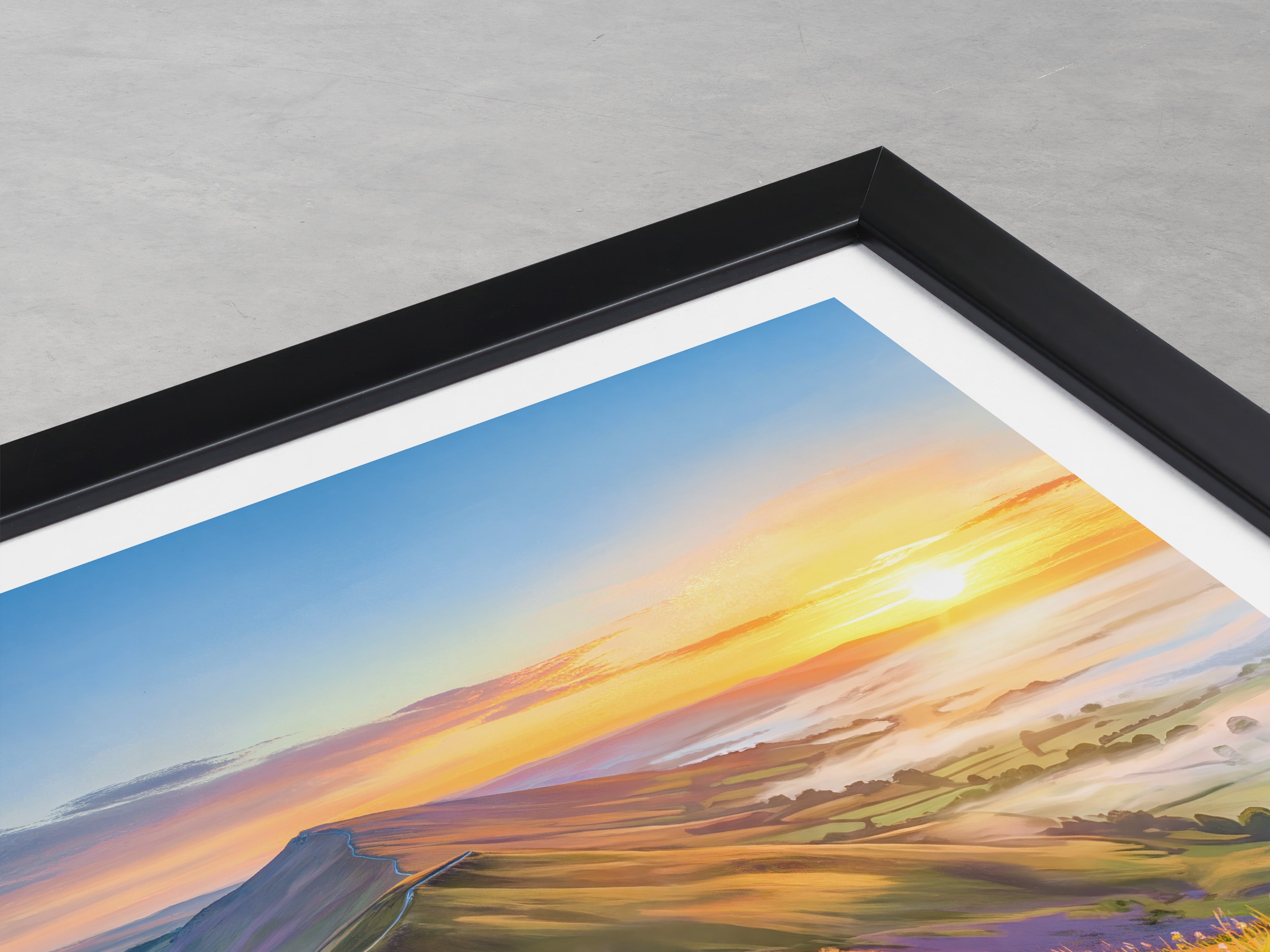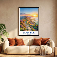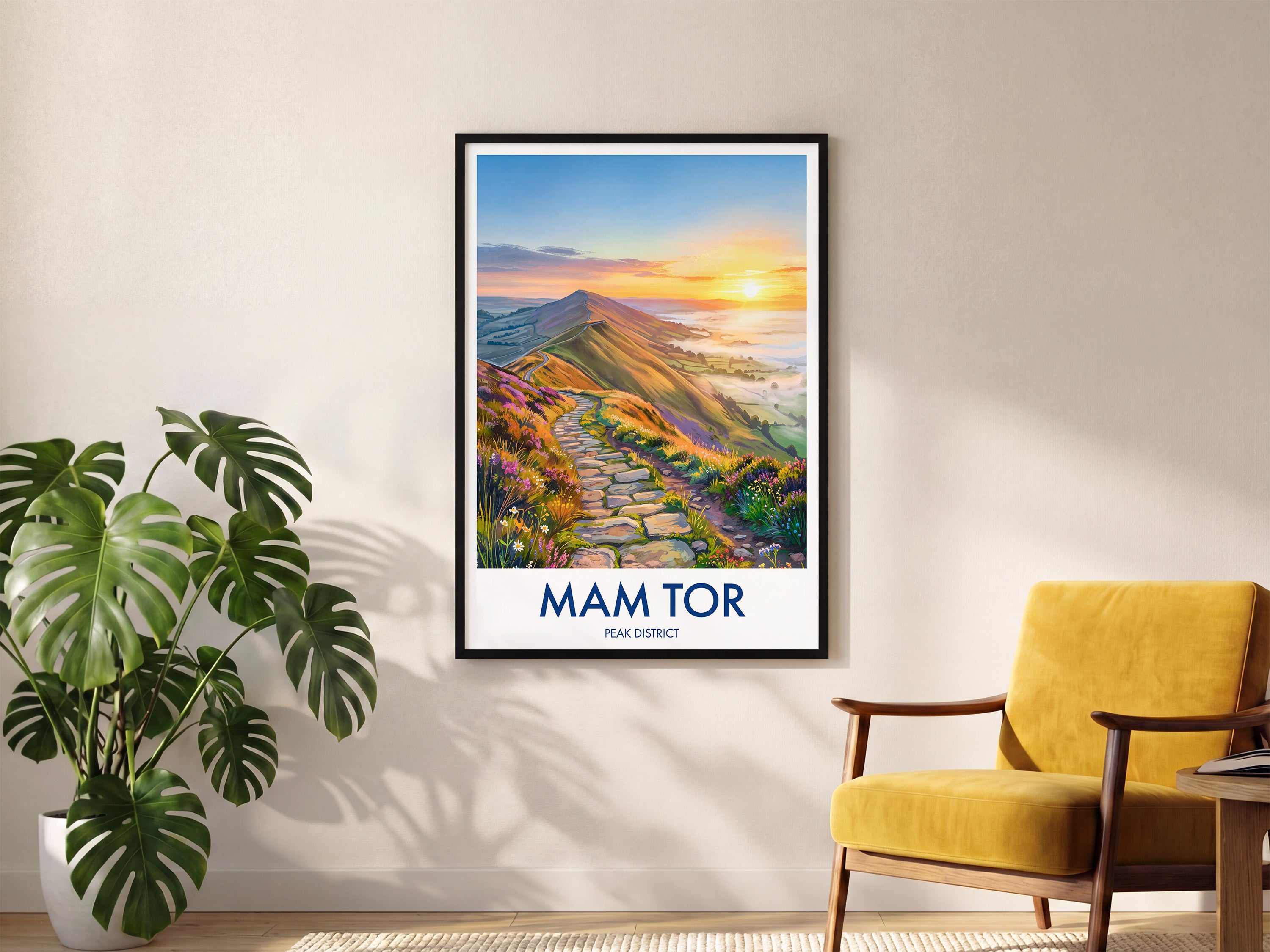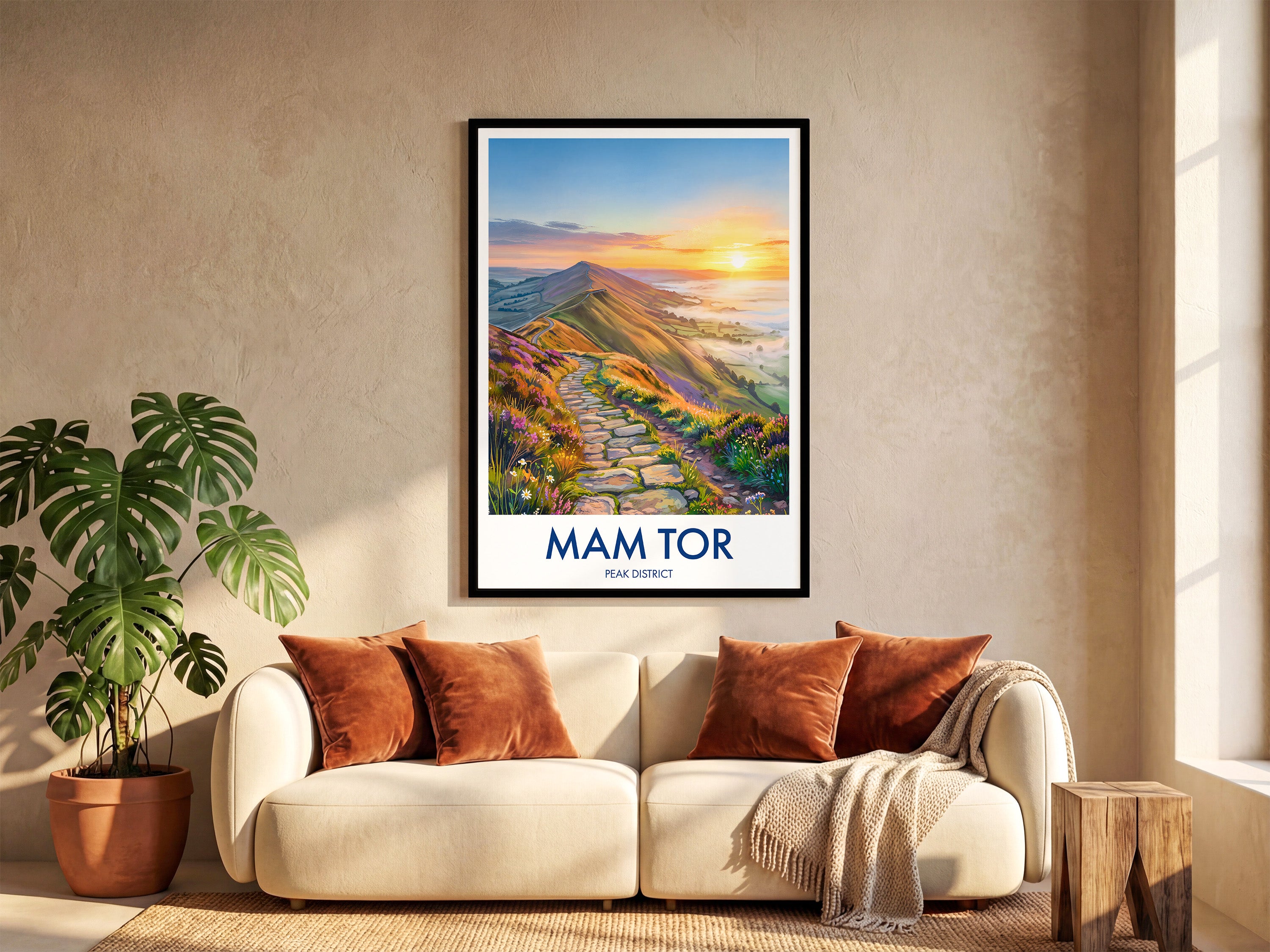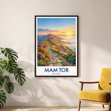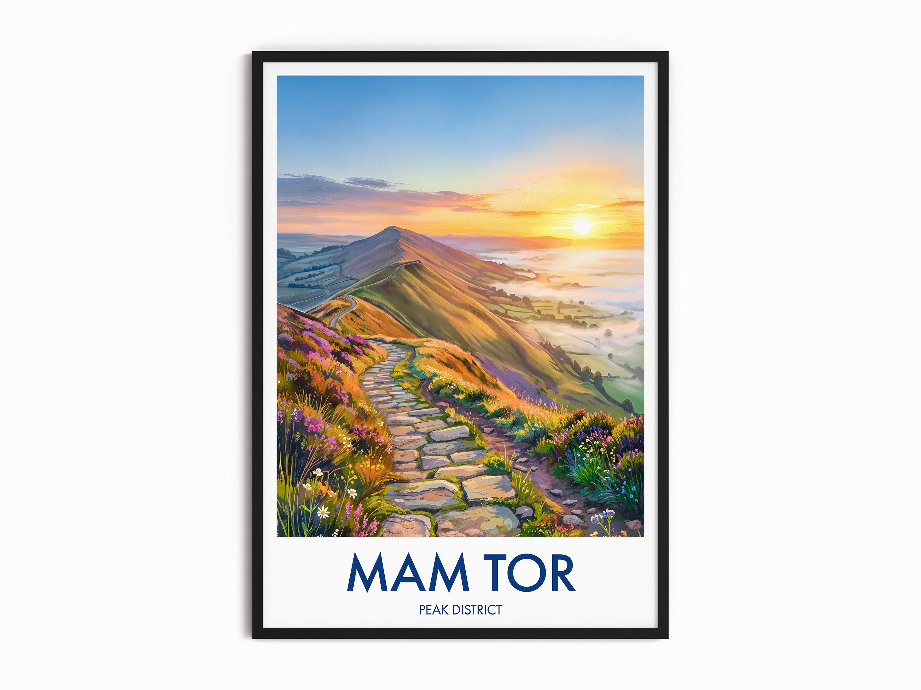 Bring the beauty of the Peak District home with this Mam Tor art print. Featuring stunning detail of Mam Tor's iconic walking path, The Great Ridge, and surrounding rolling hills, this travel poster captures the heart of the British countryside for nature lovers, UK wall art collectors, and perfect gifting. Ideal for home or office decor.