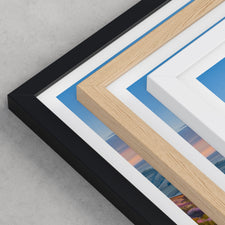 Framed options use sustainably sourced wooden frames in black, white, or natural wood, ready to hang.