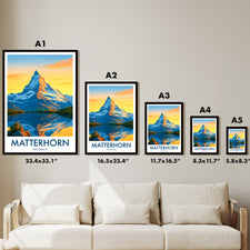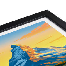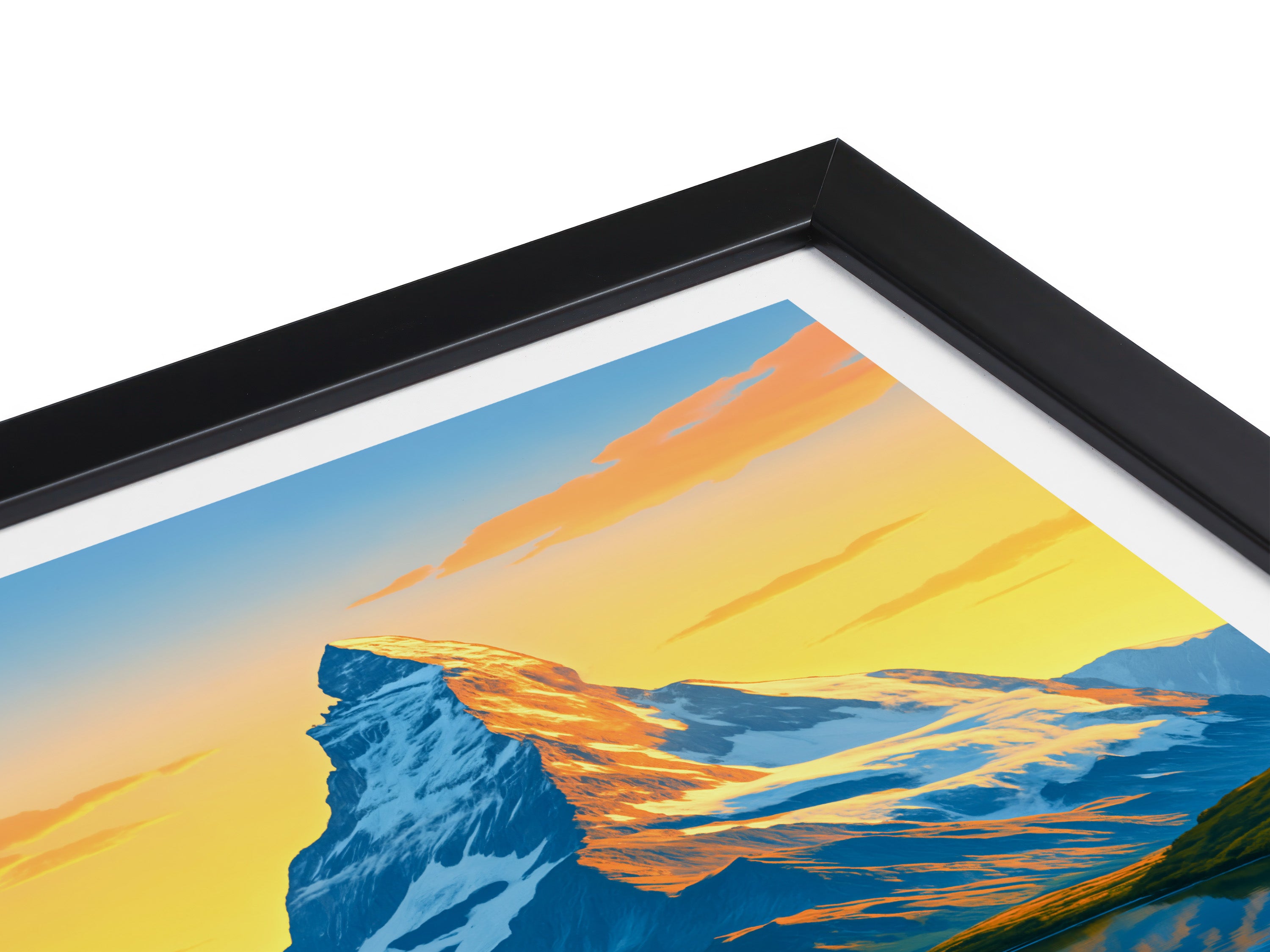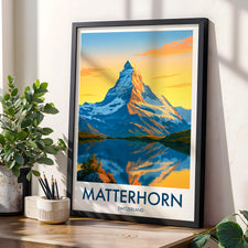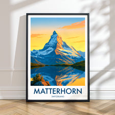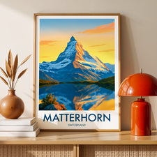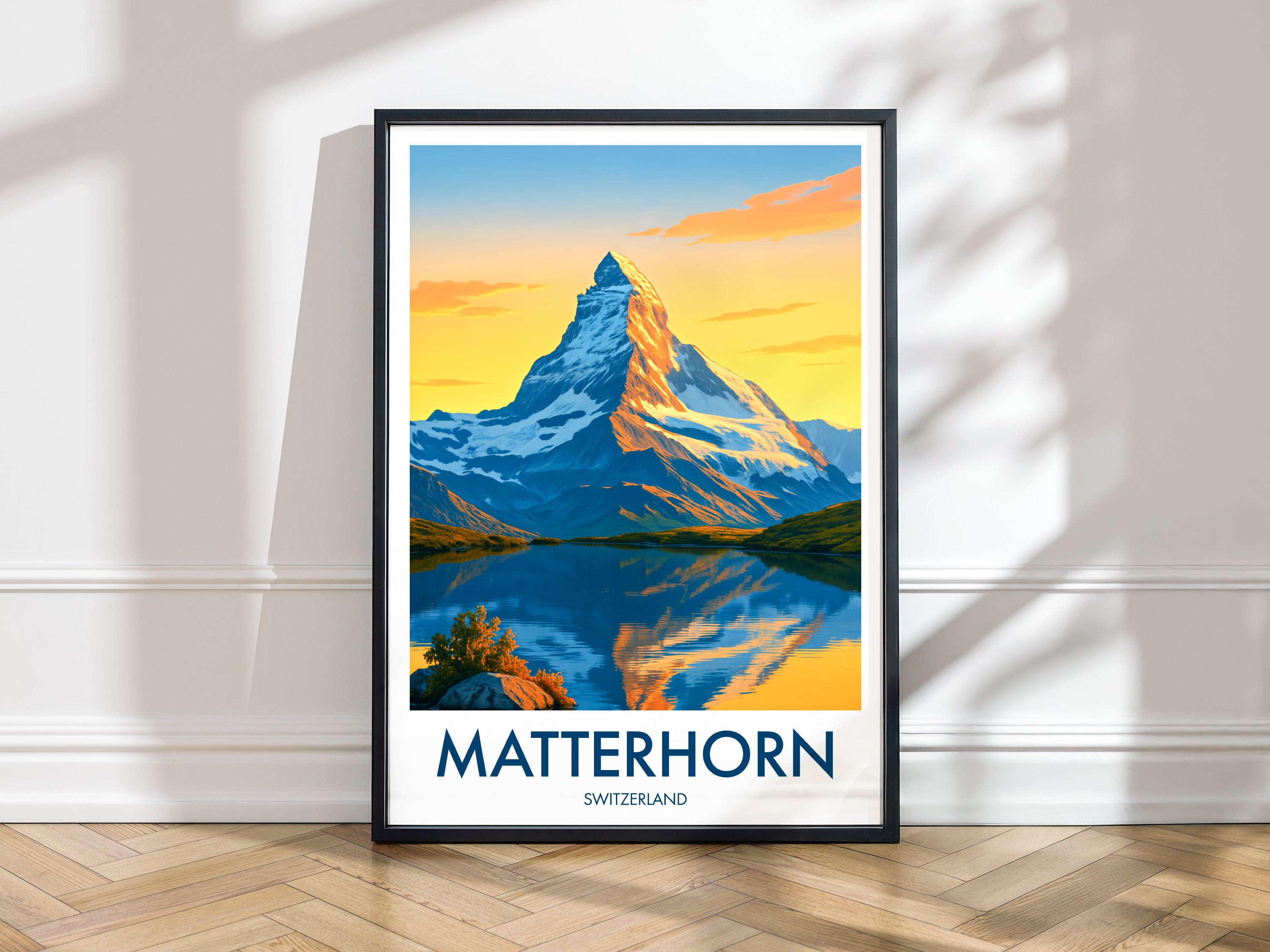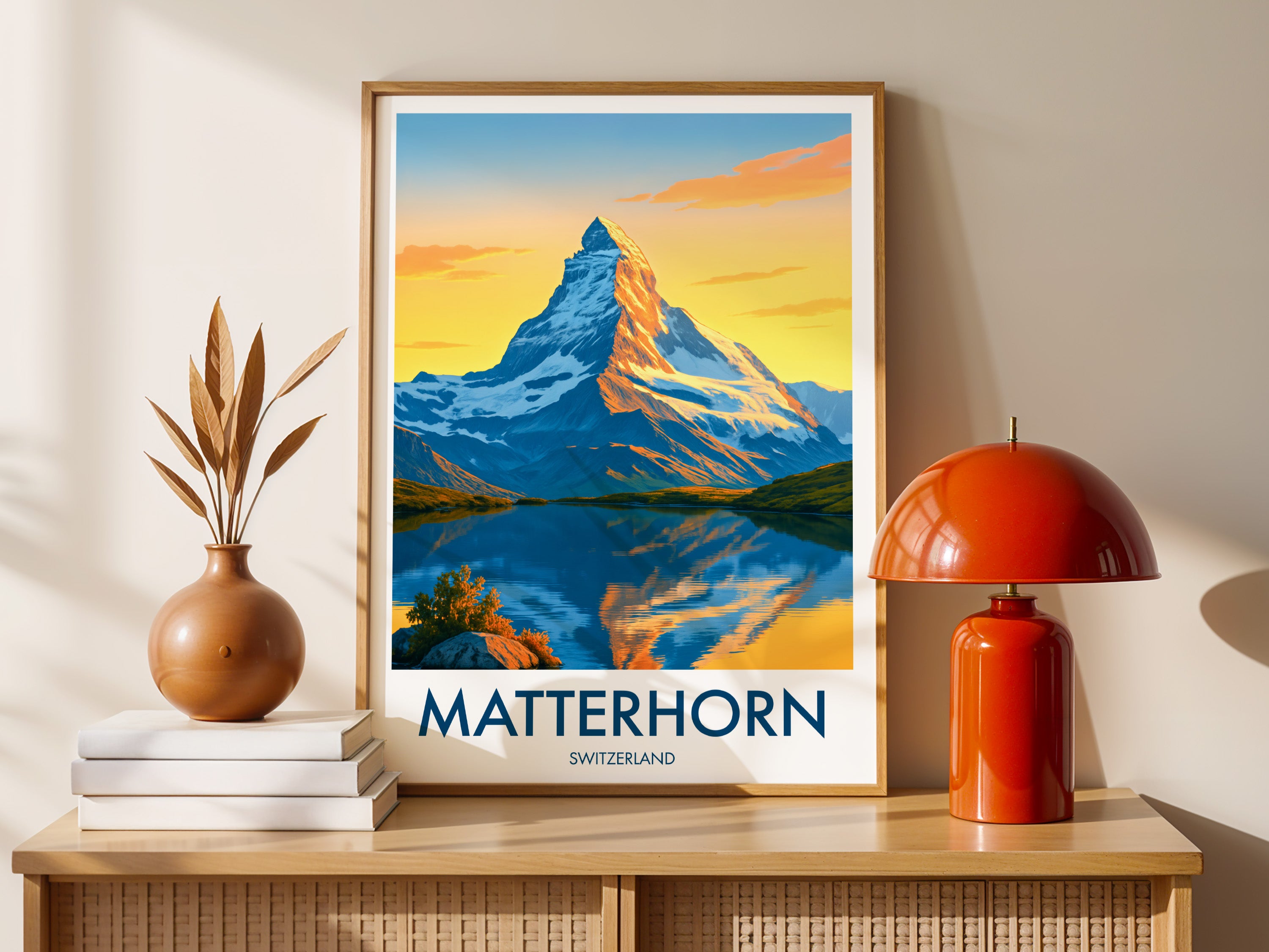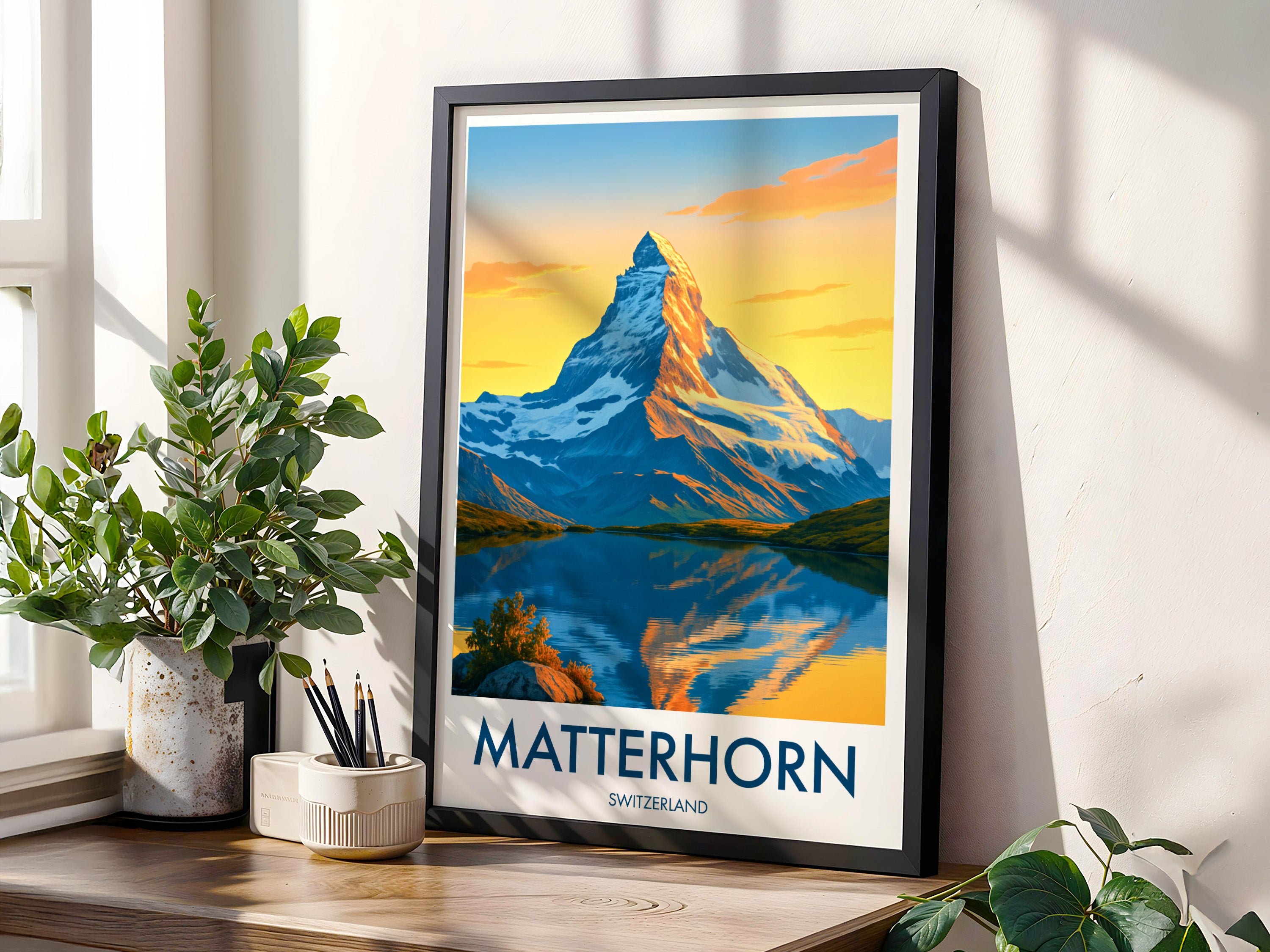 The Matterhorn glows in golden evening light, mirrored perfectly in alpine waters. This illustrated print captures Switzerland’s most famous mountain at its most breathtaking hour.