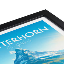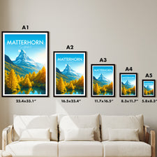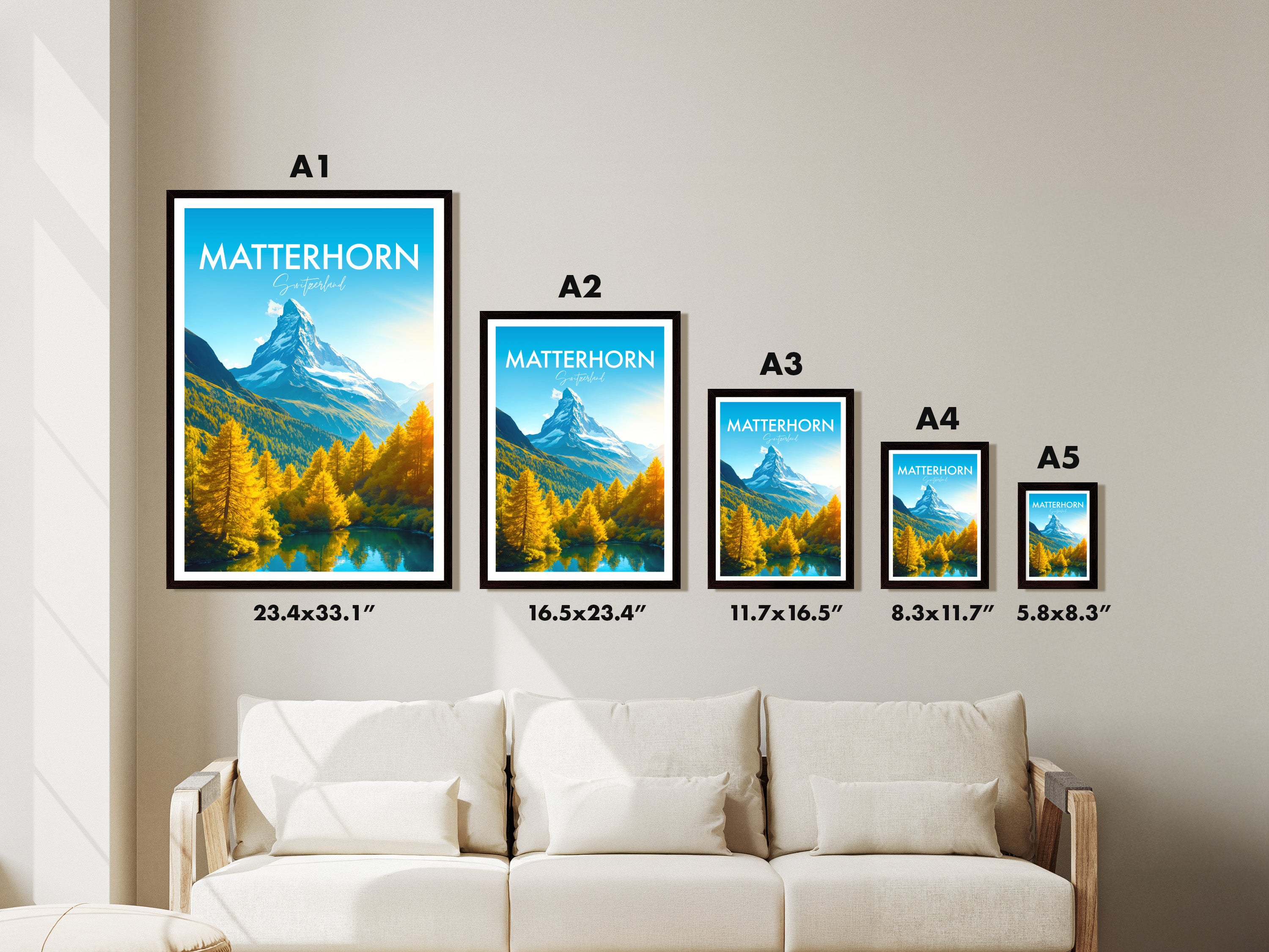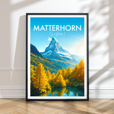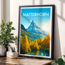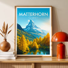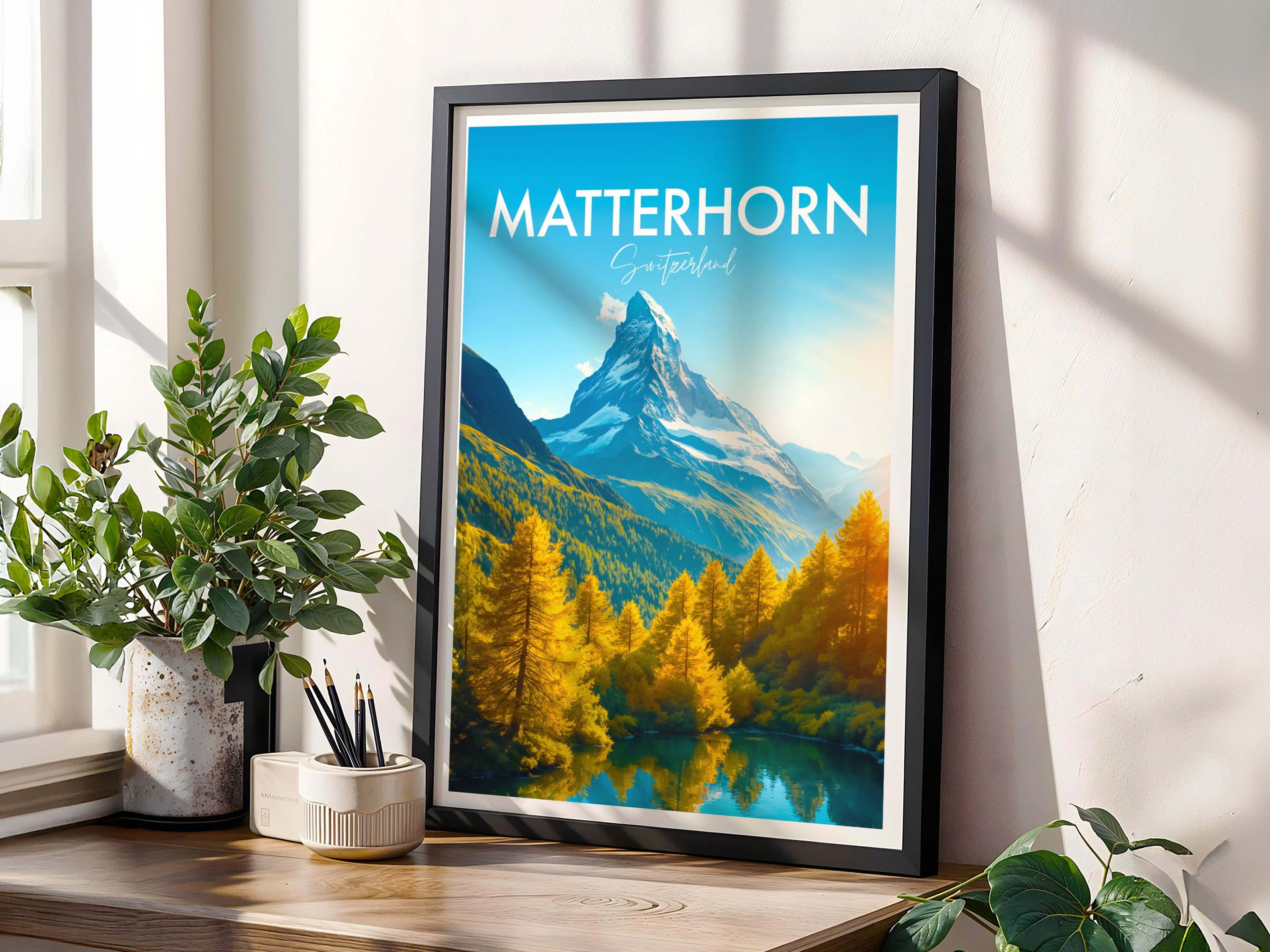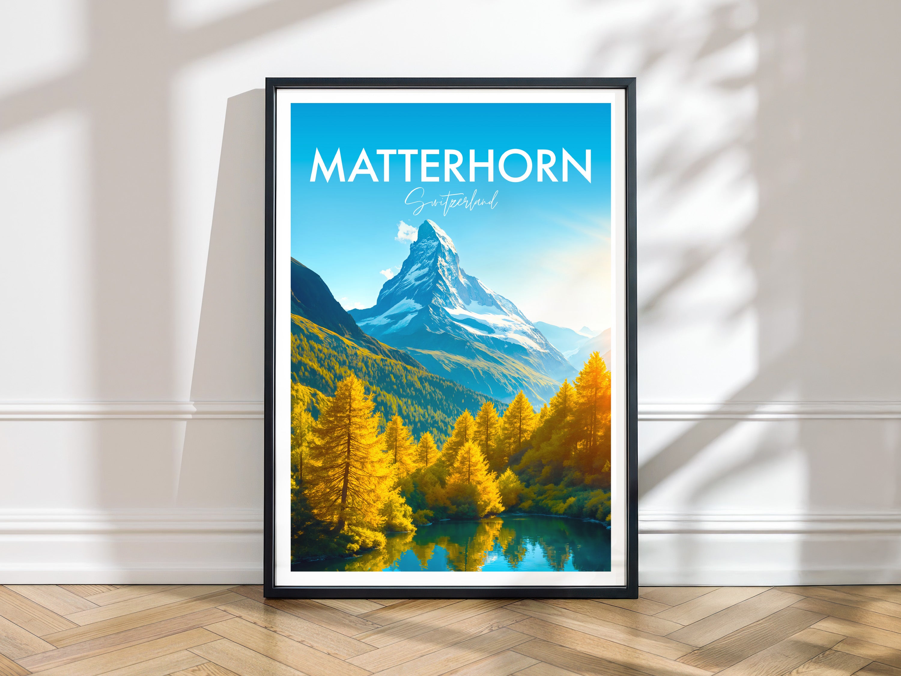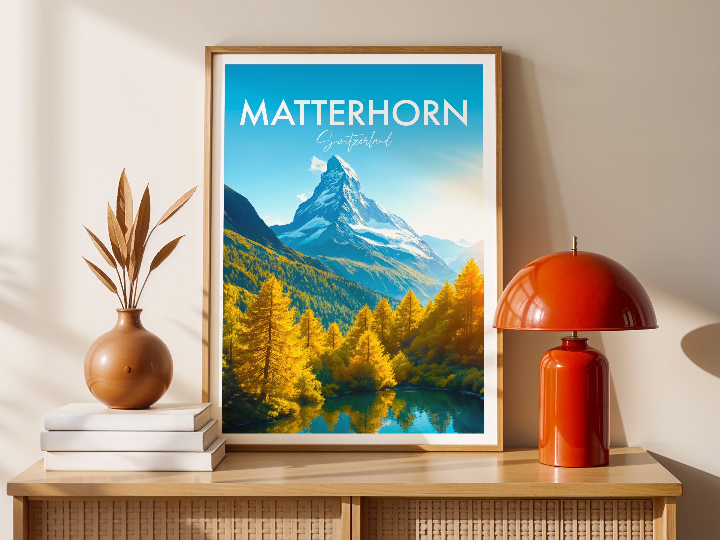 The Matterhorn’s sharp peak rises above alpine forests and reflective lakes in this illustrated print, celebrating one of Switzerland’s most iconic and awe-inspiring mountains.