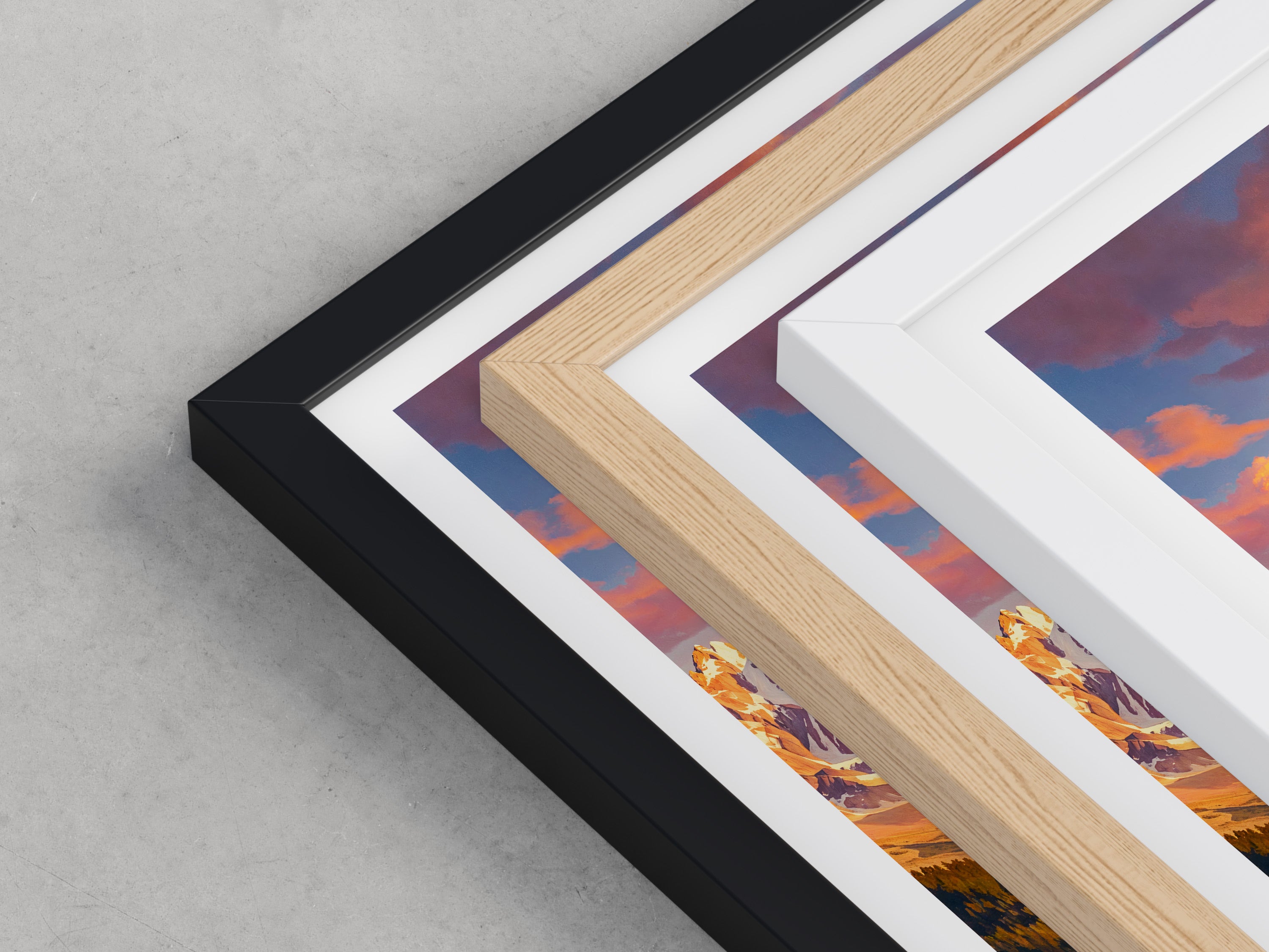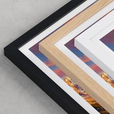 Framed options use sustainably sourced wooden frames in black, white, or natural wood, ready to hang.