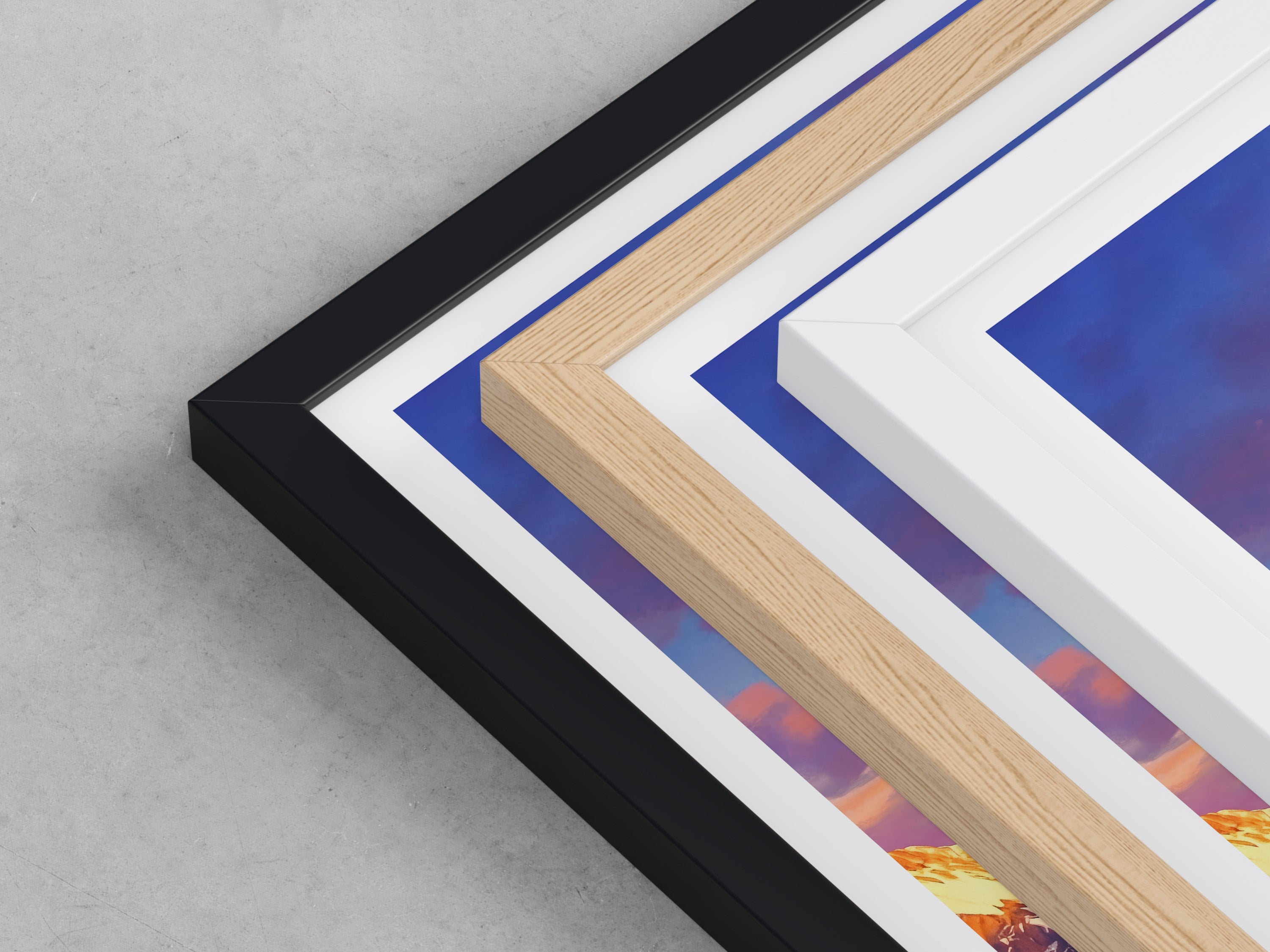 Framed options use sustainably sourced wooden frames in black, white, or natural wood, ready to hang.