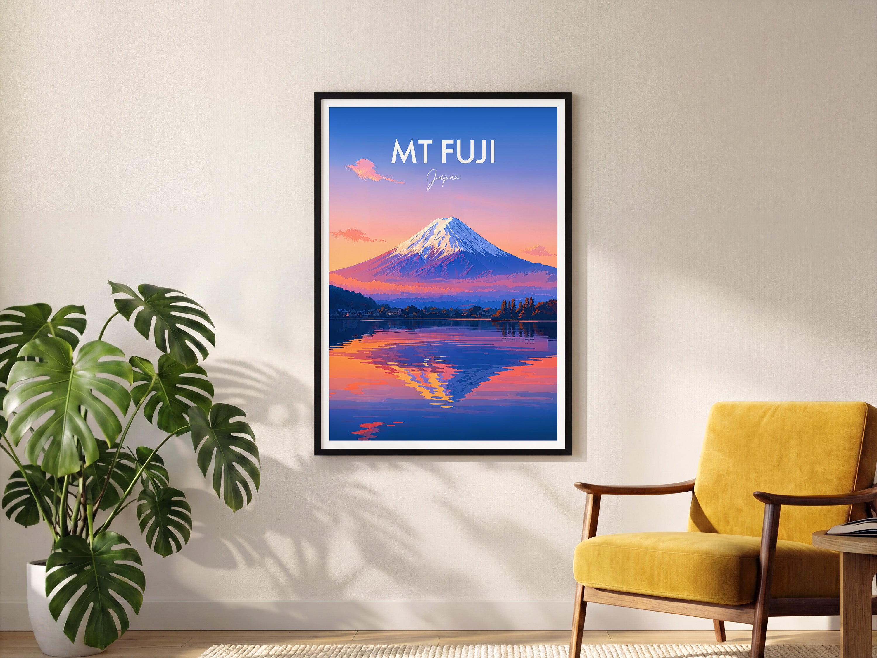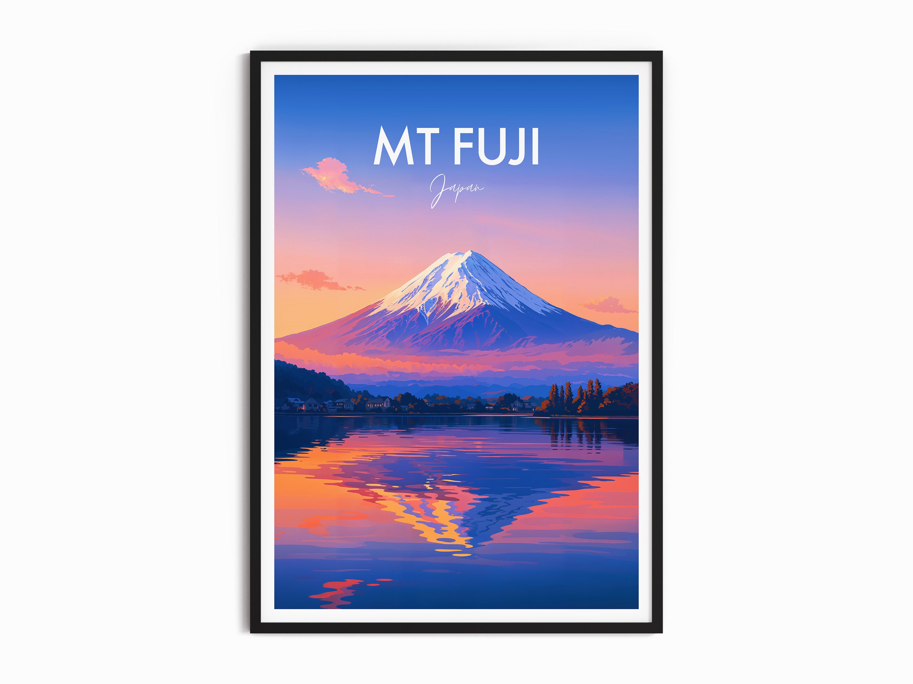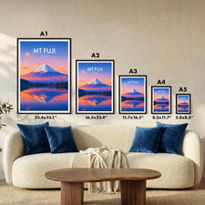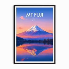Capture the serene beauty of Mt Fuji at dusk with this illustrated travel poster. The vibrant hues reflect on the lake, offering a peaceful yet captivating scene from Japan's iconic landmark.