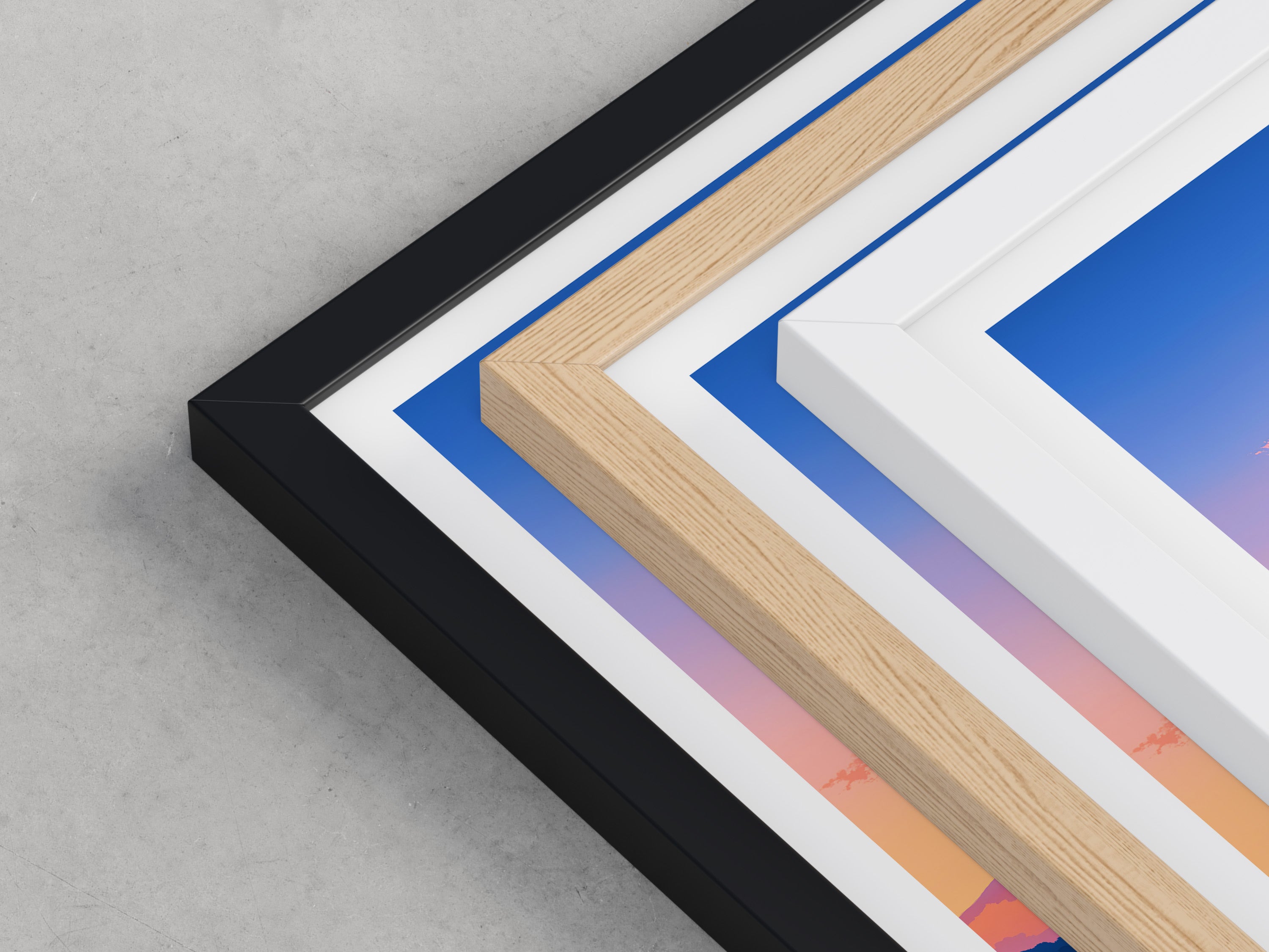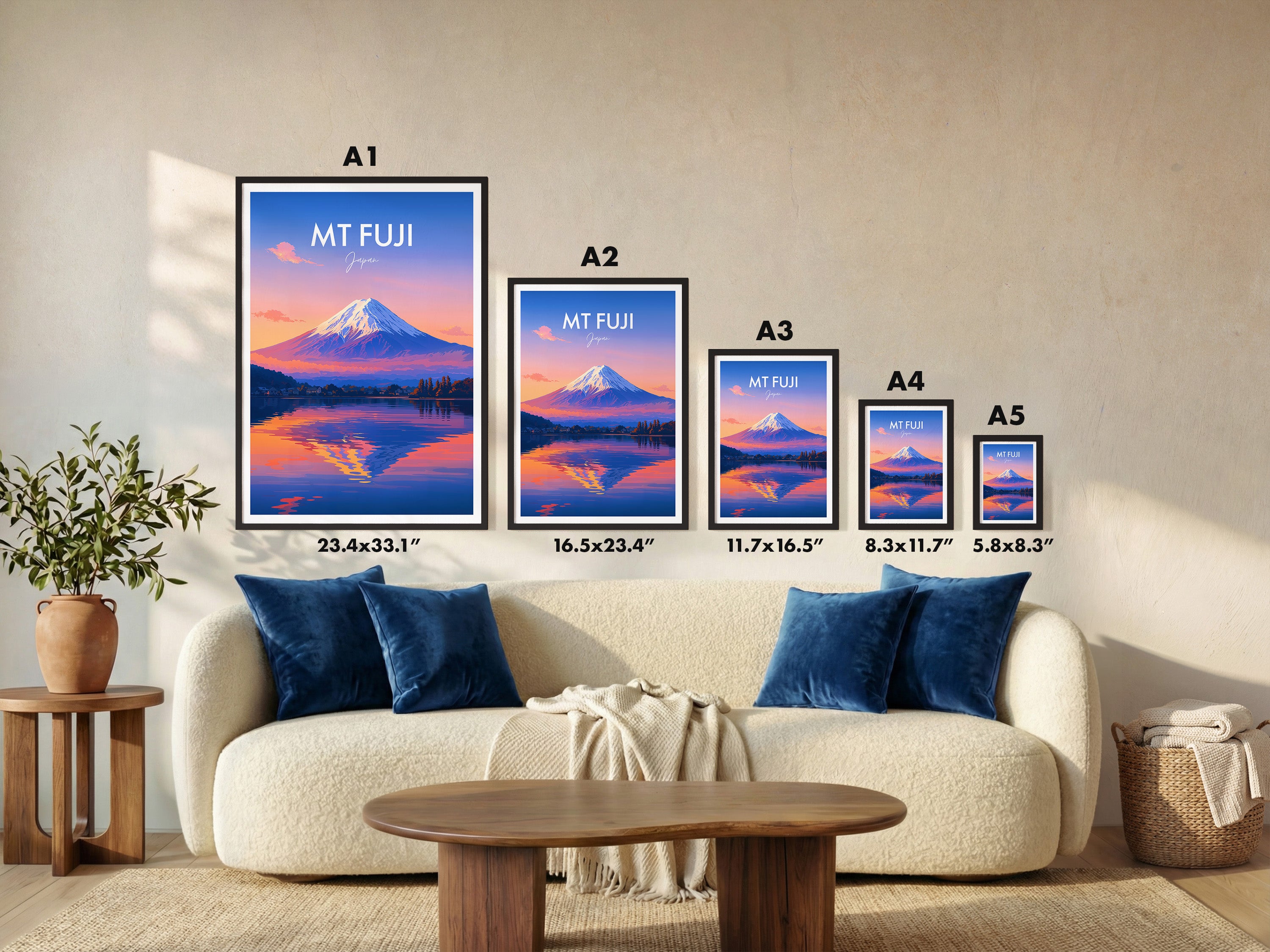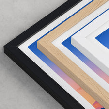 Framed options use sustainably sourced wooden frames in black, white, or natural wood, ready to hang.