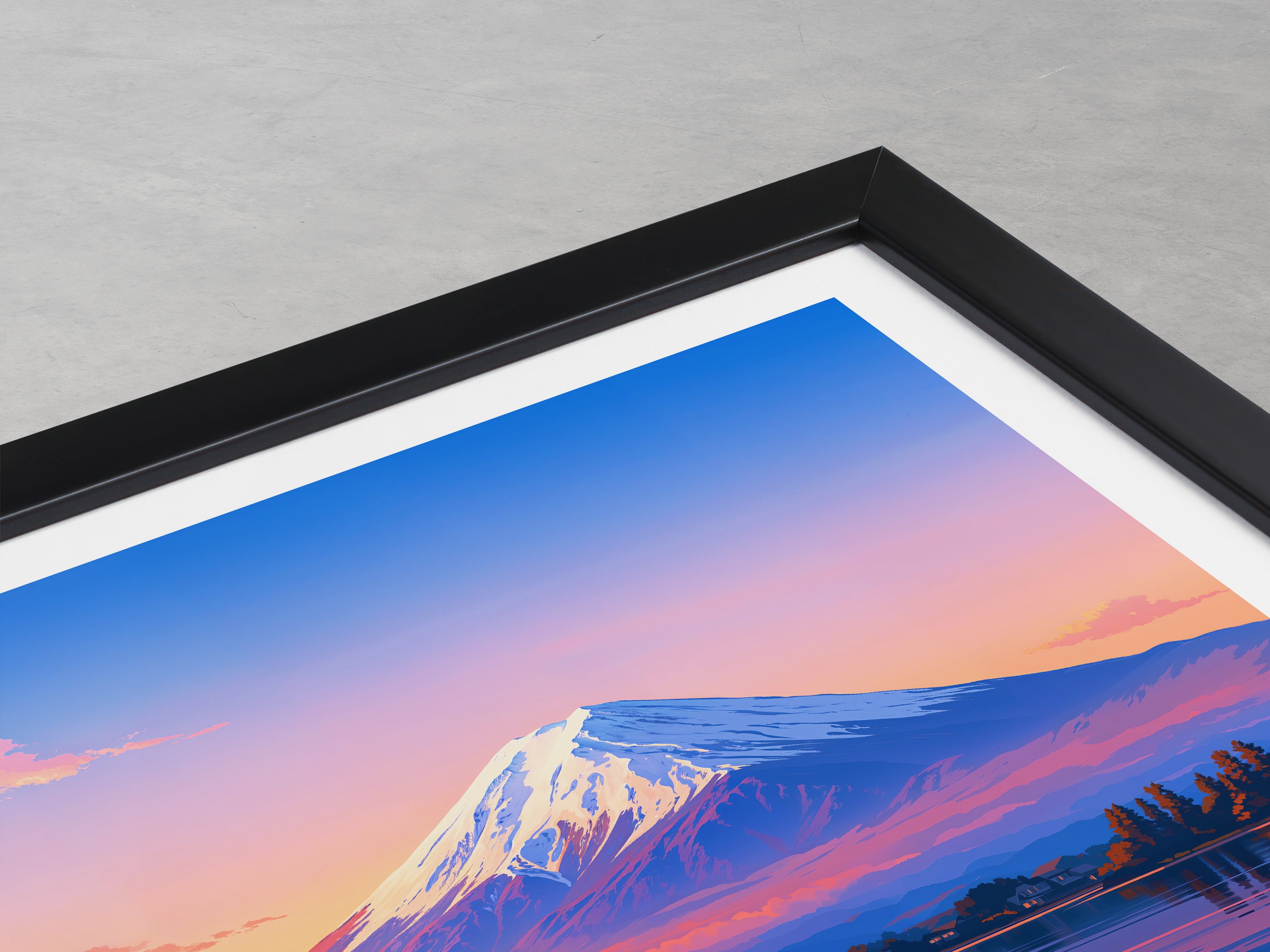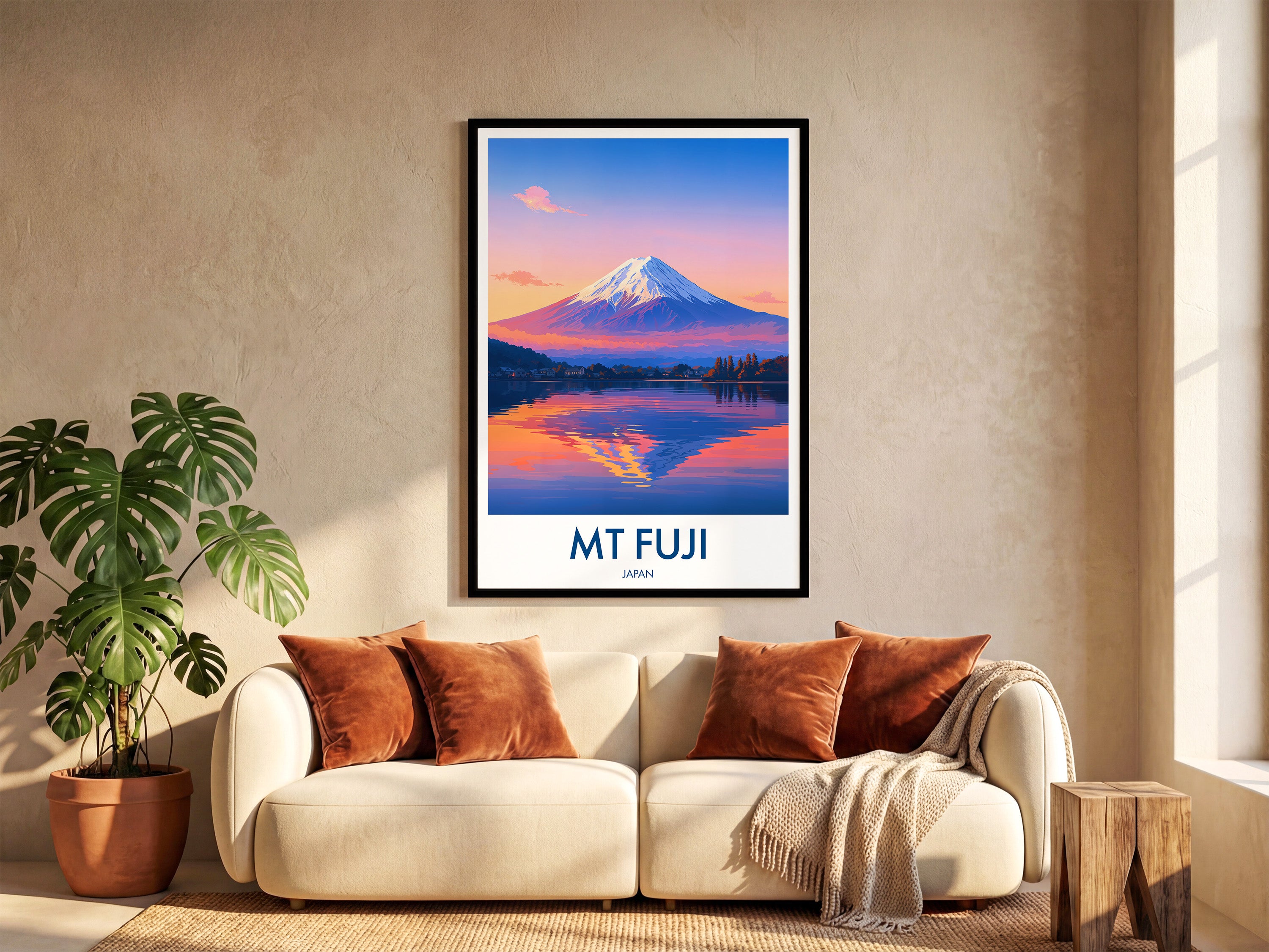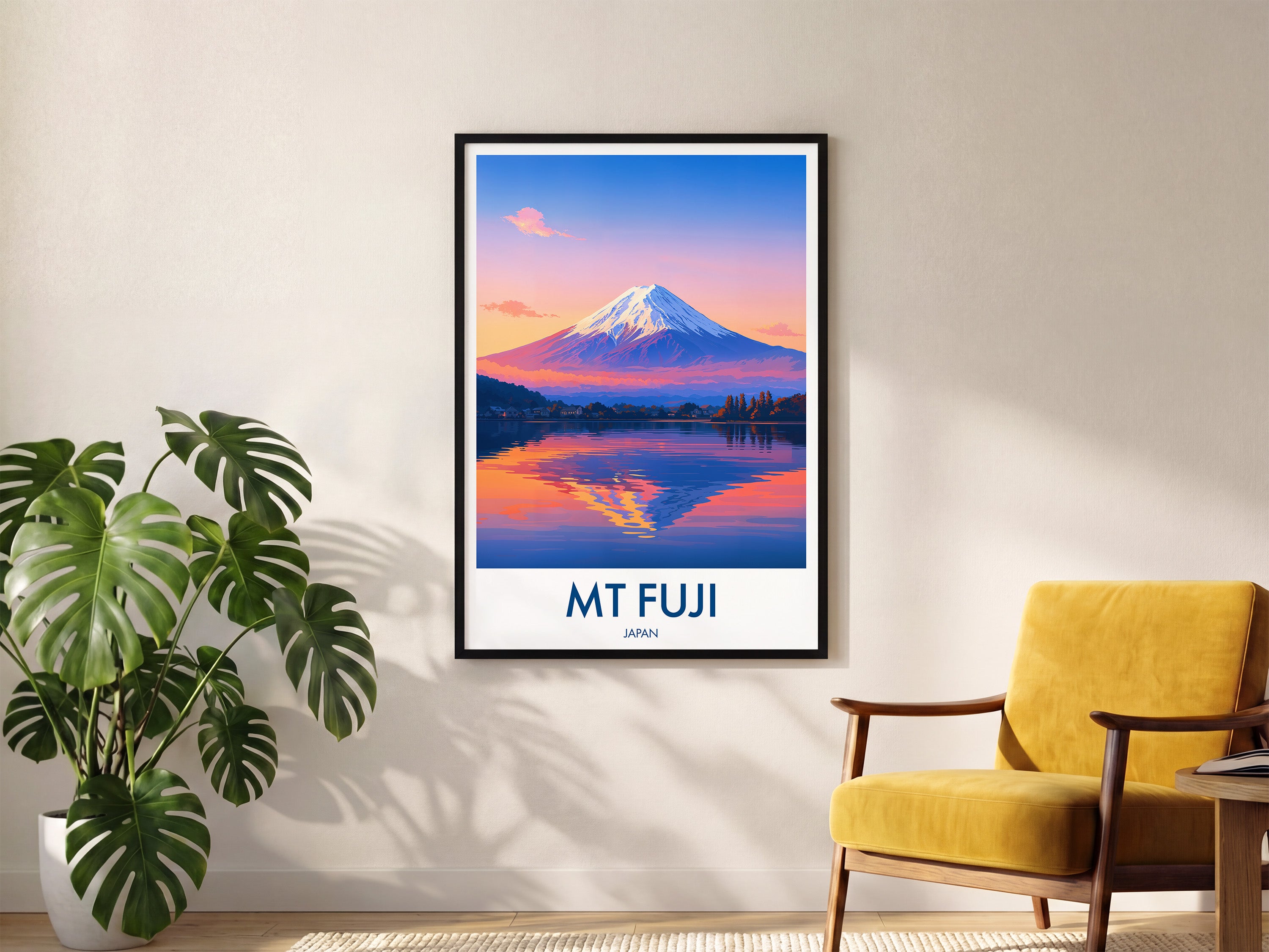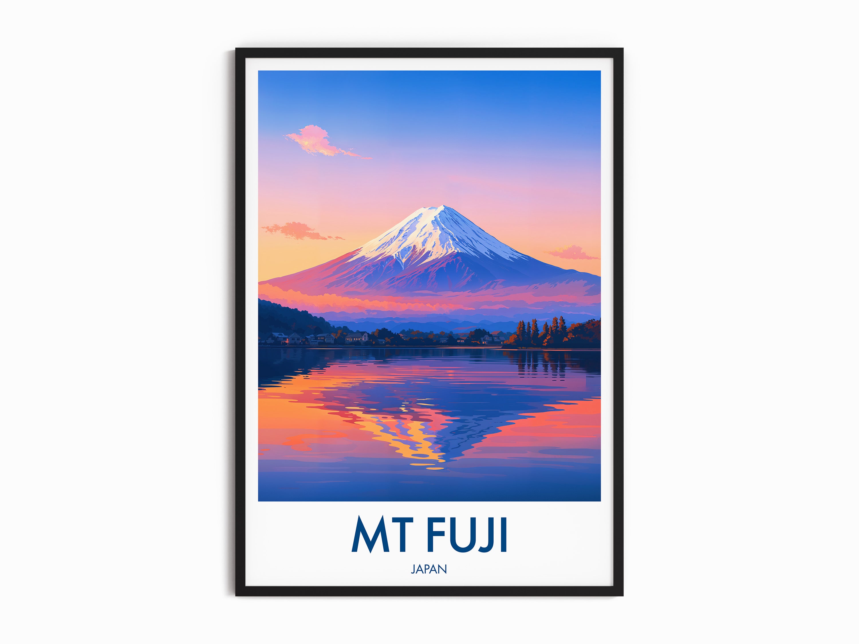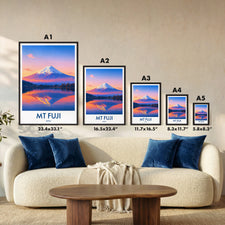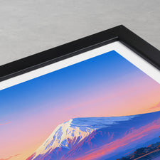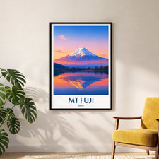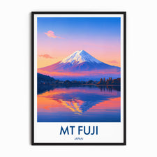 Capture the serene beauty of Mt Fuji at dusk with this illustrated travel poster. The vibrant hues reflect on the lake, offering a peaceful yet captivating scene from Japan's iconic landmark.