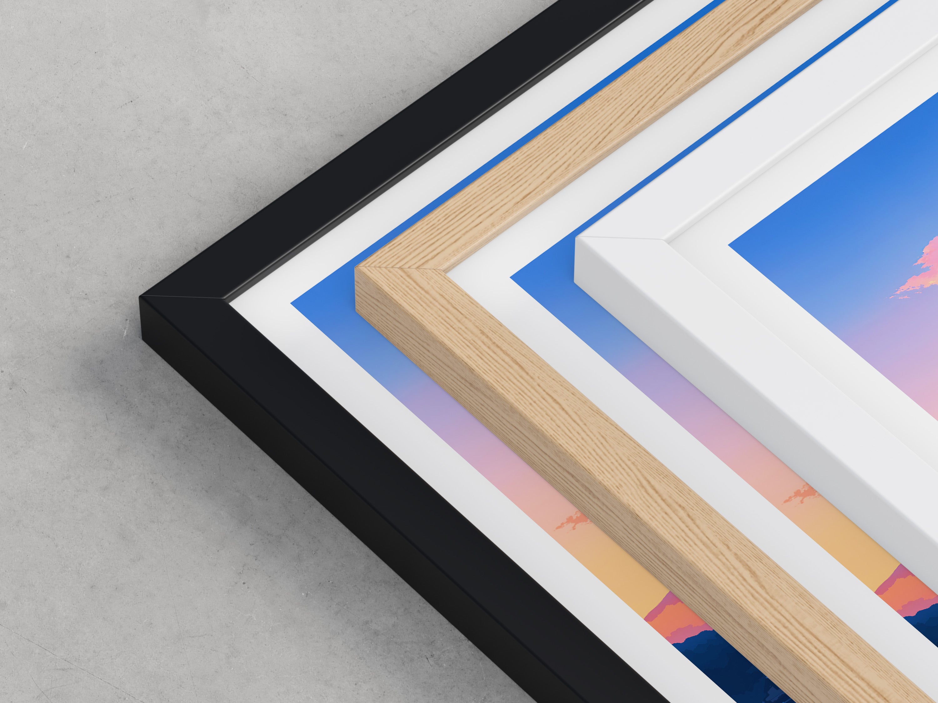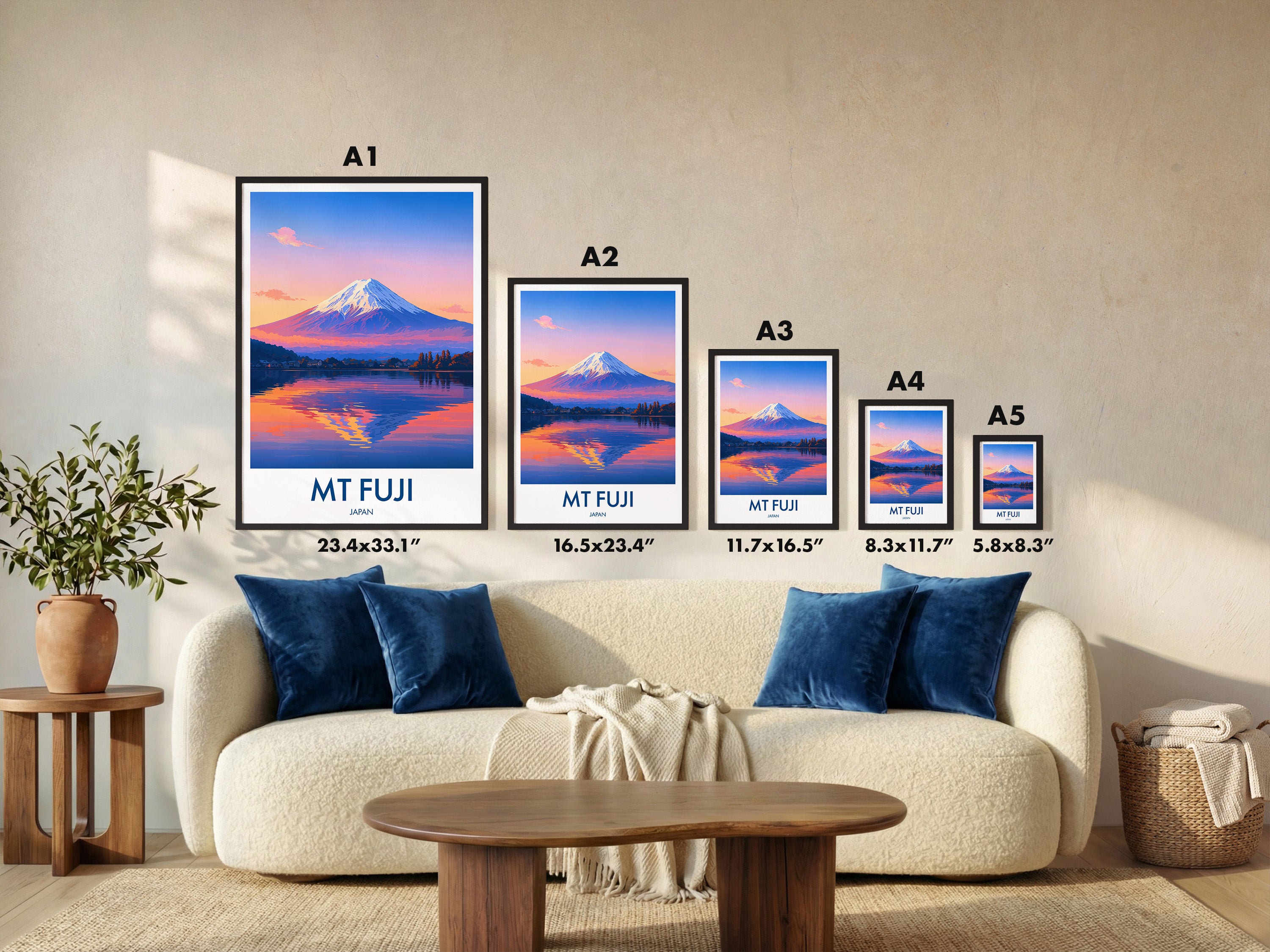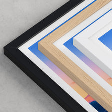 Framed options use sustainably sourced wooden frames in black, white, or natural wood, ready to hang.