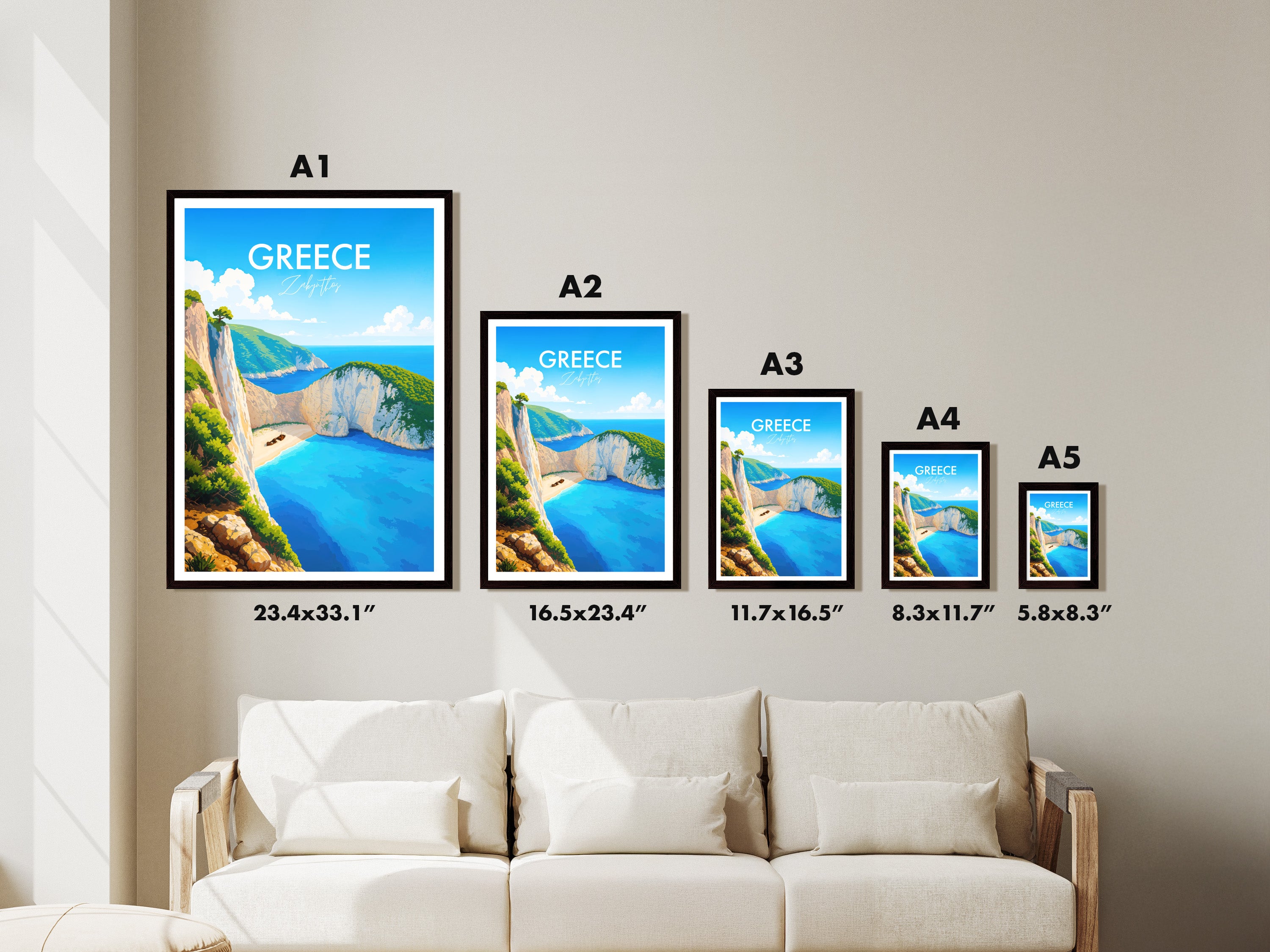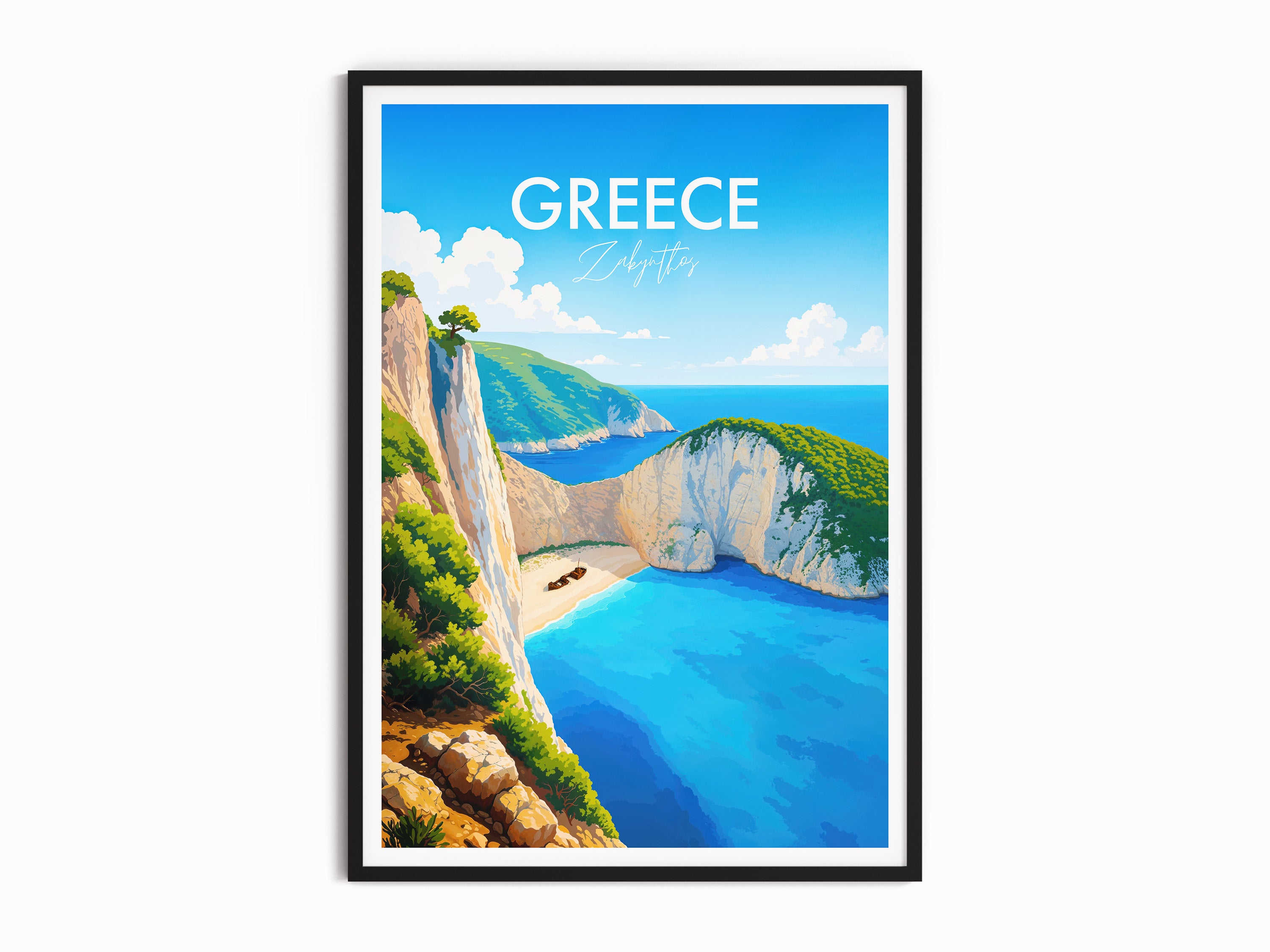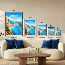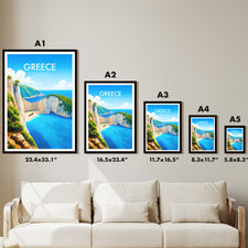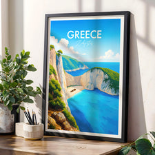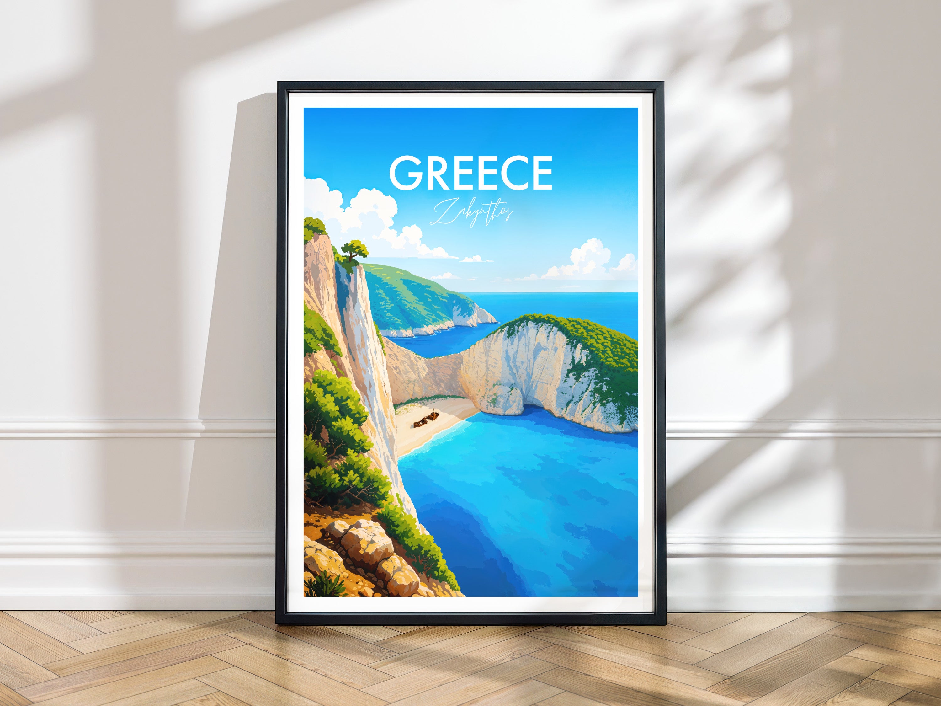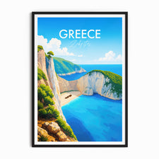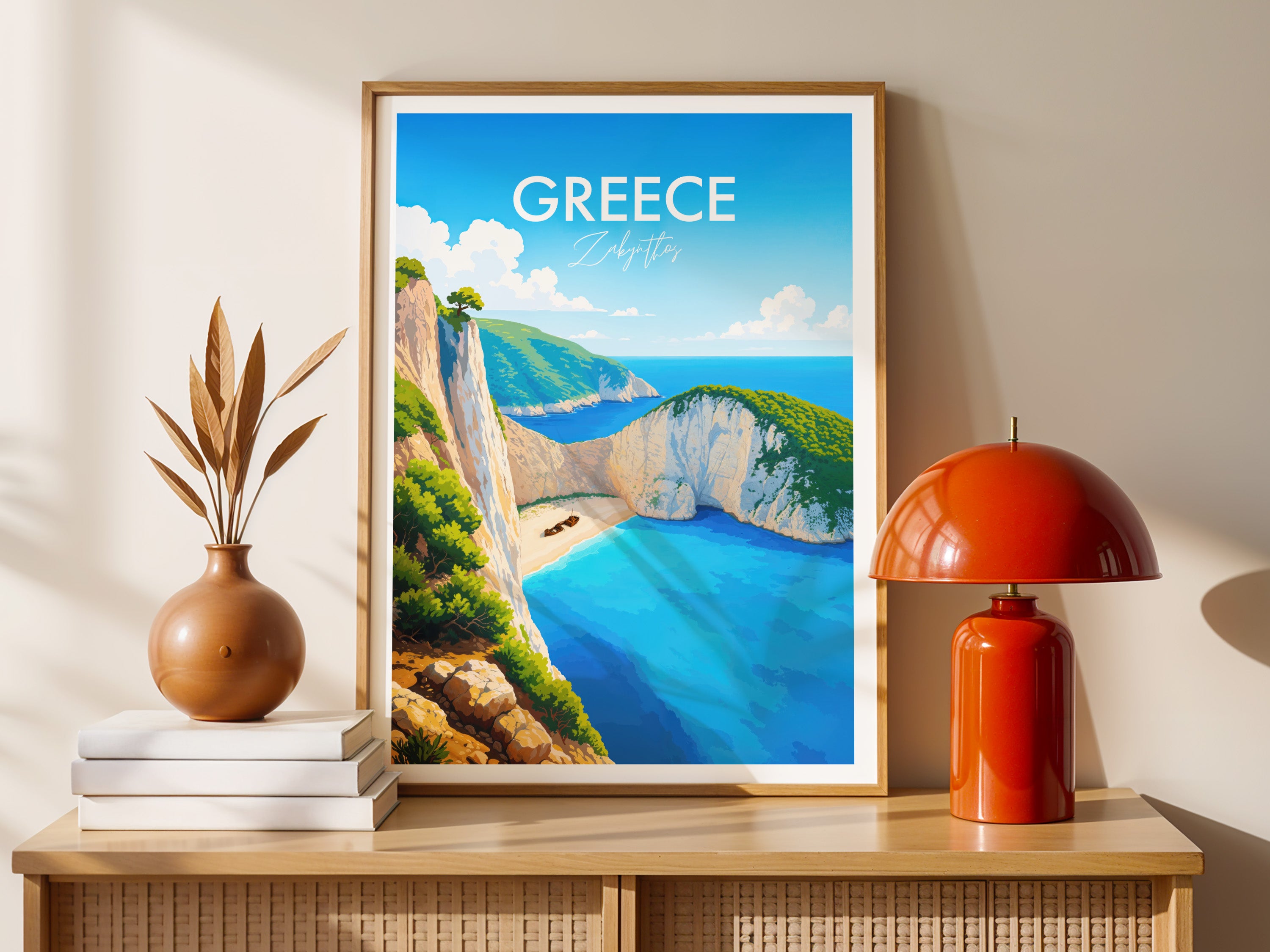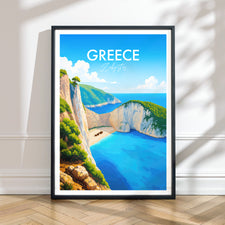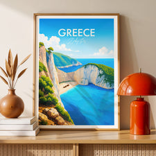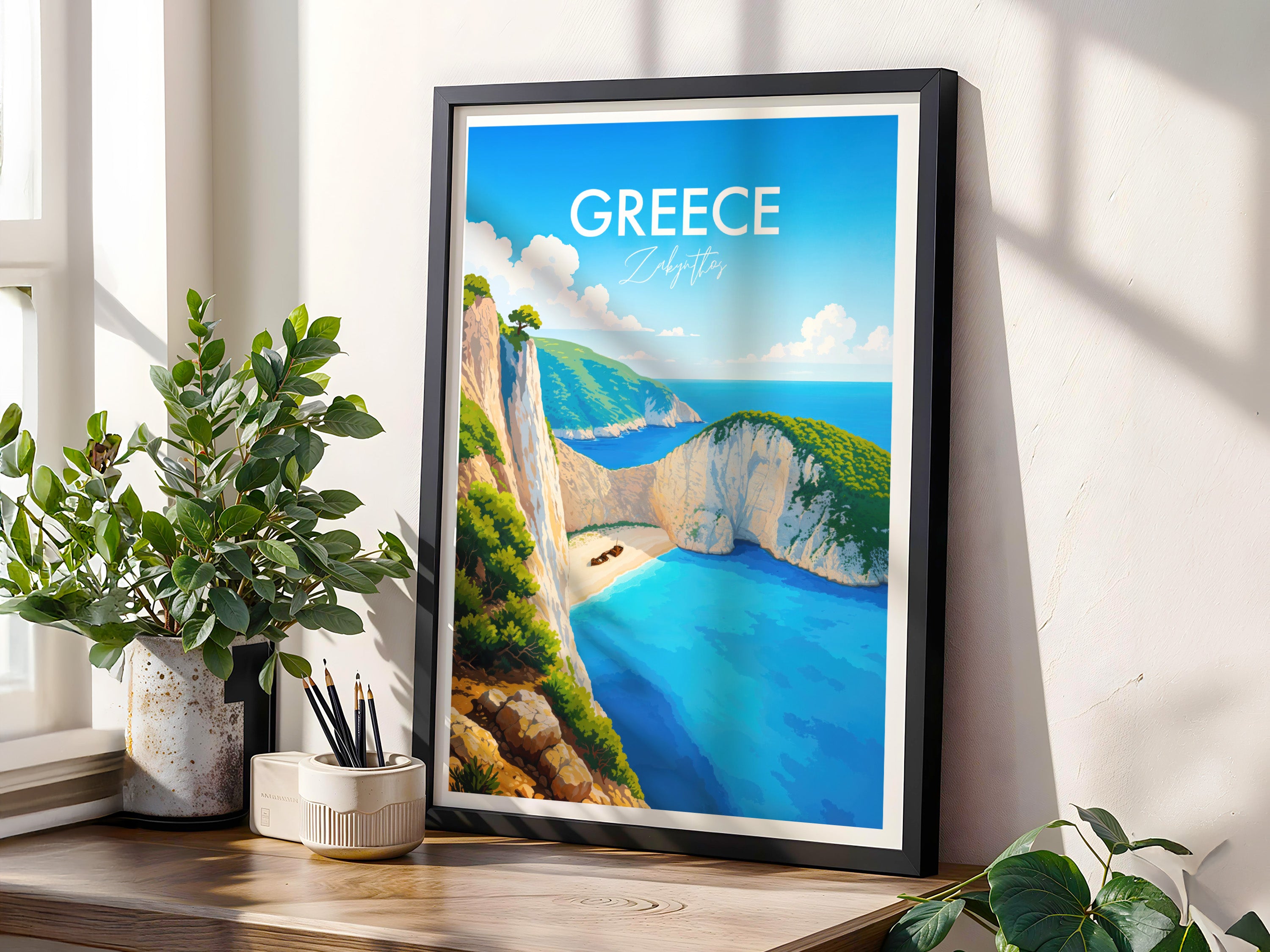 Capture the serene beauty of Navagio Beach with our illustrated print. Showcasing Zakynthos's iconic shipwreck and cliffs, this artwork transports you to a Greek paradise.