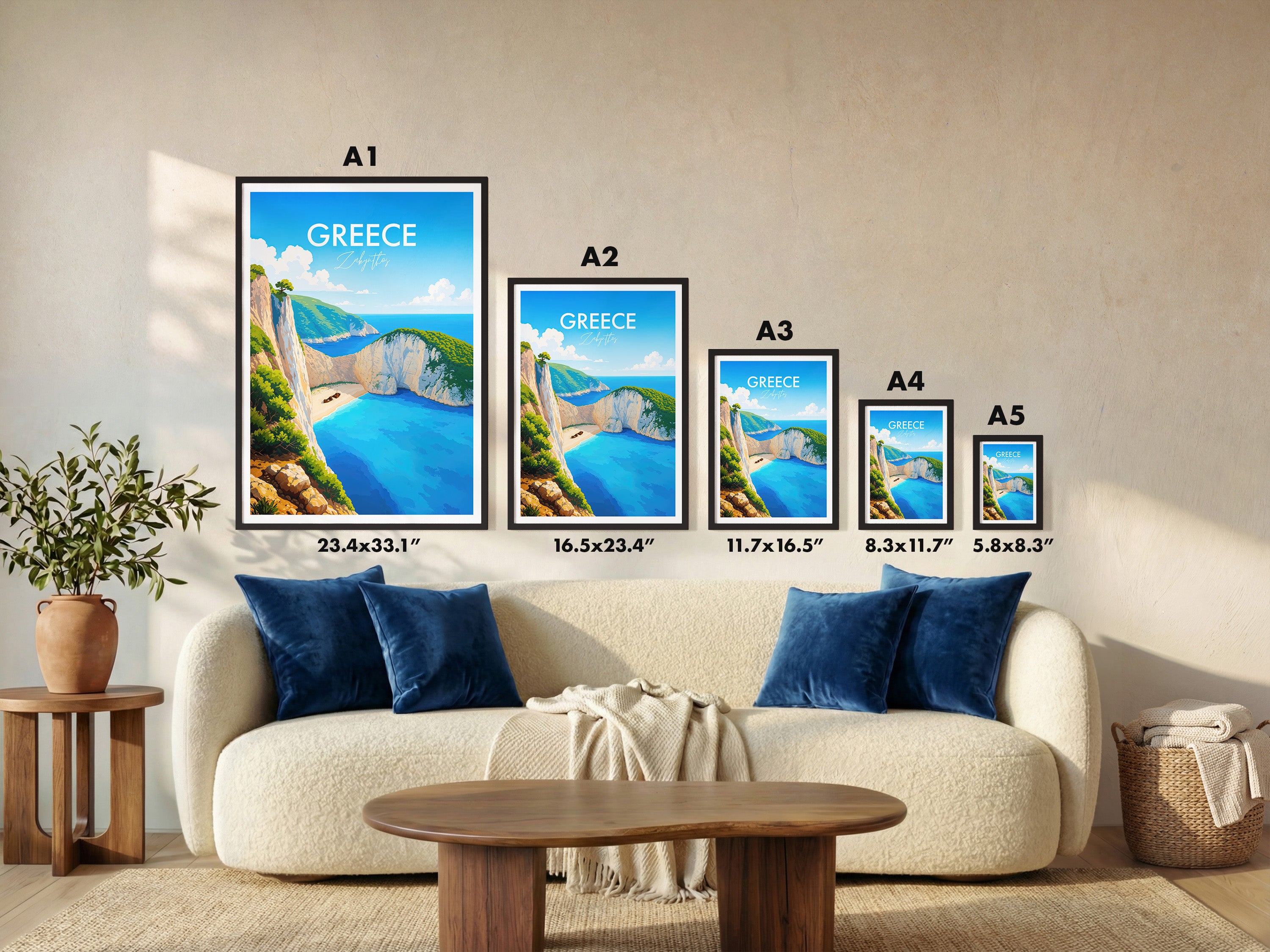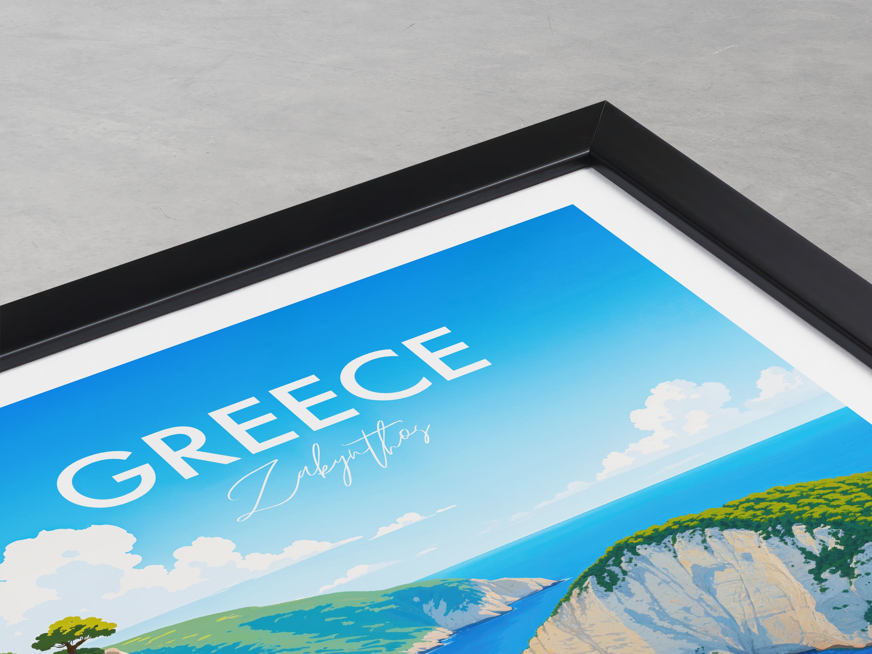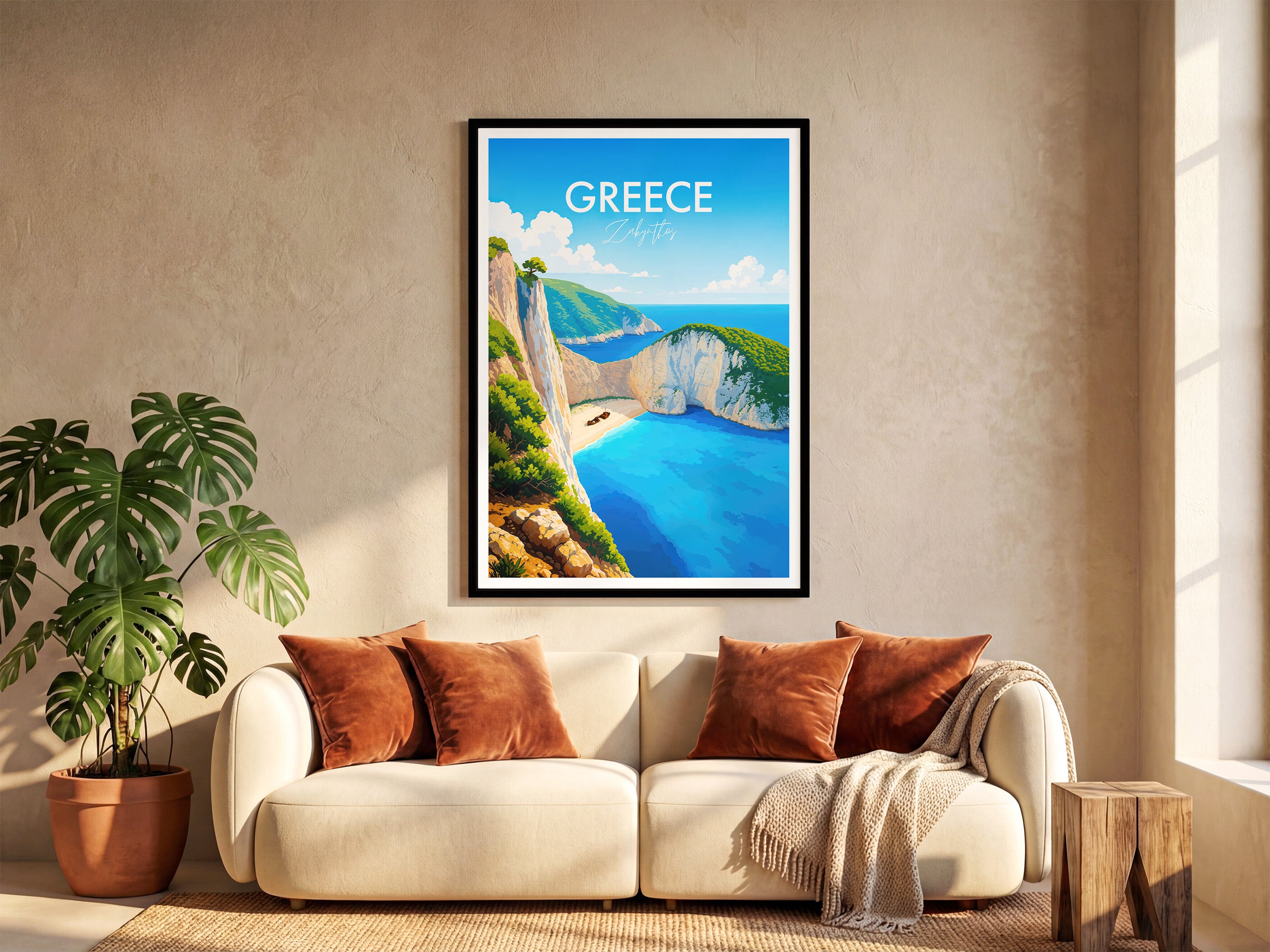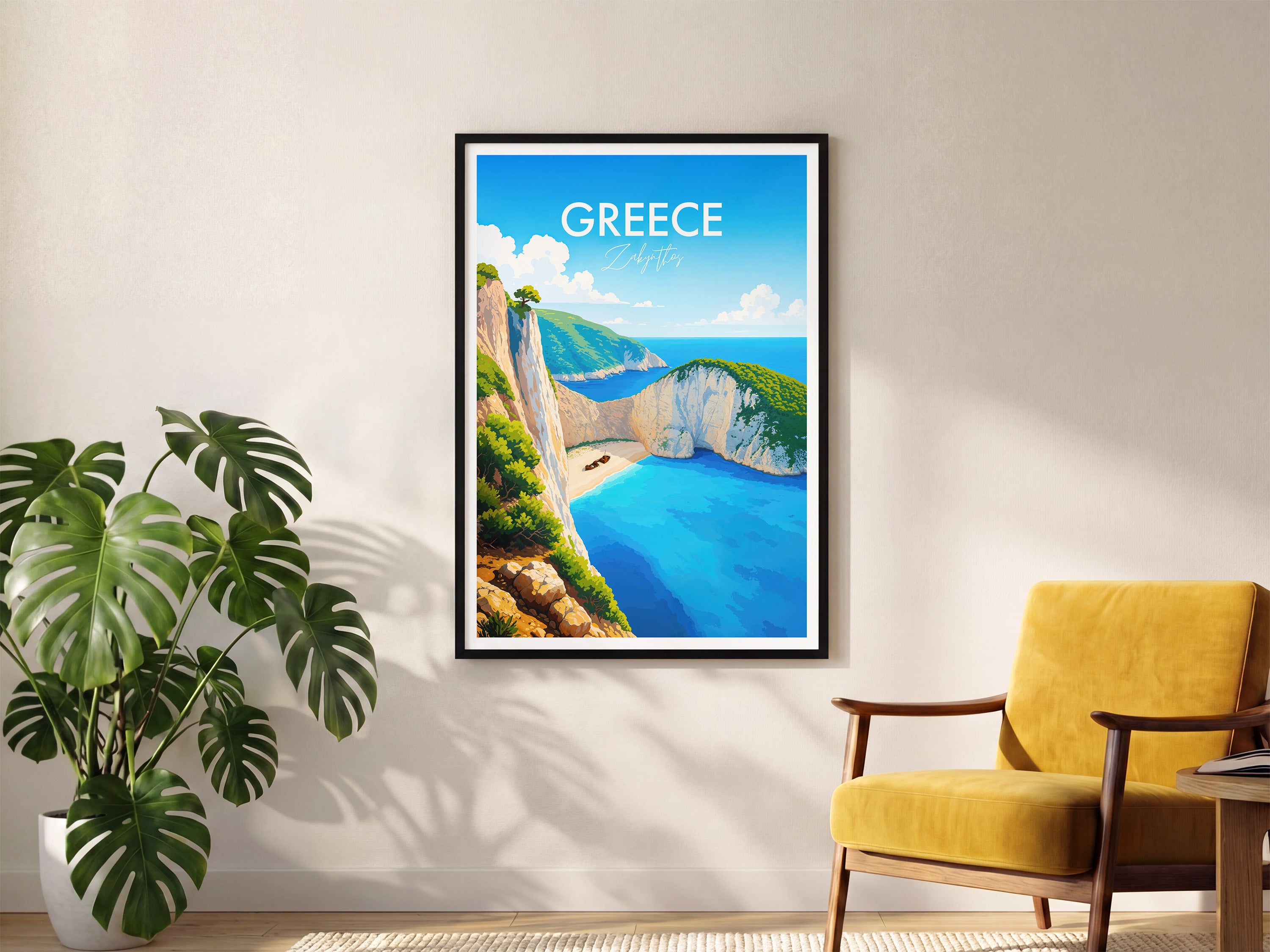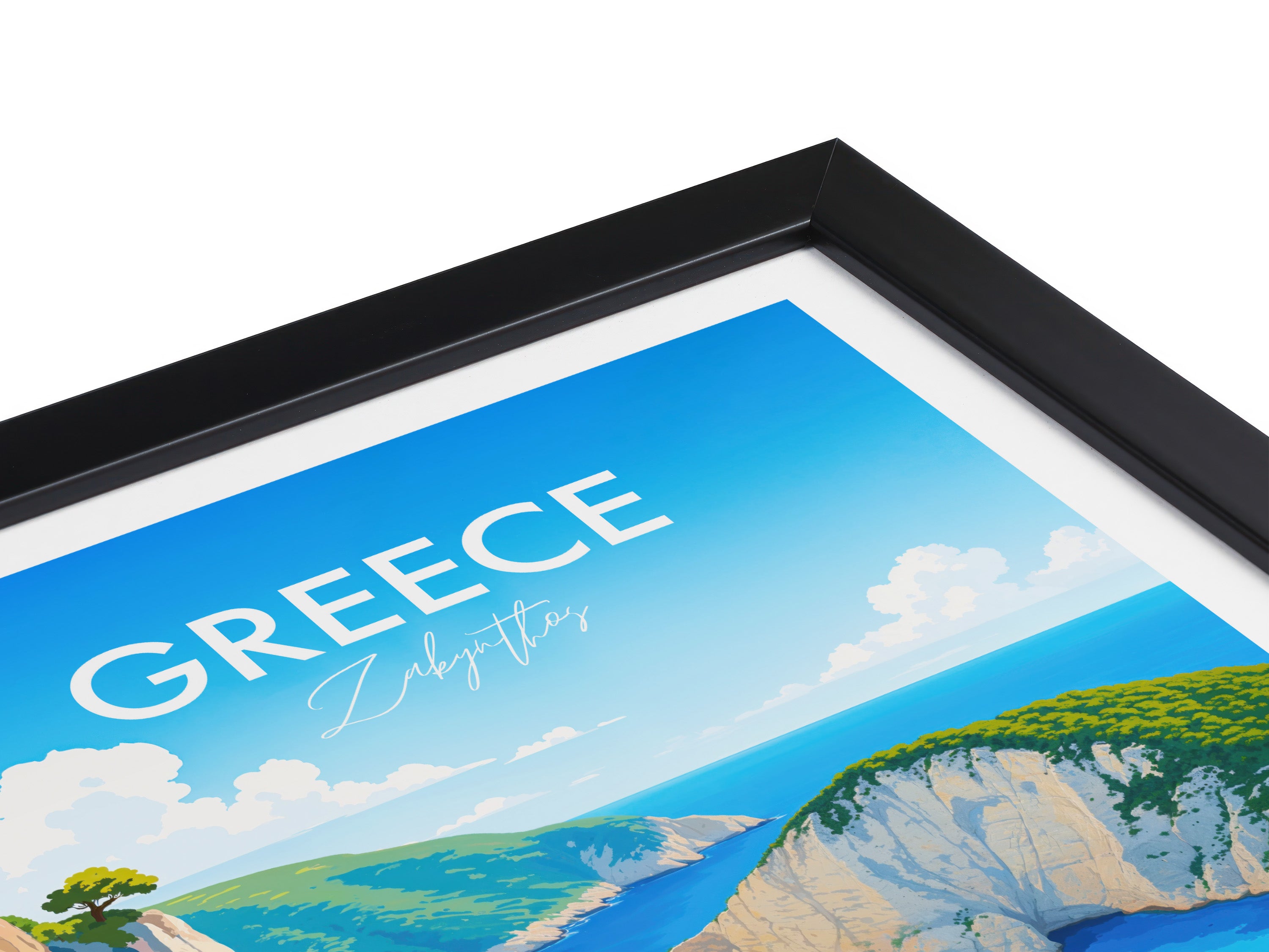 Capture the serene beauty of Navagio Beach with our illustrated print. Showcasing Zakynthos's iconic shipwreck and cliffs, this artwork transports you to a Greek paradise.