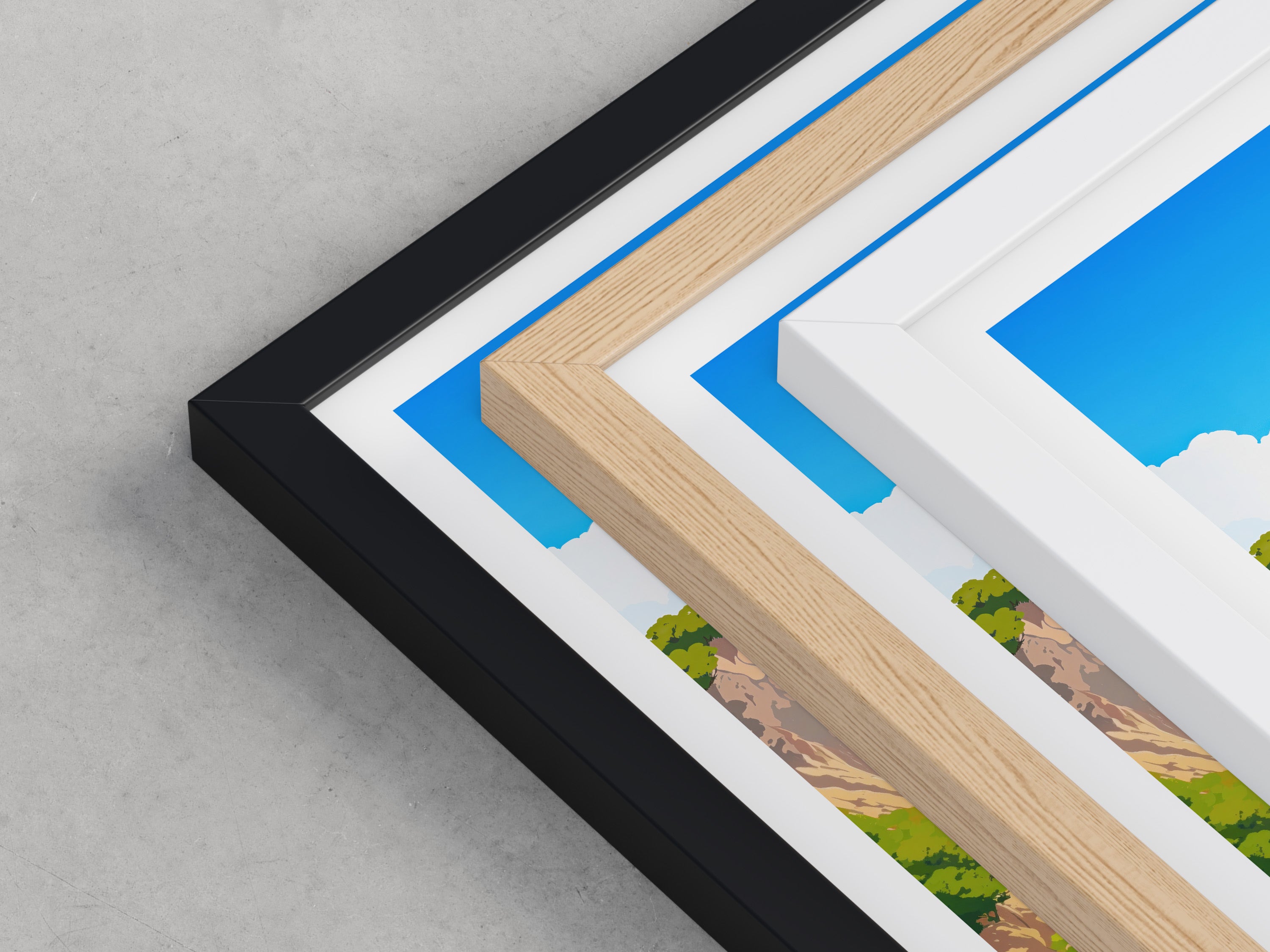Framed options use sustainably sourced wooden frames in black, white, or natural wood, ready to hang.