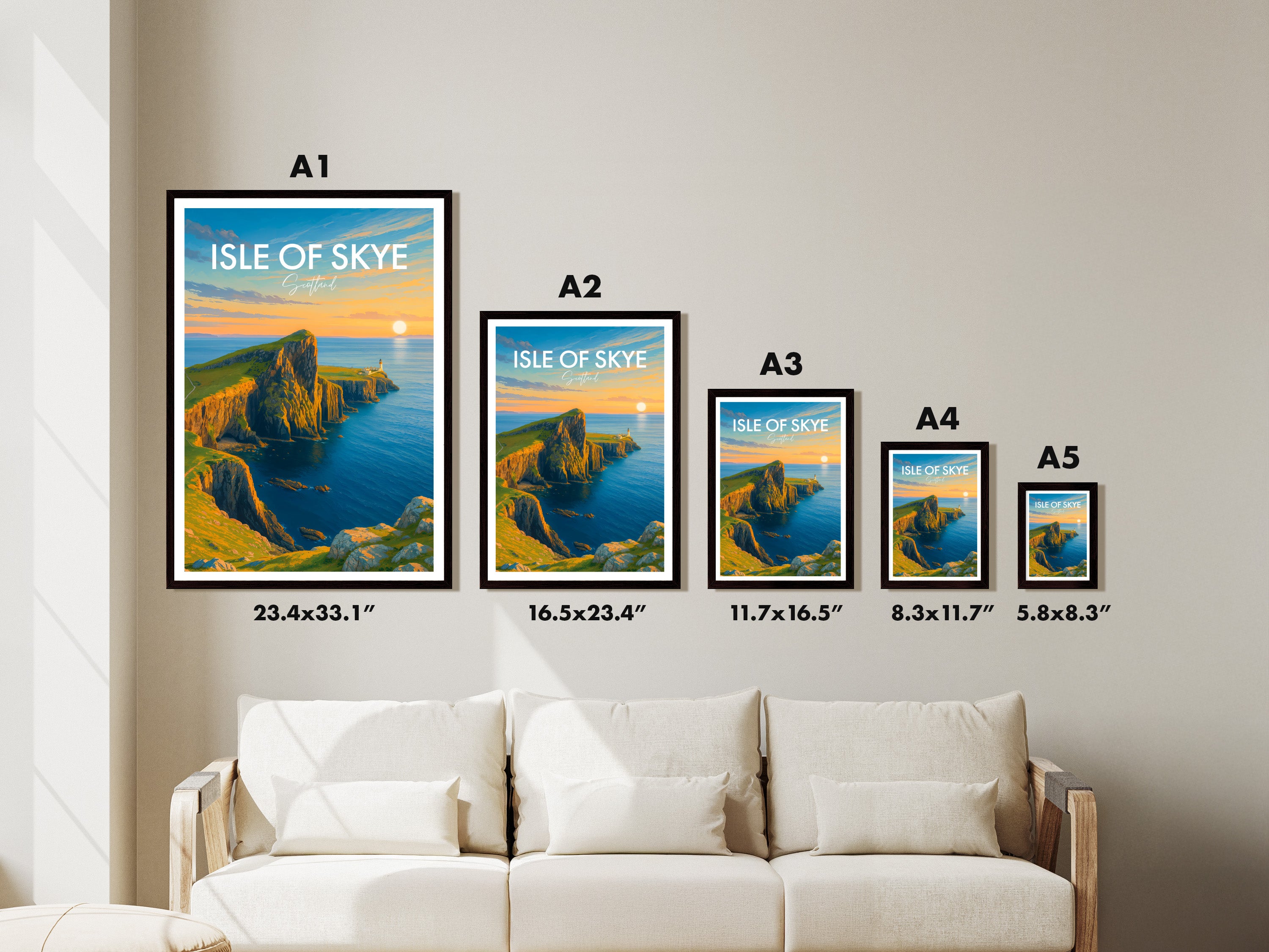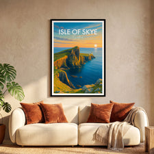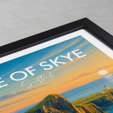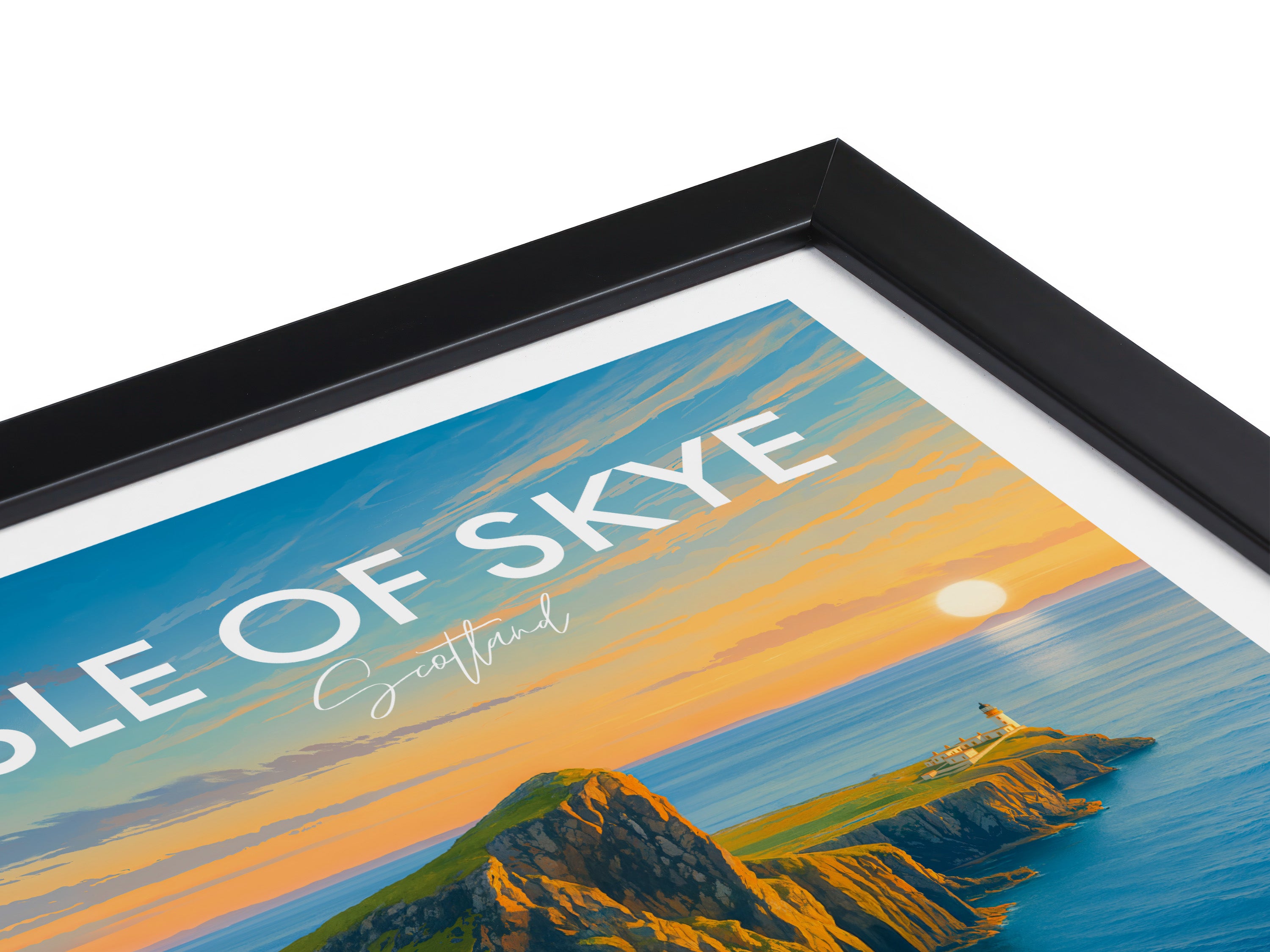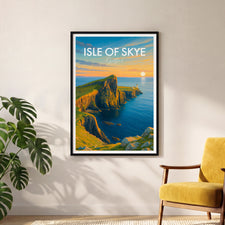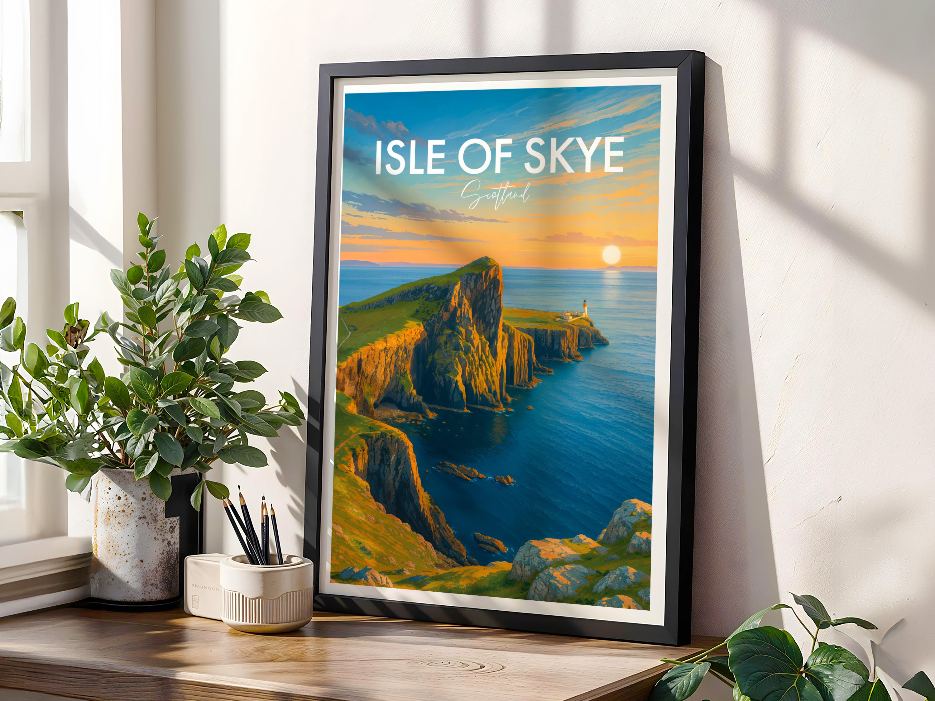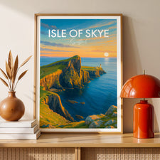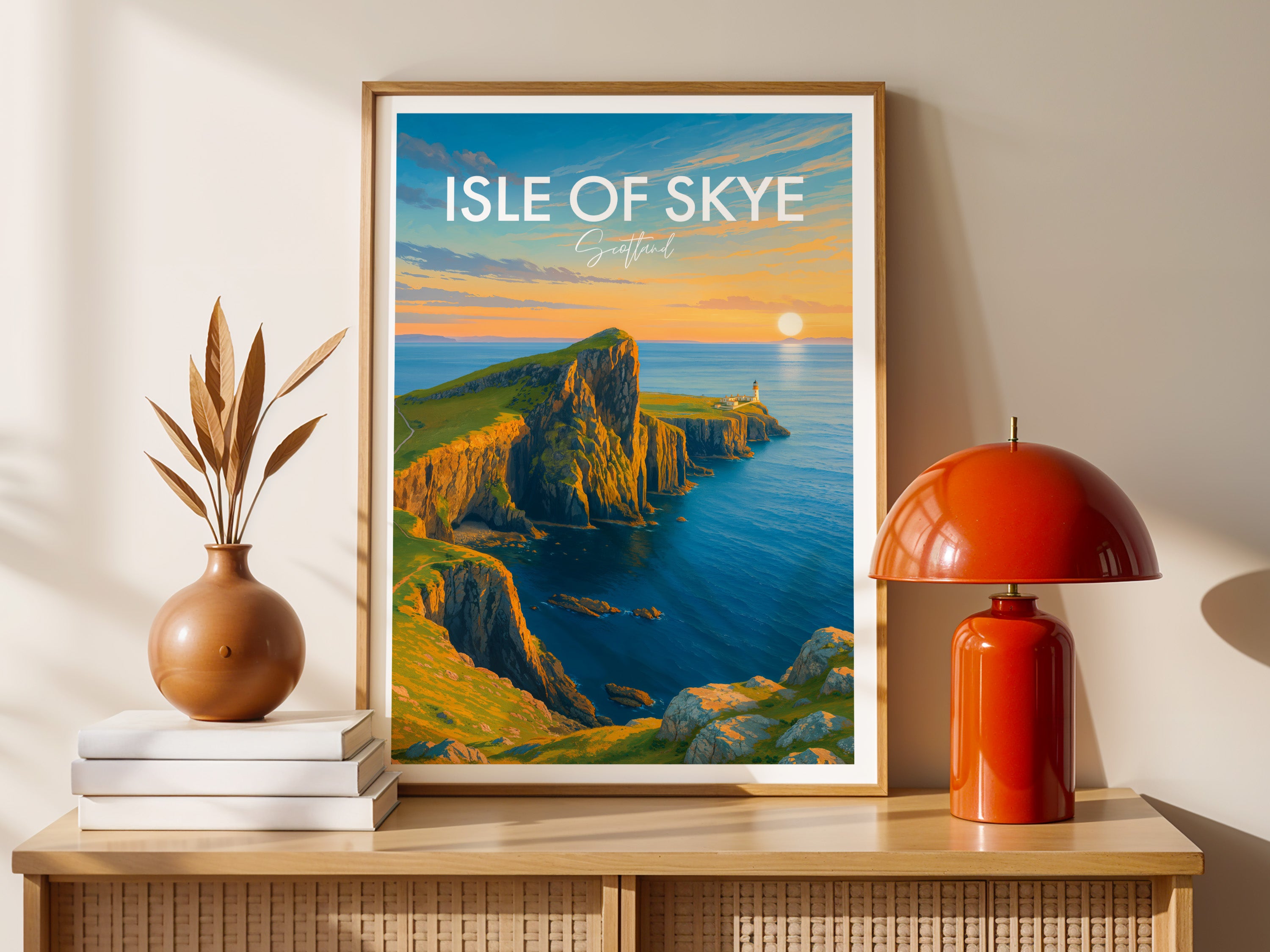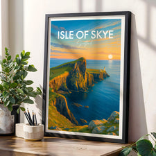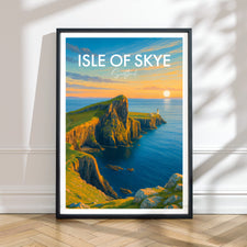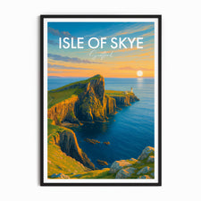 Capture the enchanting sunset at Neist Point with this beautifully illustrated poster of the Isle of Skye, Scotland. Ideal for lovers of coastal scenes and Scottish landscapes.