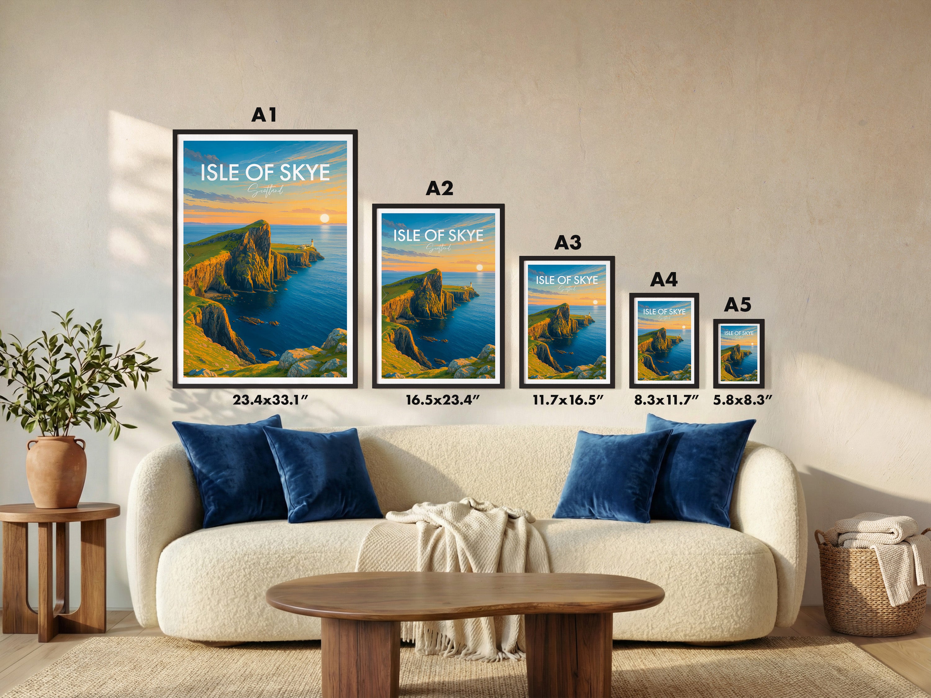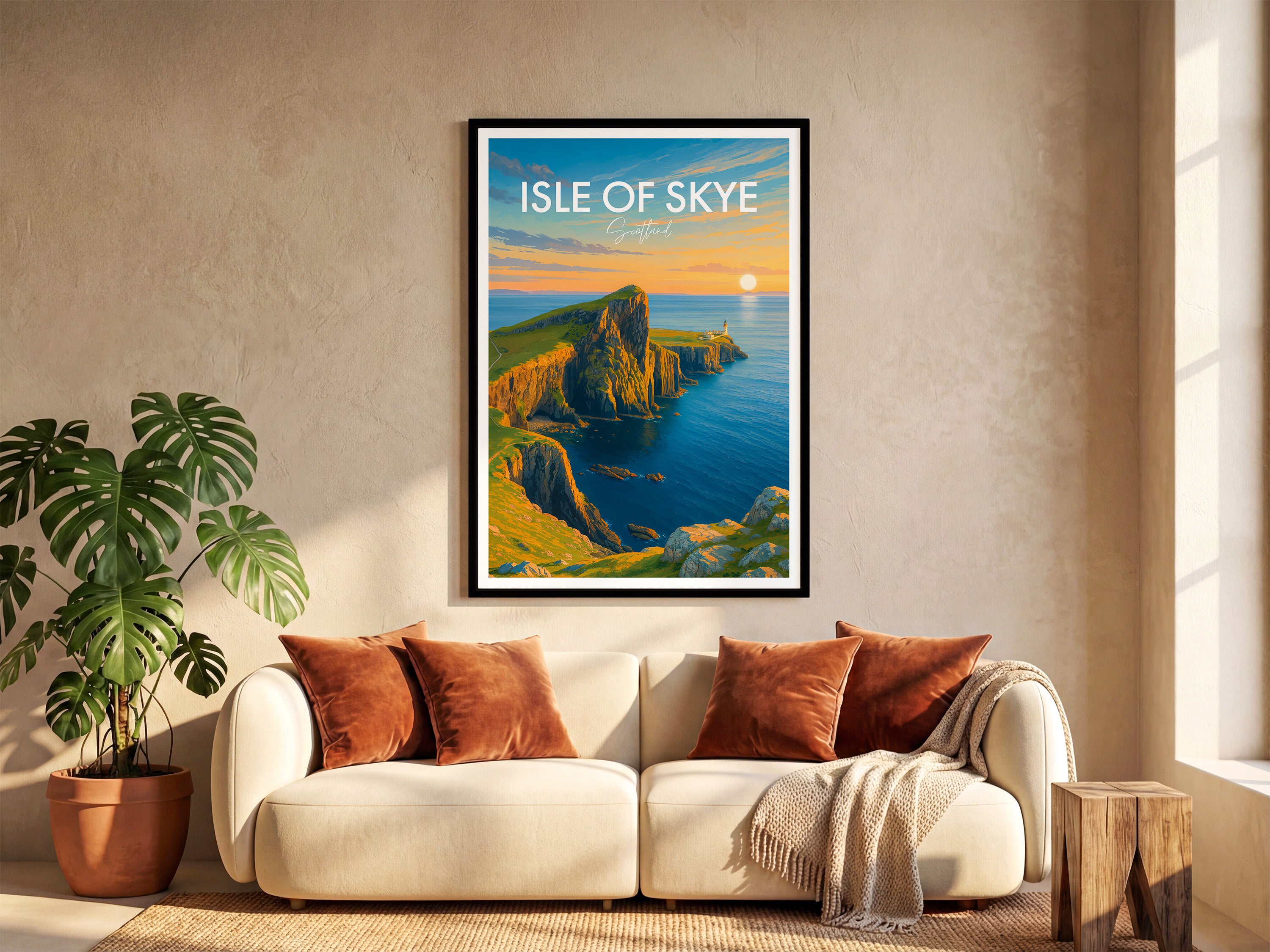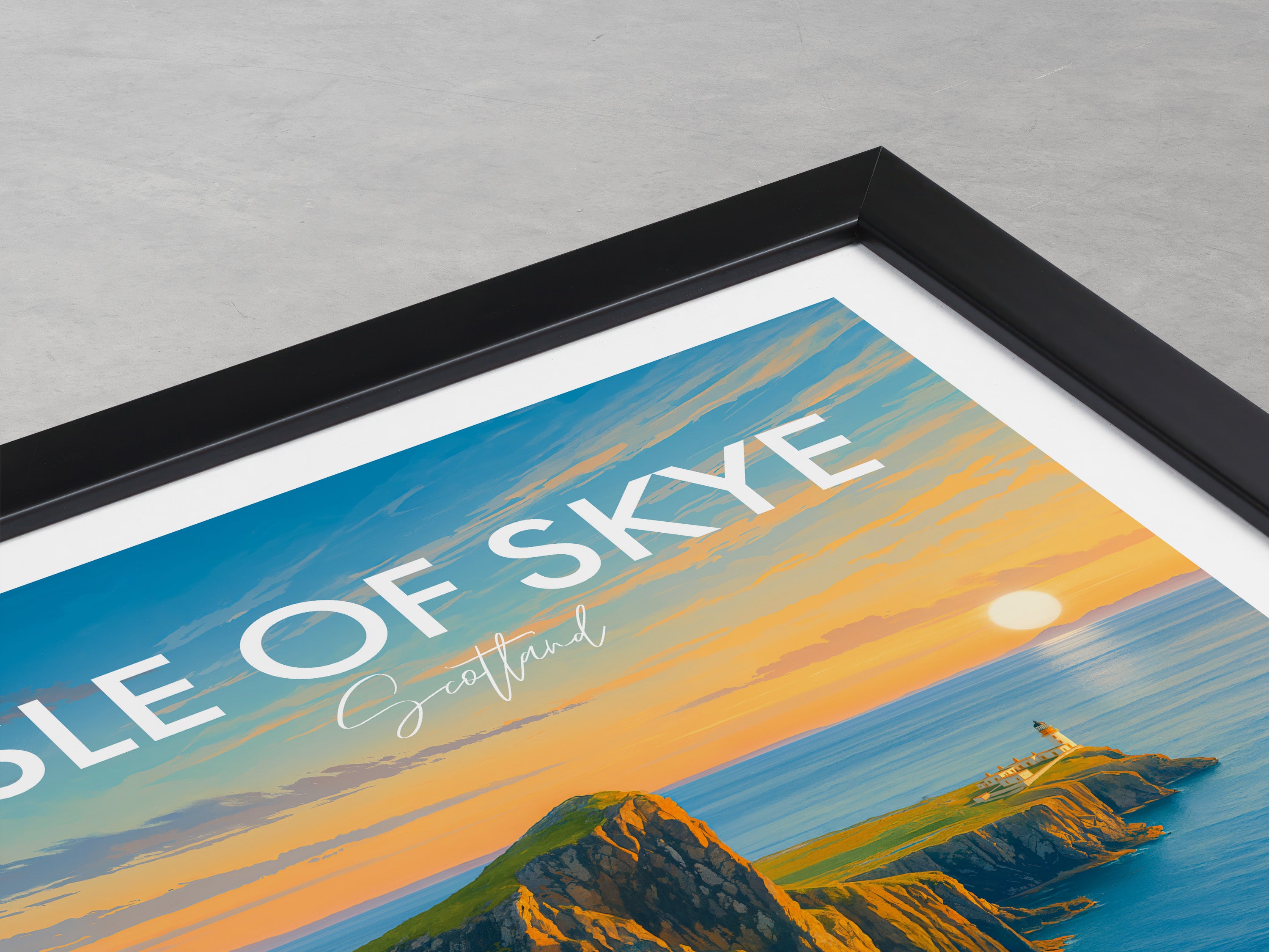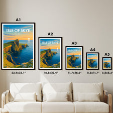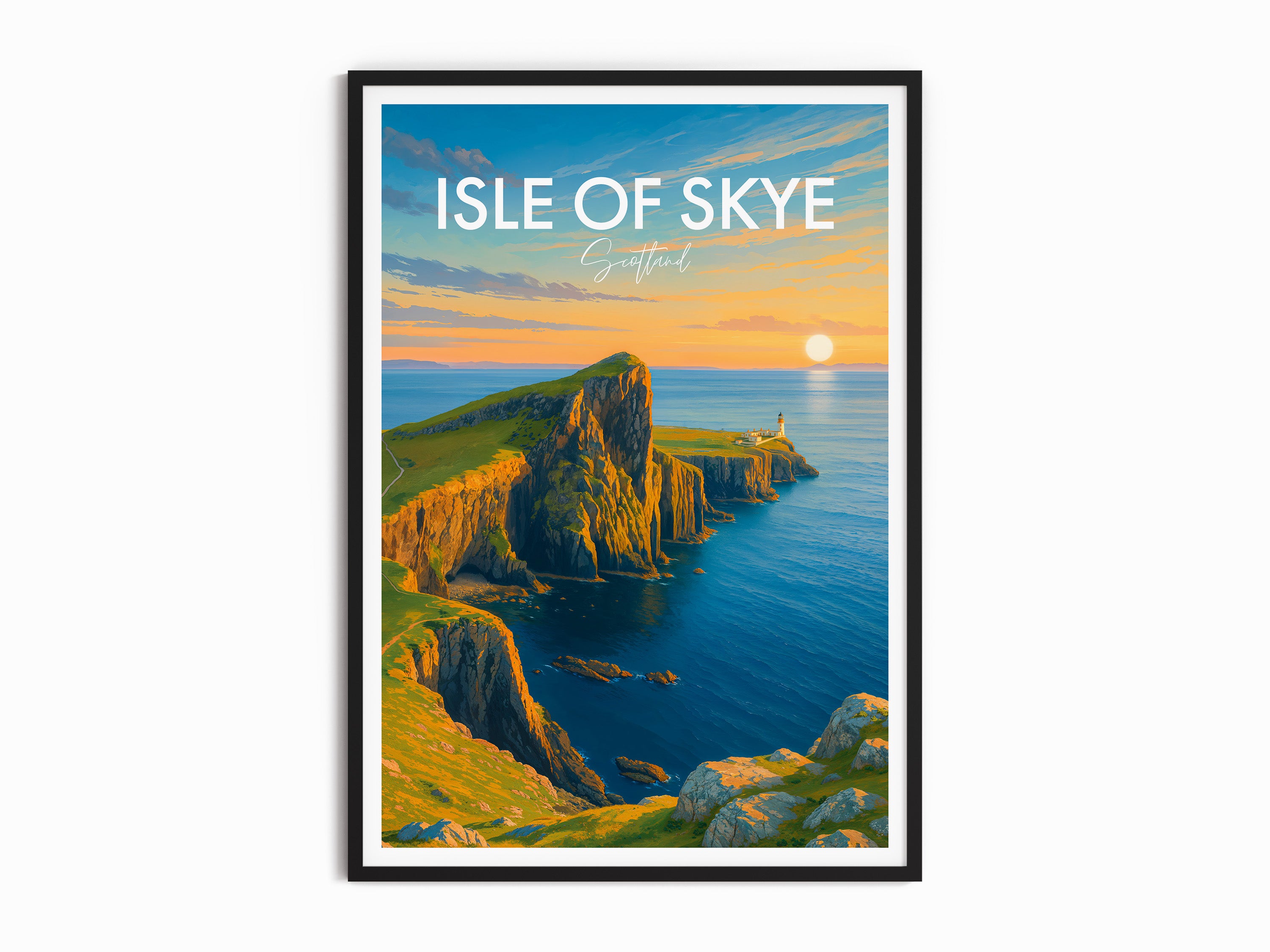 Capture the enchanting sunset at Neist Point with this beautifully illustrated poster of the Isle of Skye, Scotland. Ideal for lovers of coastal scenes and Scottish landscapes.