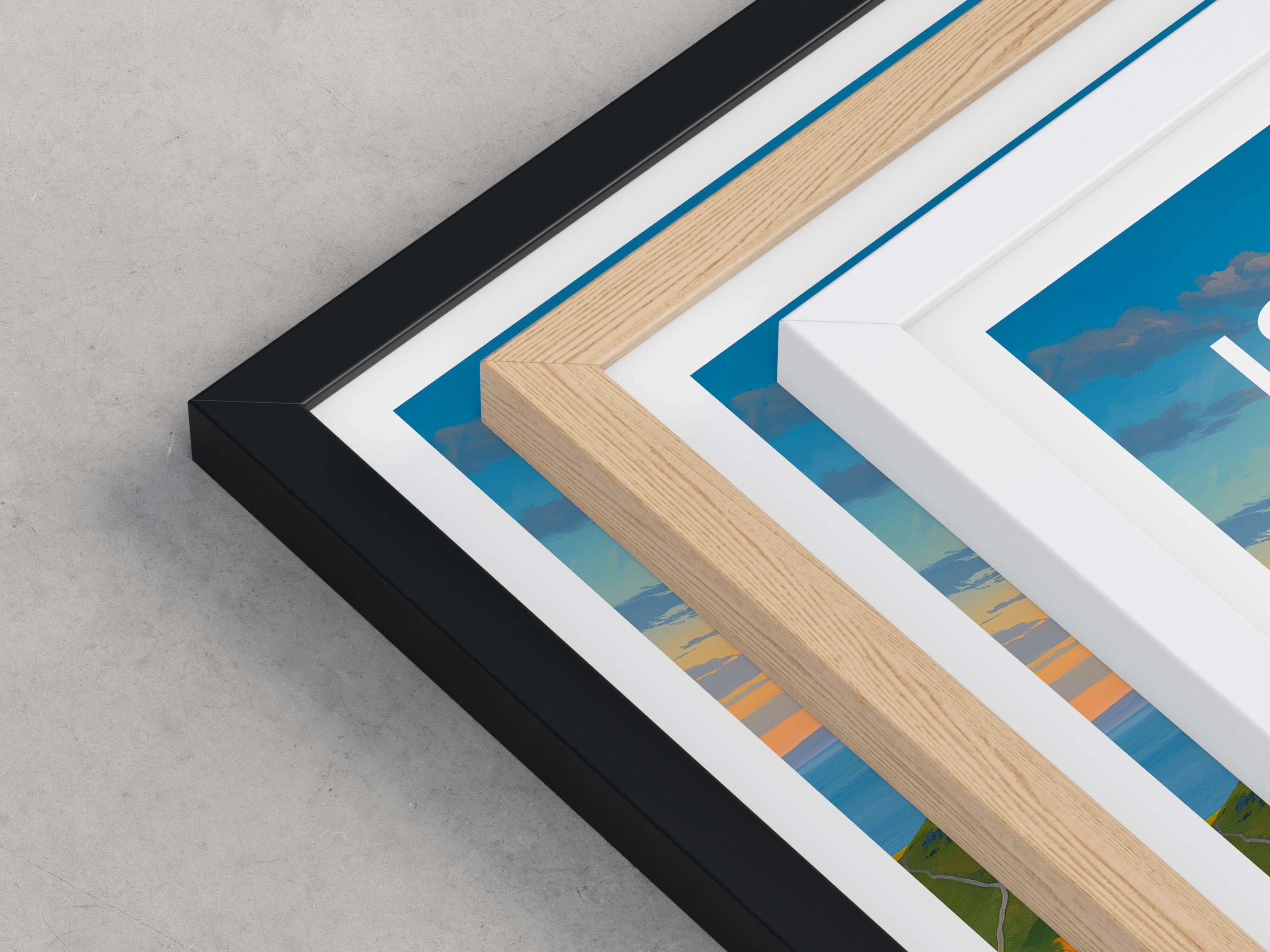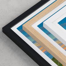 Framed options use sustainably sourced wooden frames in black, white, or natural wood, ready to hang.