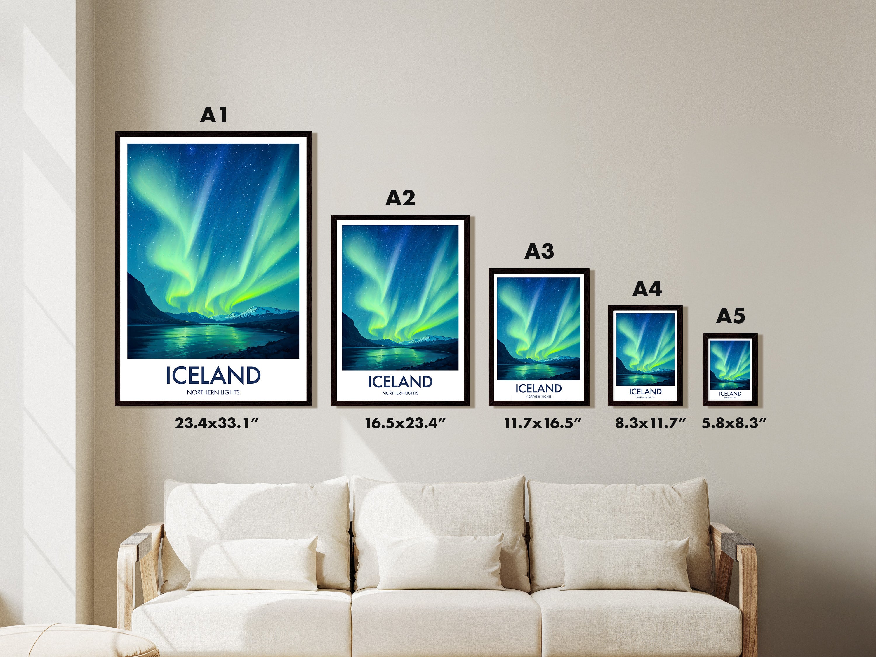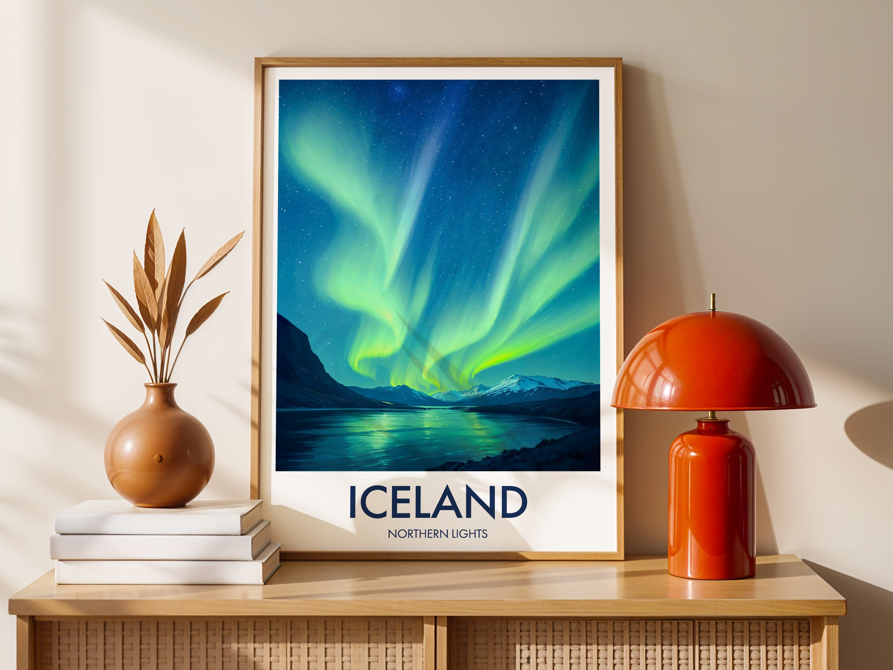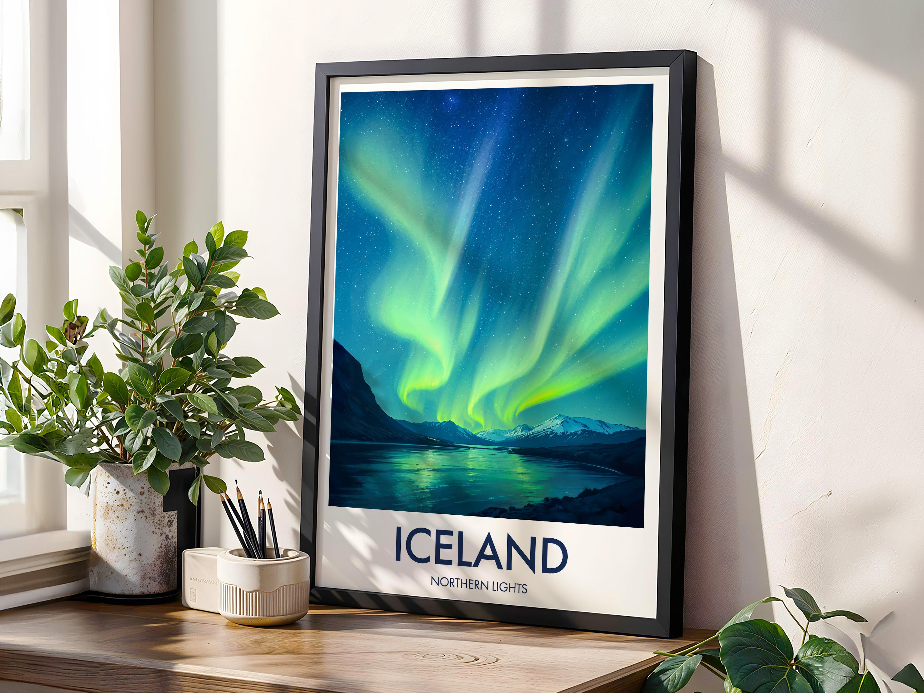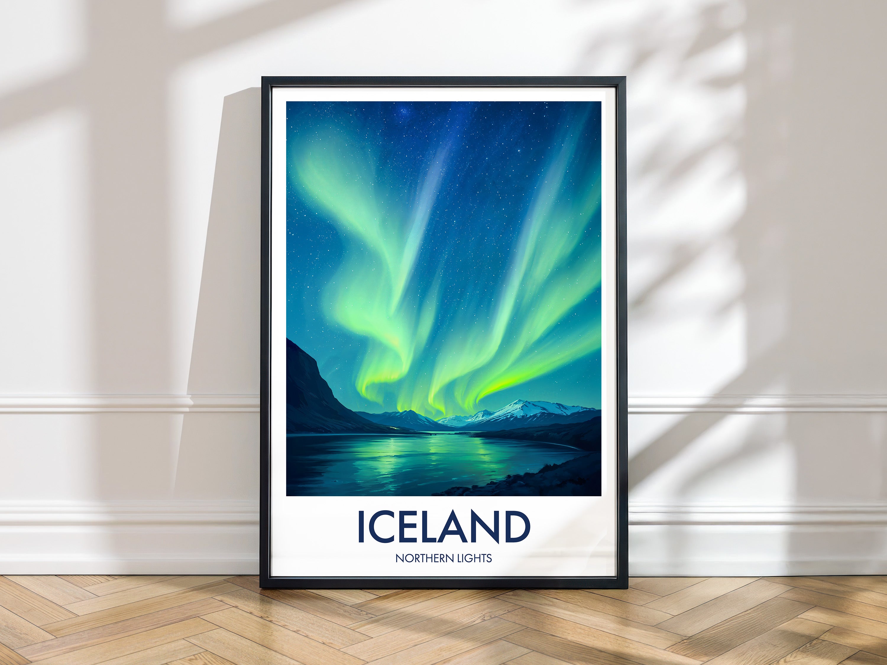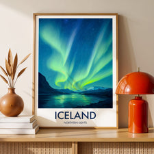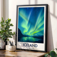 Add the mystical aura of the Northern Lights to your wall. This Icelandic print features vibrant hues dancing over serene landscapes, perfect for lovers of the natural phenomenon.