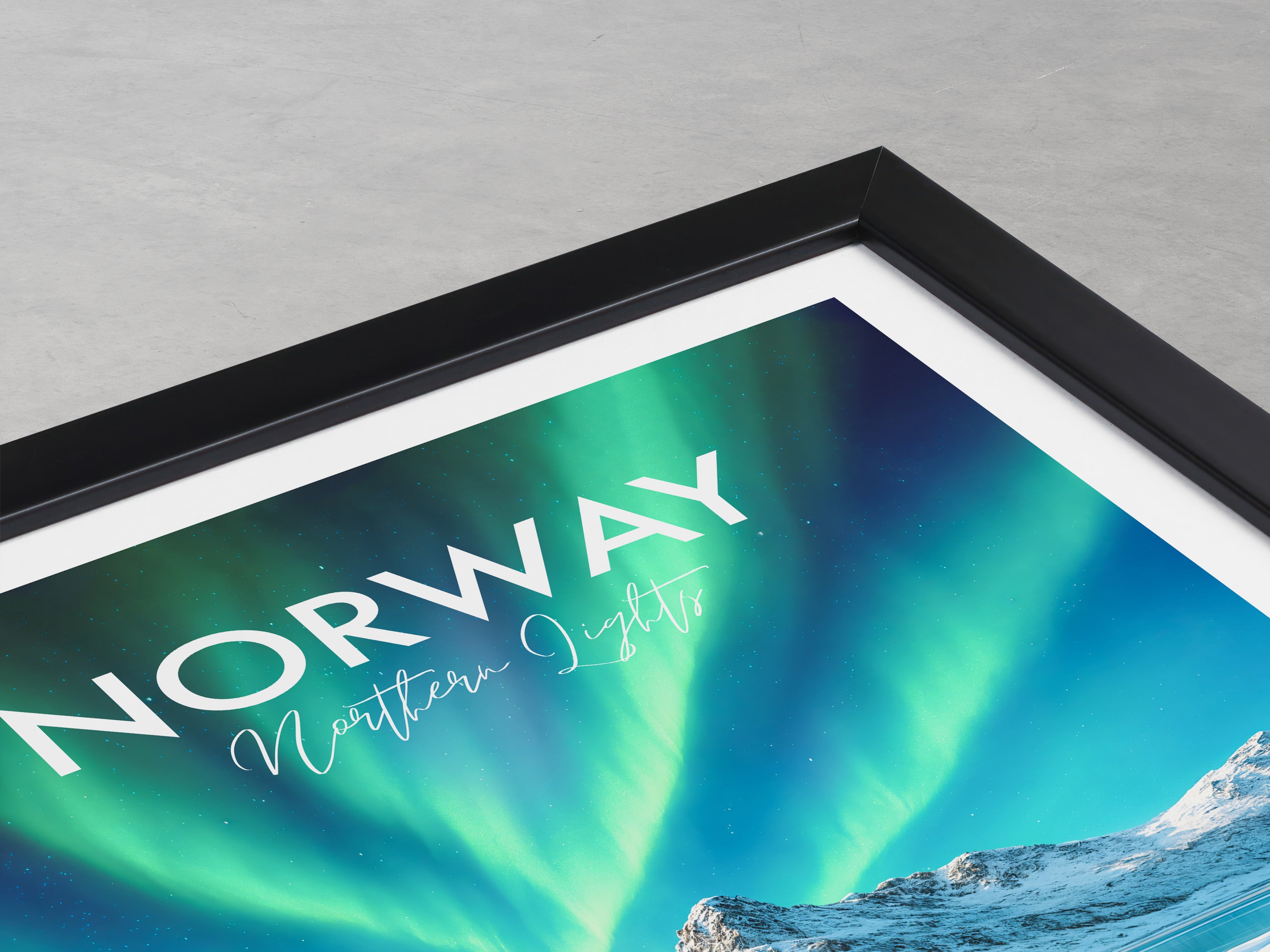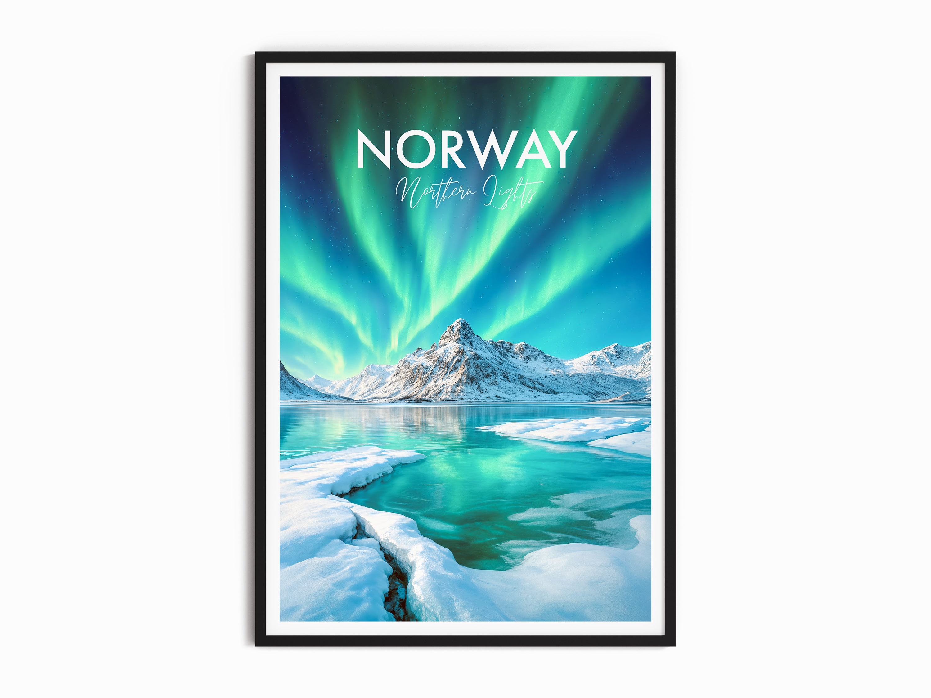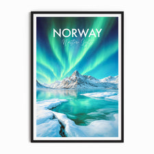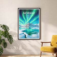 Experience the mesmerising dance of the Northern Lights with our stunning travel poster, featuring the awe-inspiring natural spectacle as it illuminates Lofoten's night sky. This artistic representation captures the ethereal green and blue hues reflected over Norway's icy waters, creating a captivating visual experience. It's a perfect gift for anyone who dreams of witnessing this natural wonder.