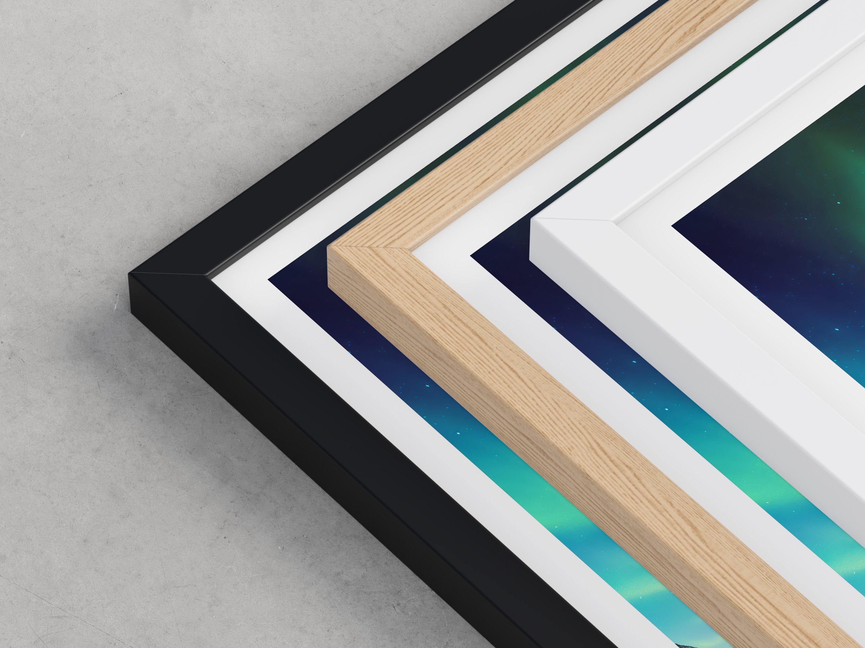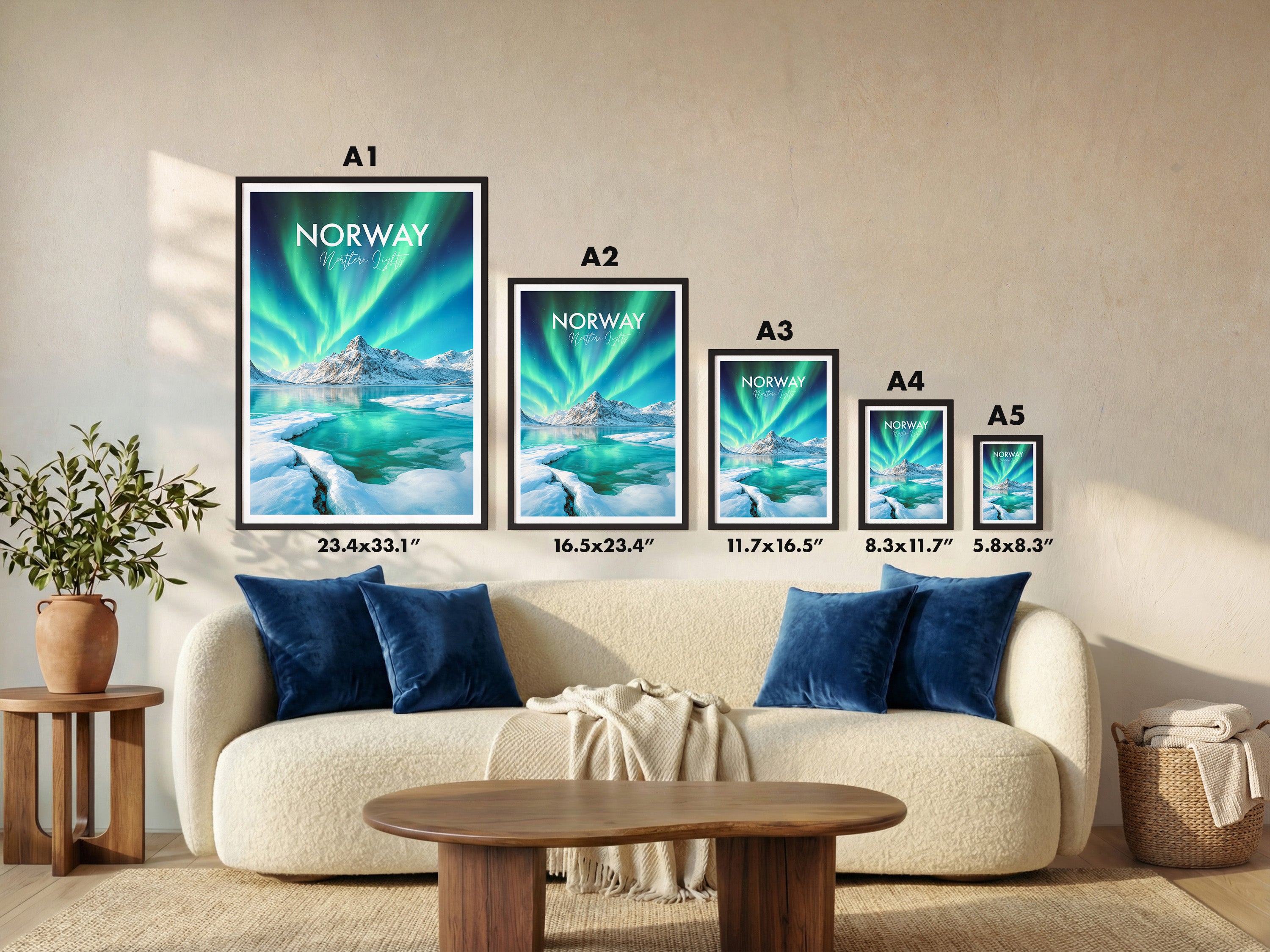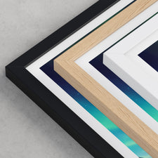 Framed options use sustainably sourced wooden frames in black, white, or natural wood, ready to hang.