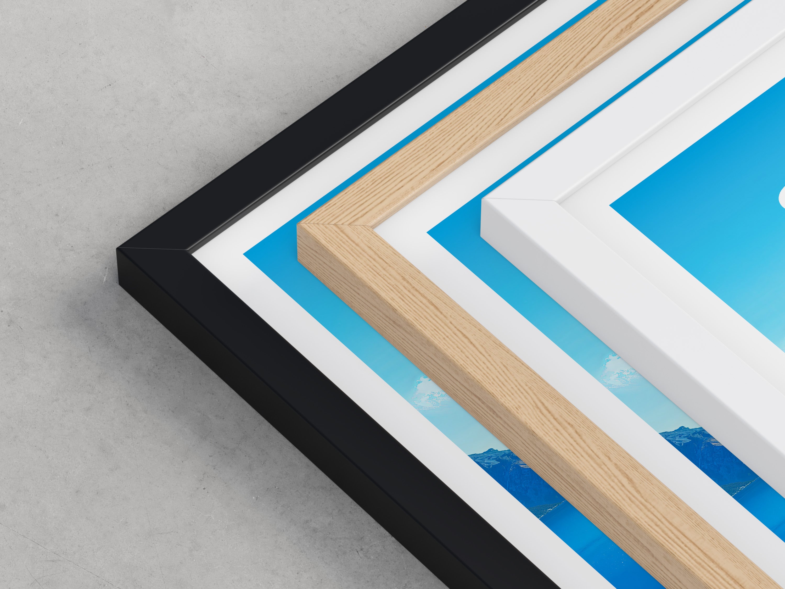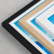 Framed options use sustainably sourced wooden frames in black, white, or natural wood, ready to hang.