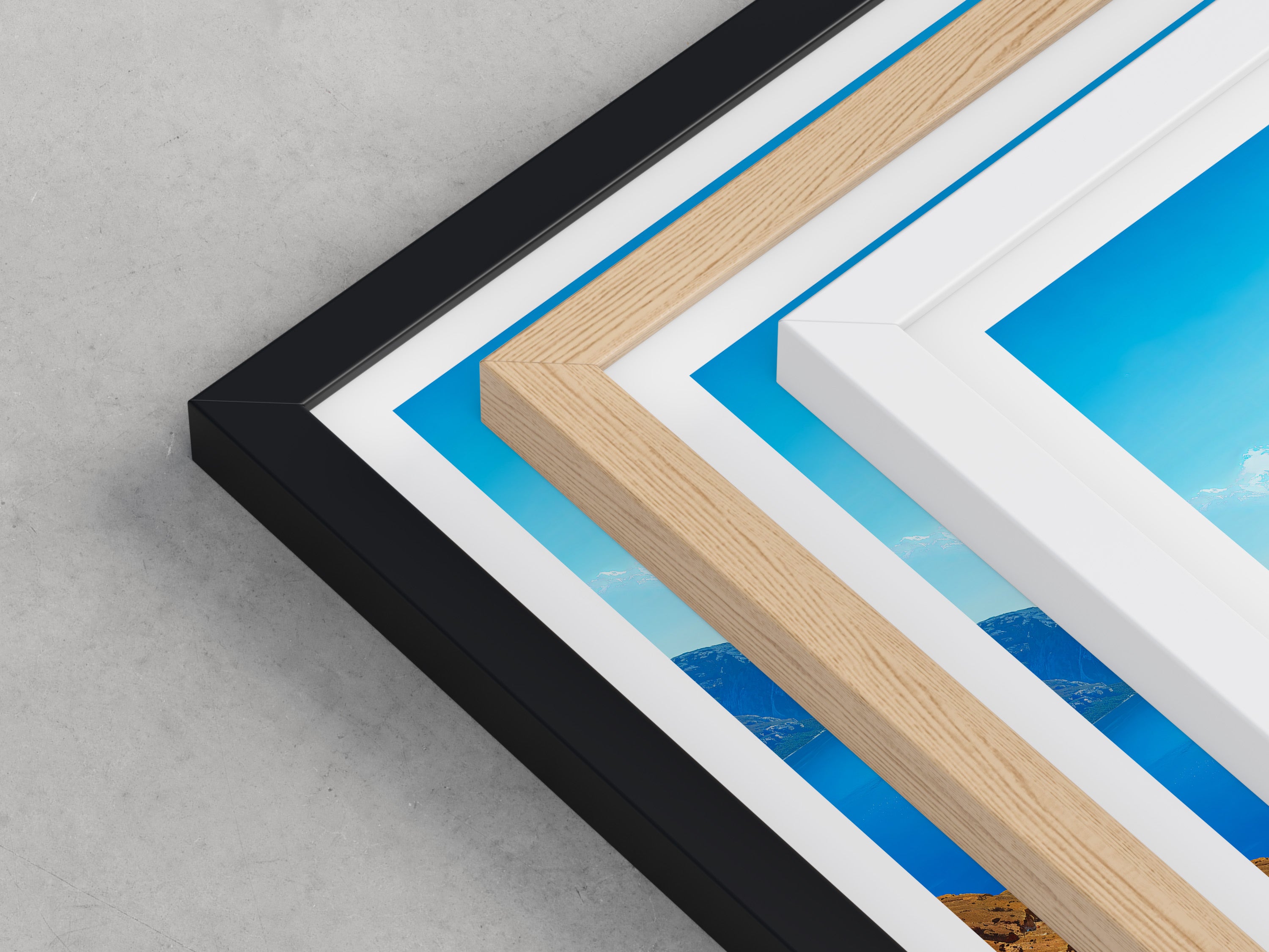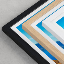 Framed options use sustainably sourced wooden frames in black, white, or natural wood, ready to hang.
