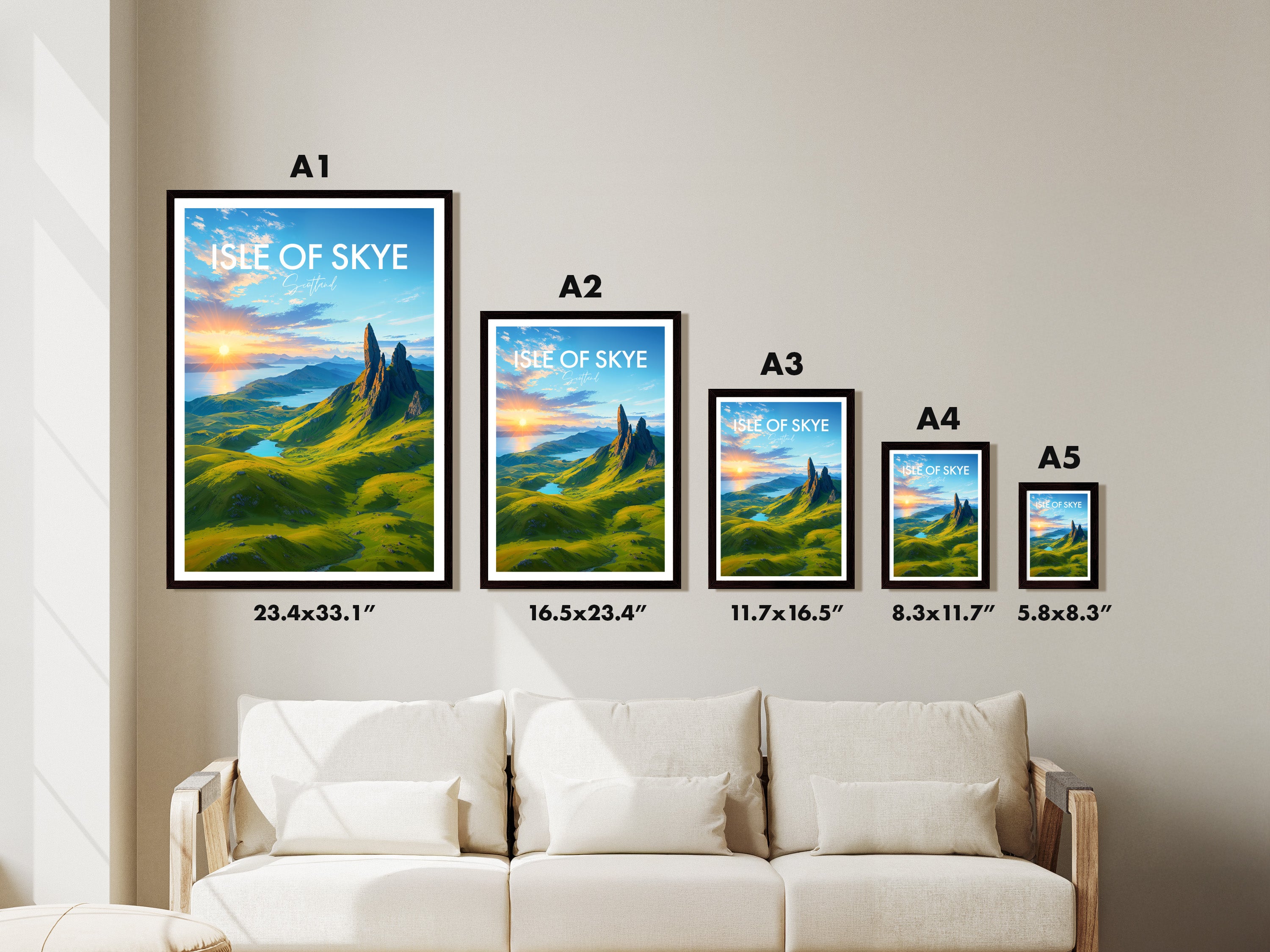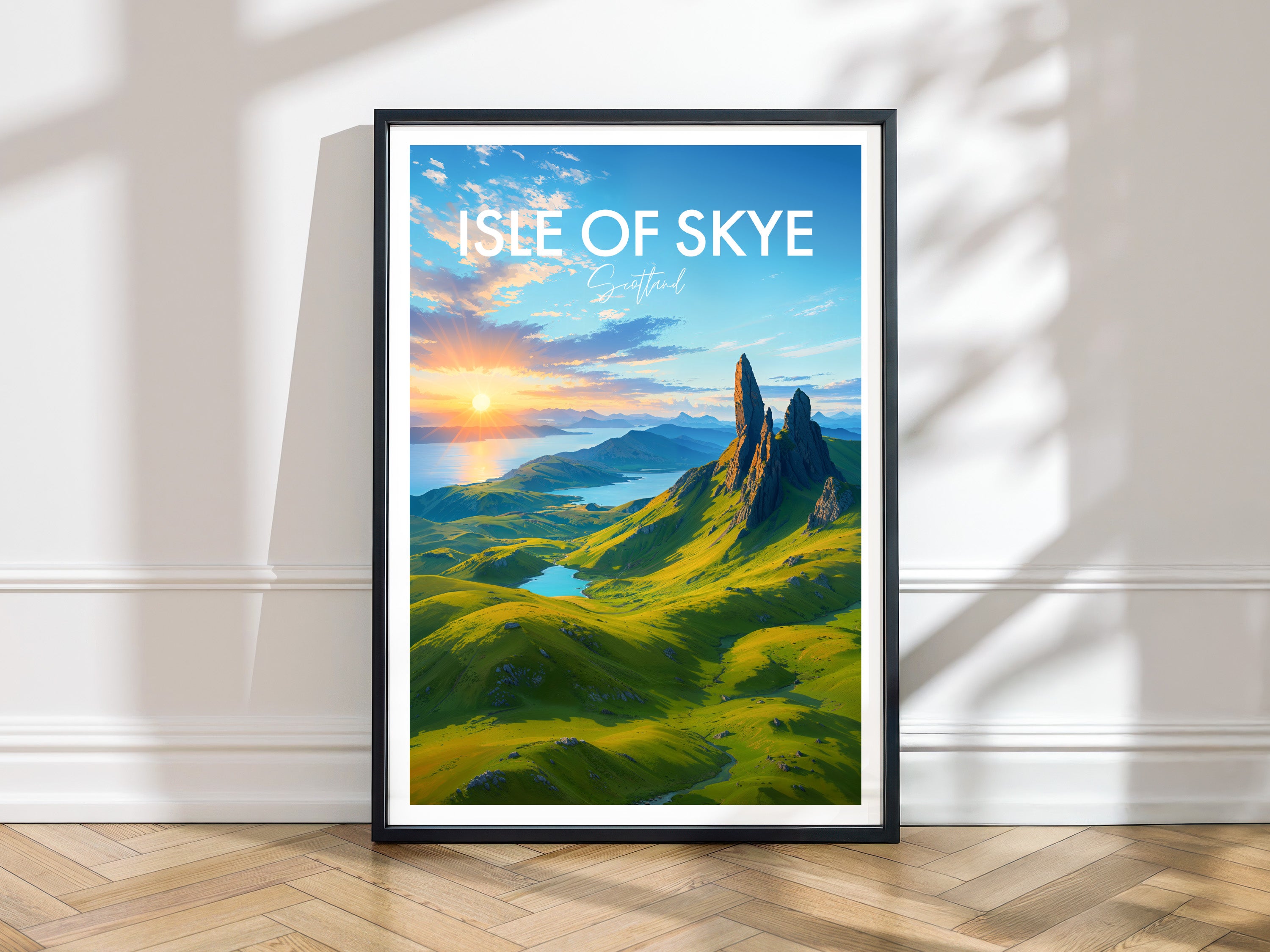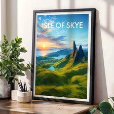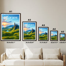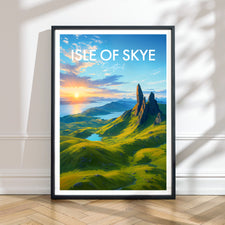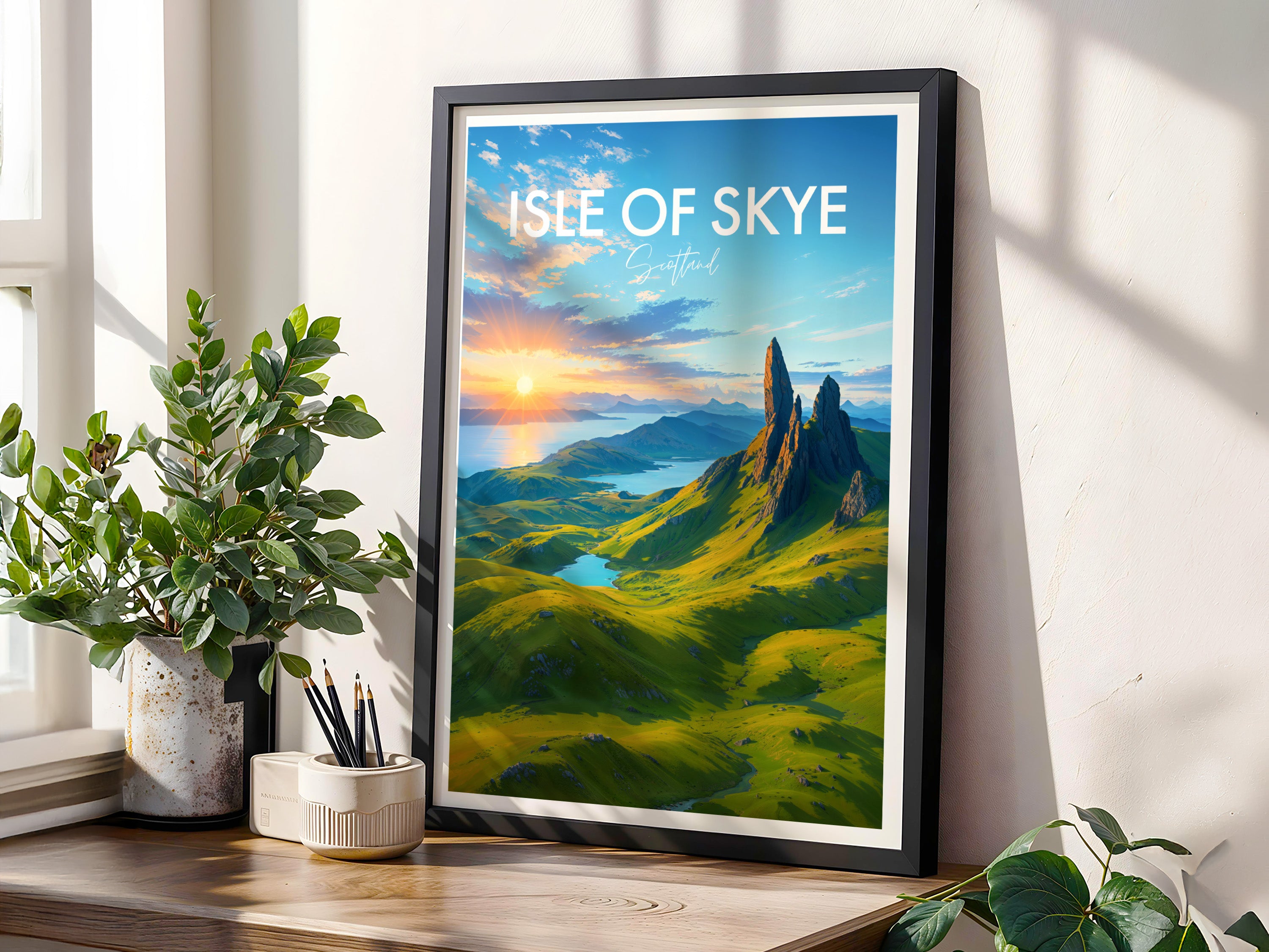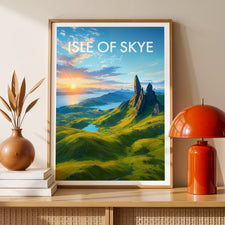 Capture the magnificence of Isle of Skye's mythic landscape with this illustrated poster of Old Man of Storr. Perfect to add a touch of Scottish wilderness to your home.