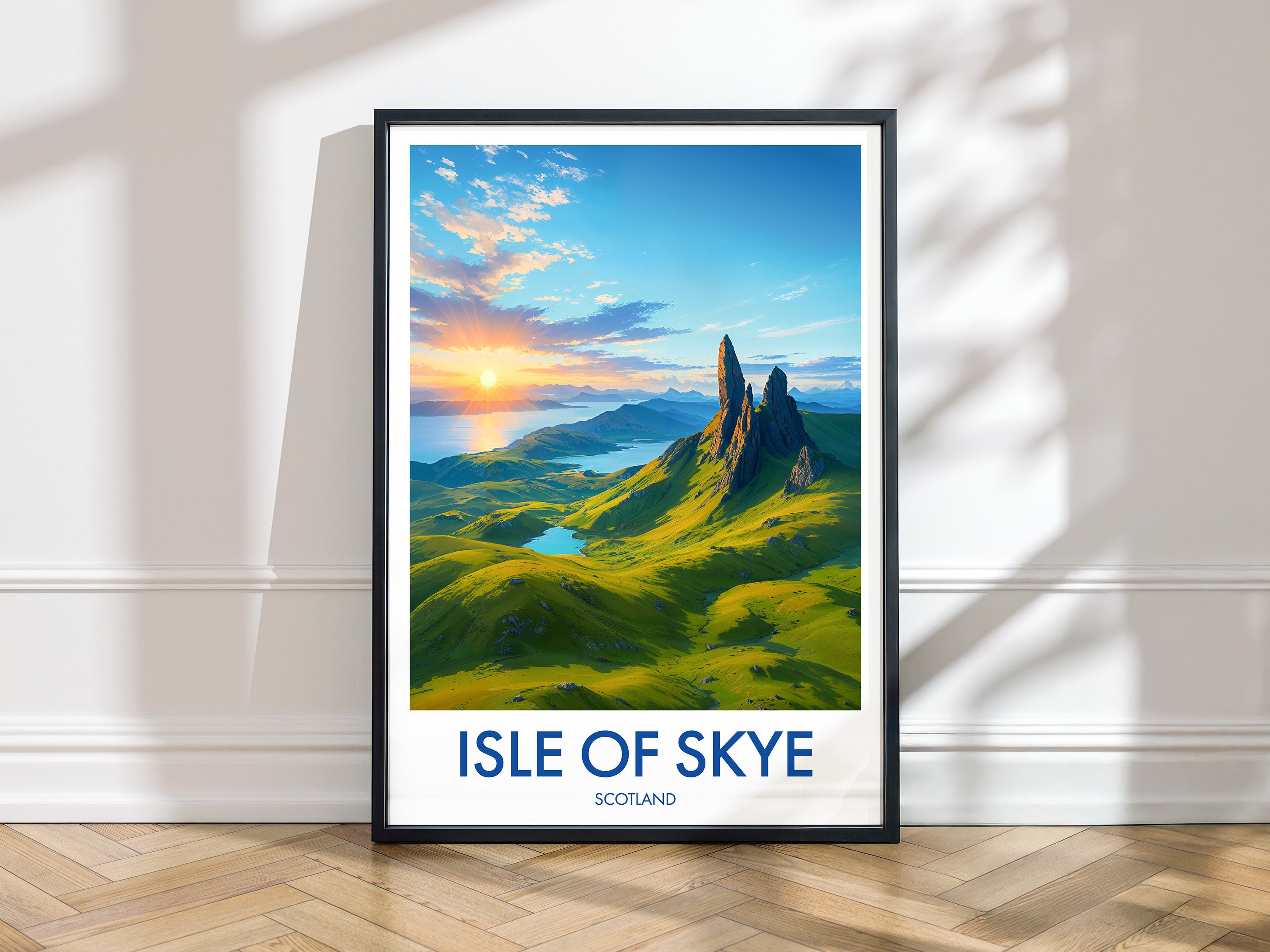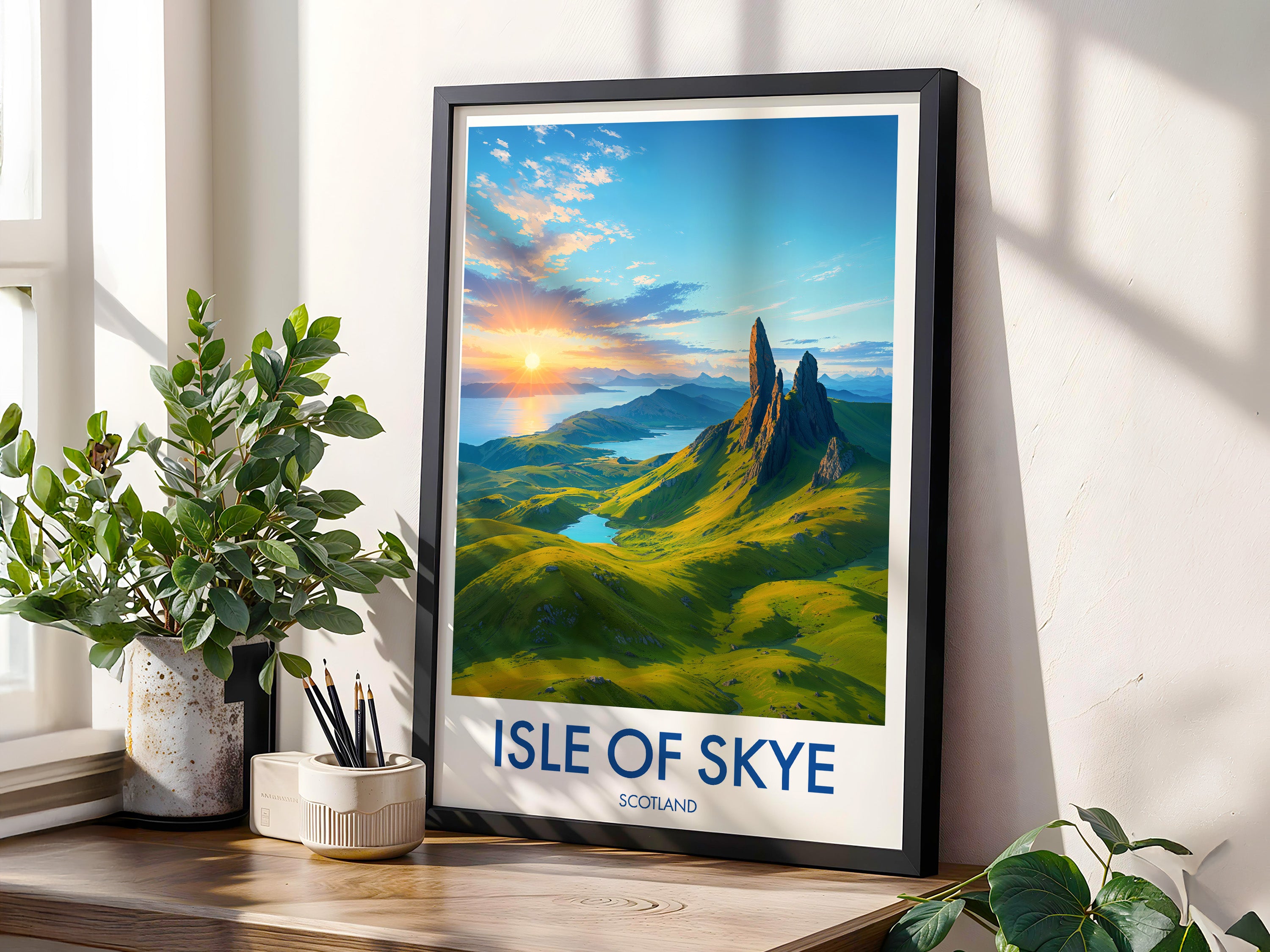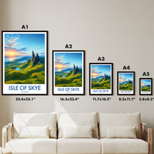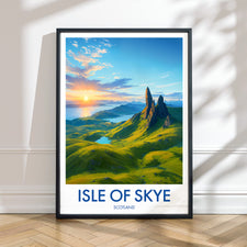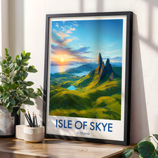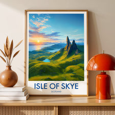 Capture the magnificence of the Isle of Skye's mythic landscape with this illustrated poster of the Old Man of Storr. Perfect to add a touch of Scottish wilderness to your home.