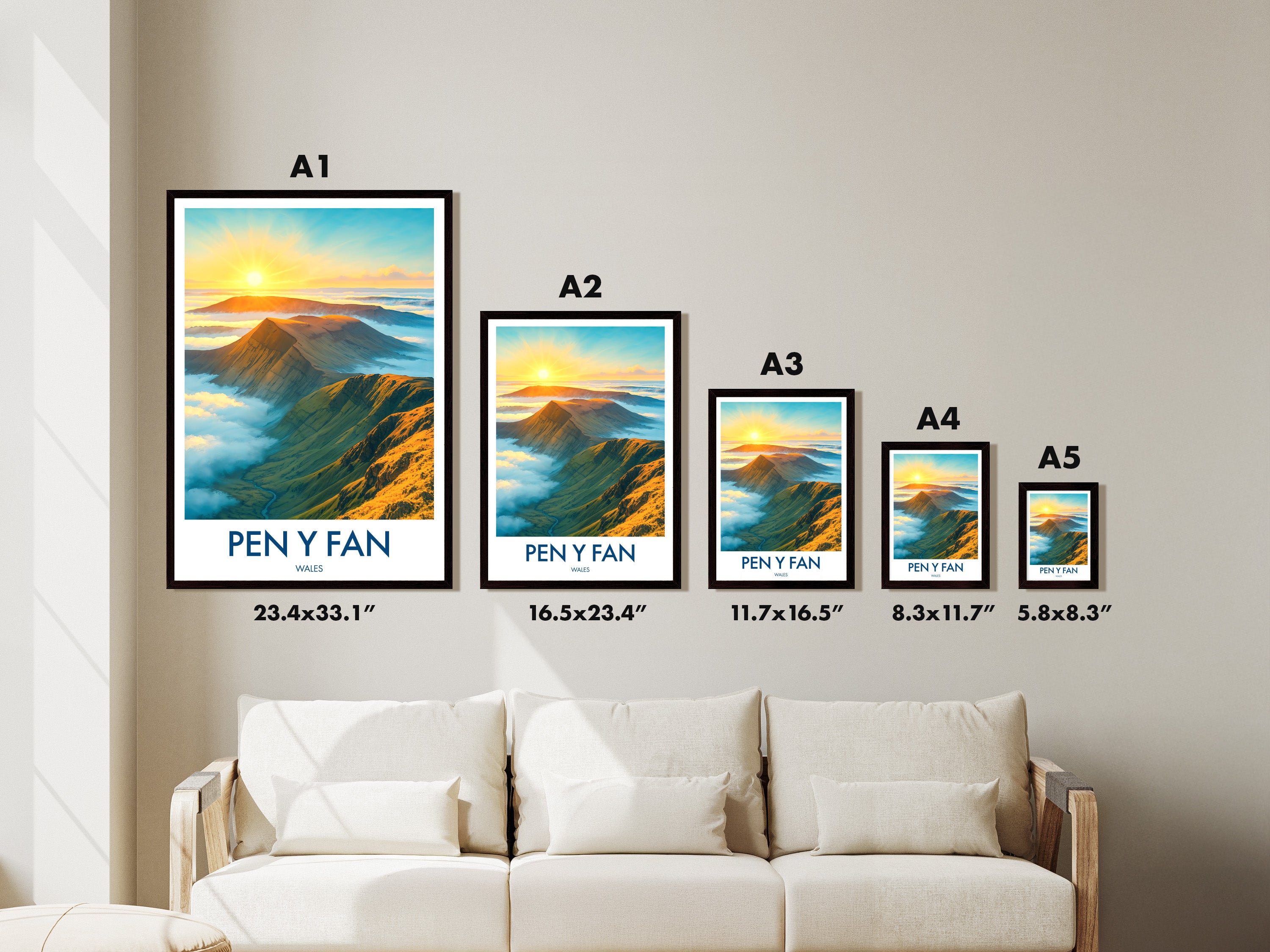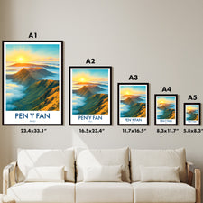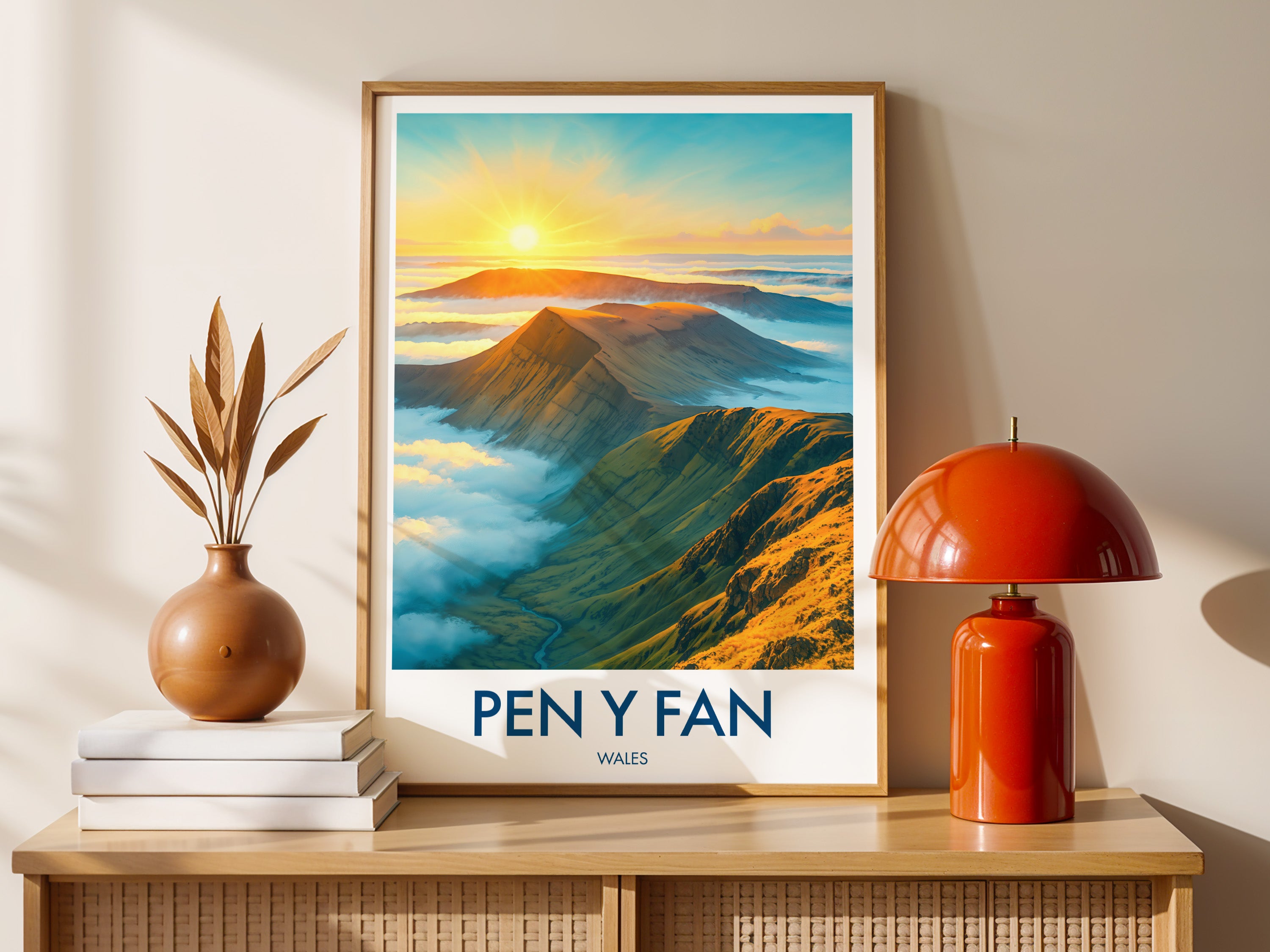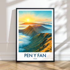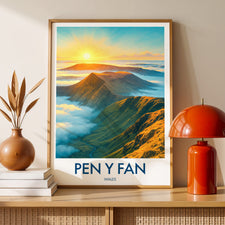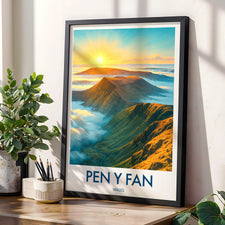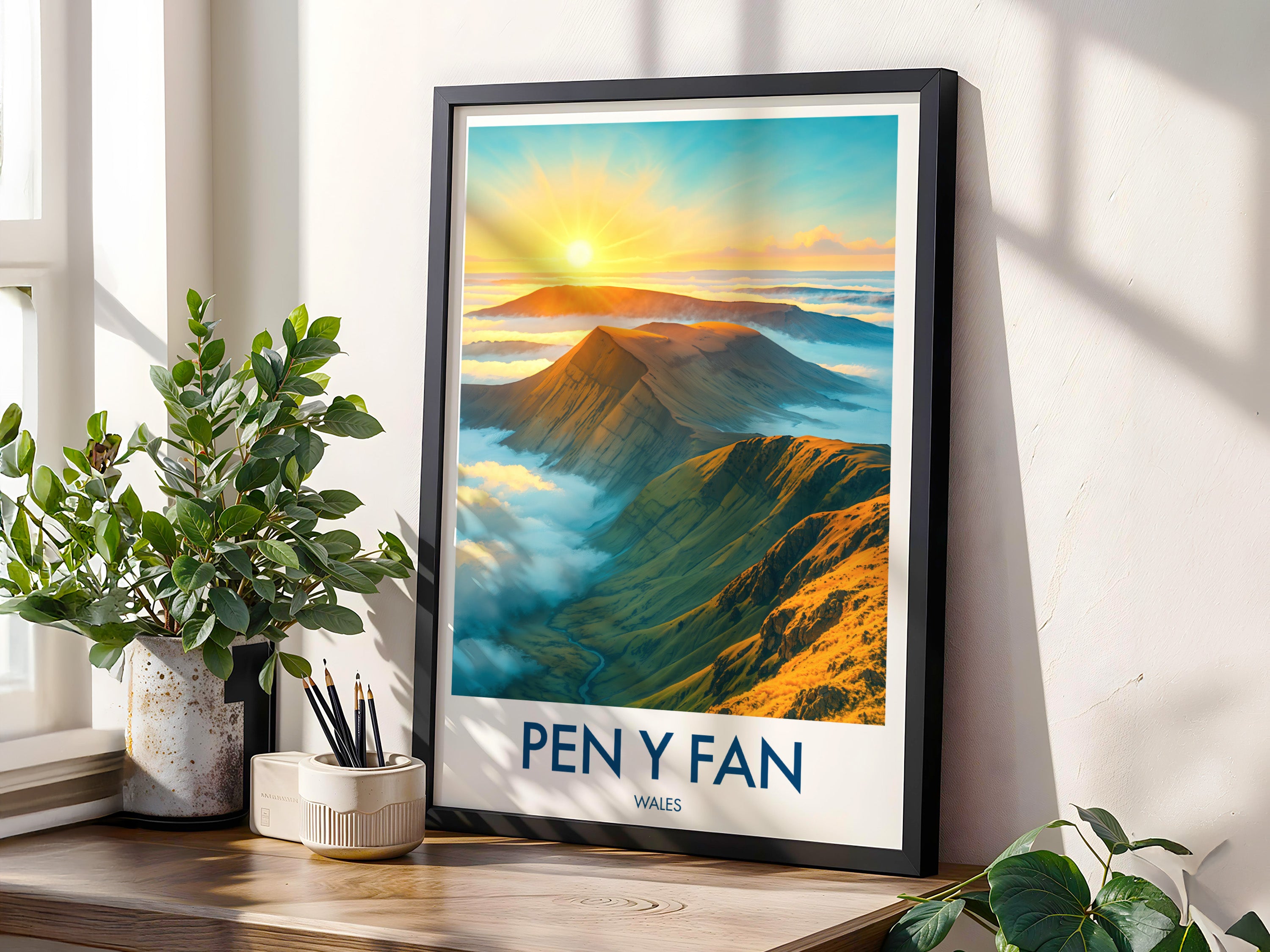 Capture the majestic beauty of Pen y Fan in Brecon Beacons National Park with this travel poster. Perfect for lovers of the Welsh outdoors, National Parks and mountain scenery.