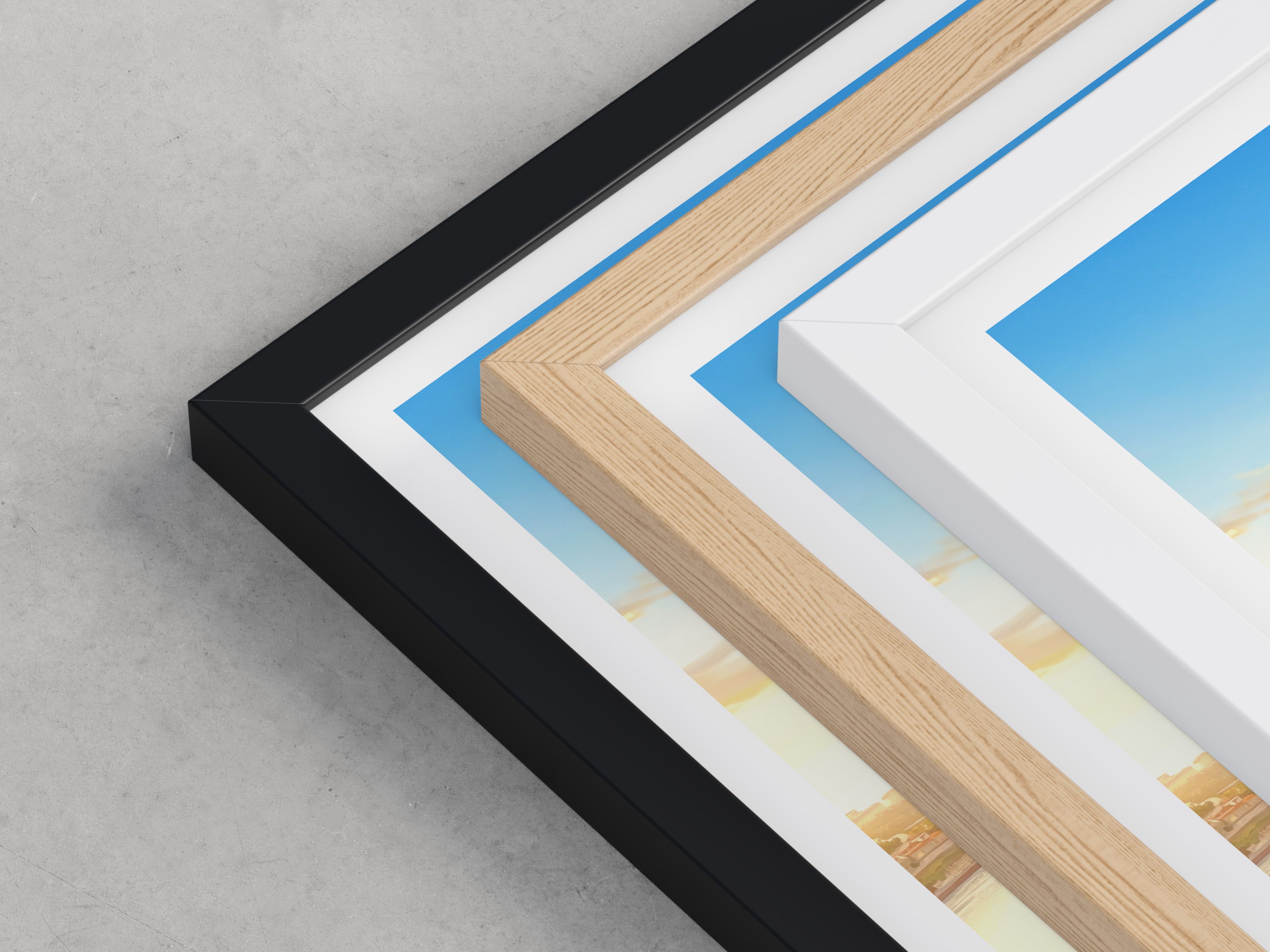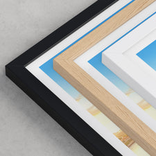 Framed options use sustainably sourced wooden frames in black, white, or natural wood, ready to hang.