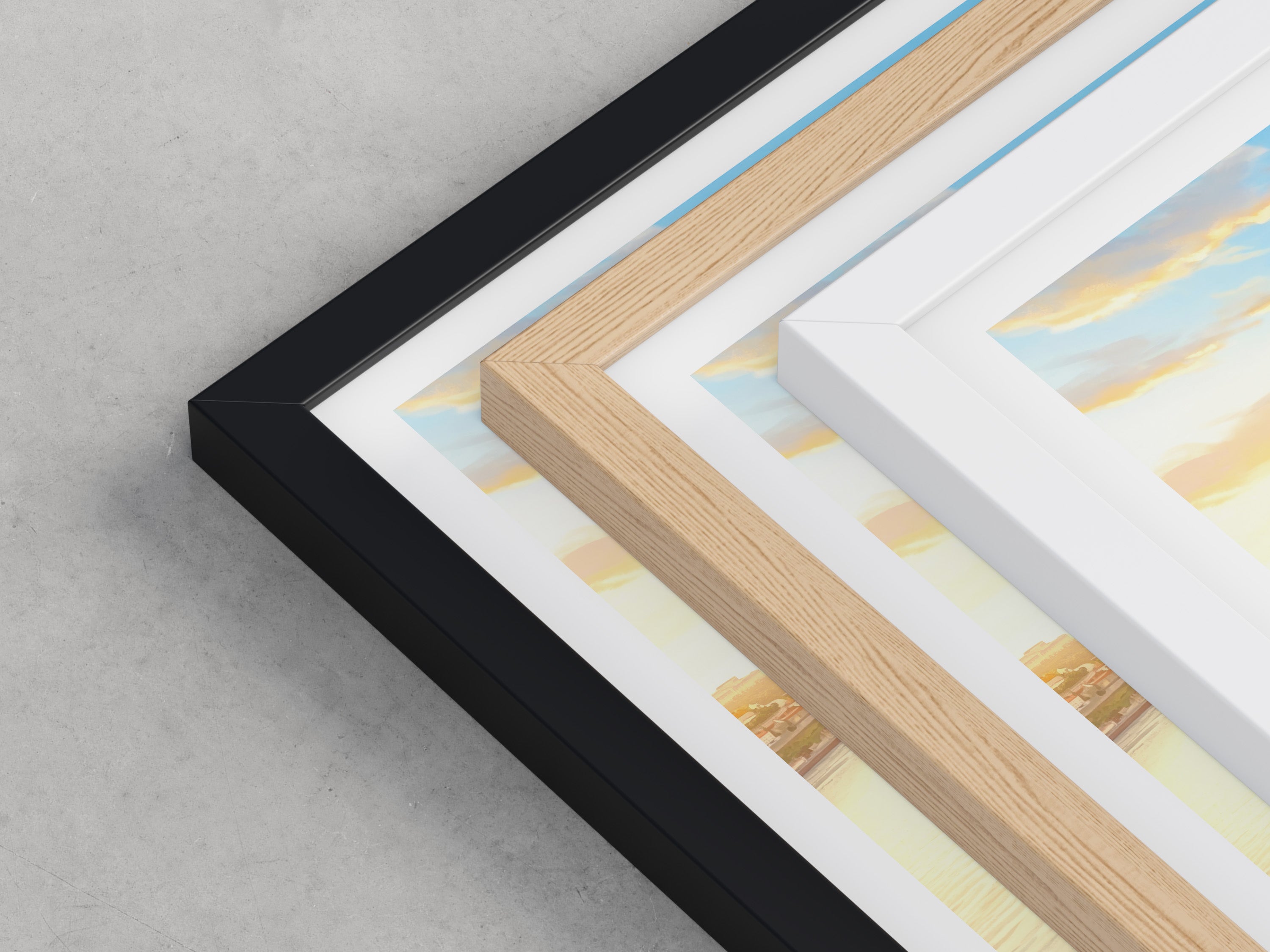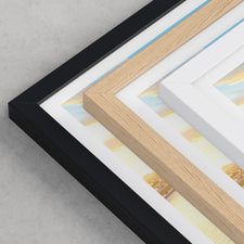 Framed options use sustainably sourced wooden frames in black, white, or natural wood, ready to hang.
