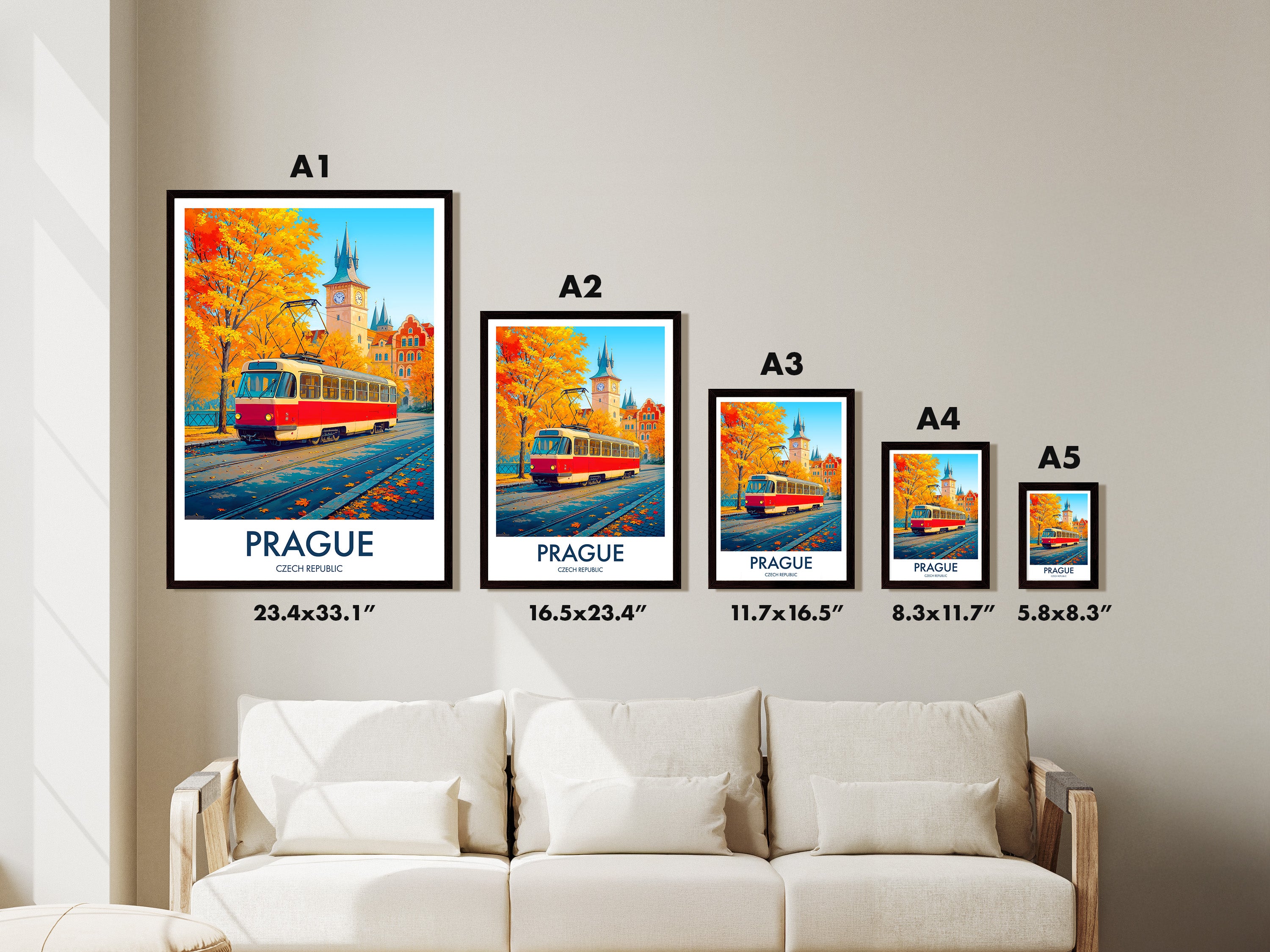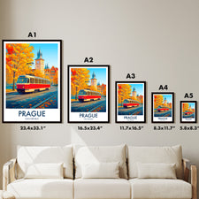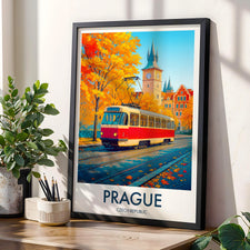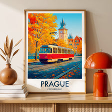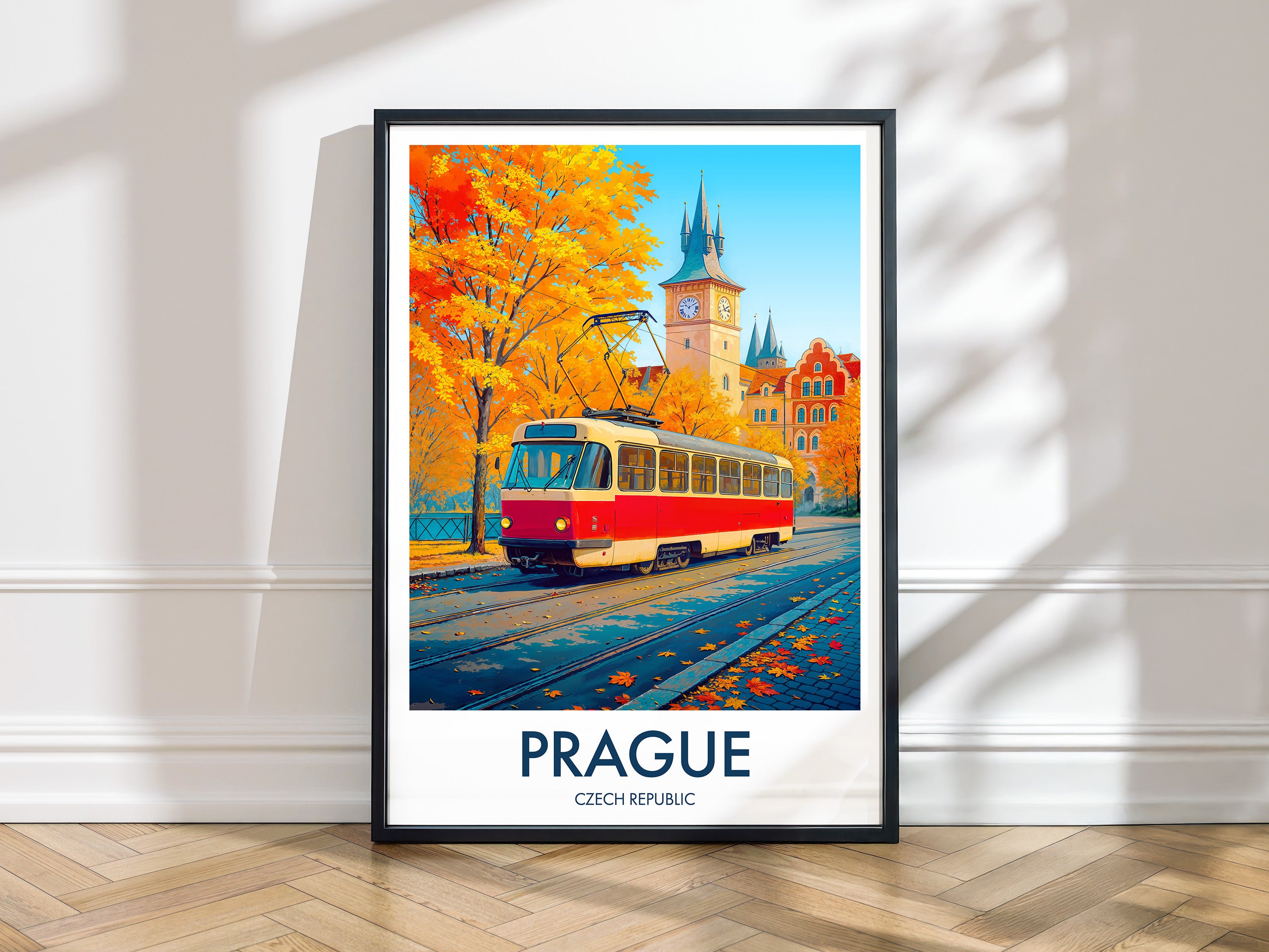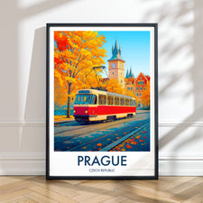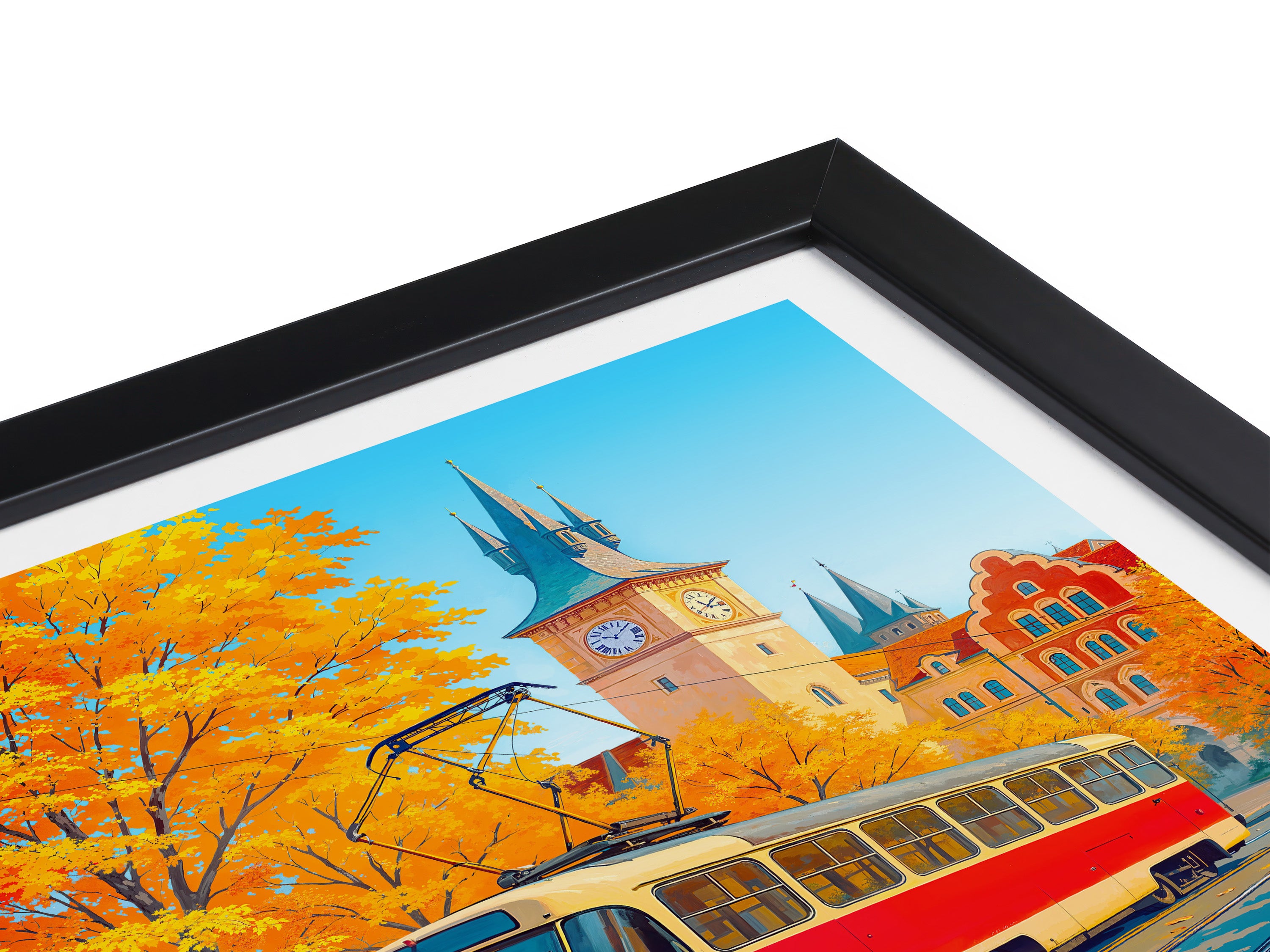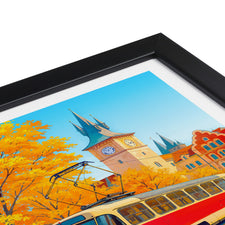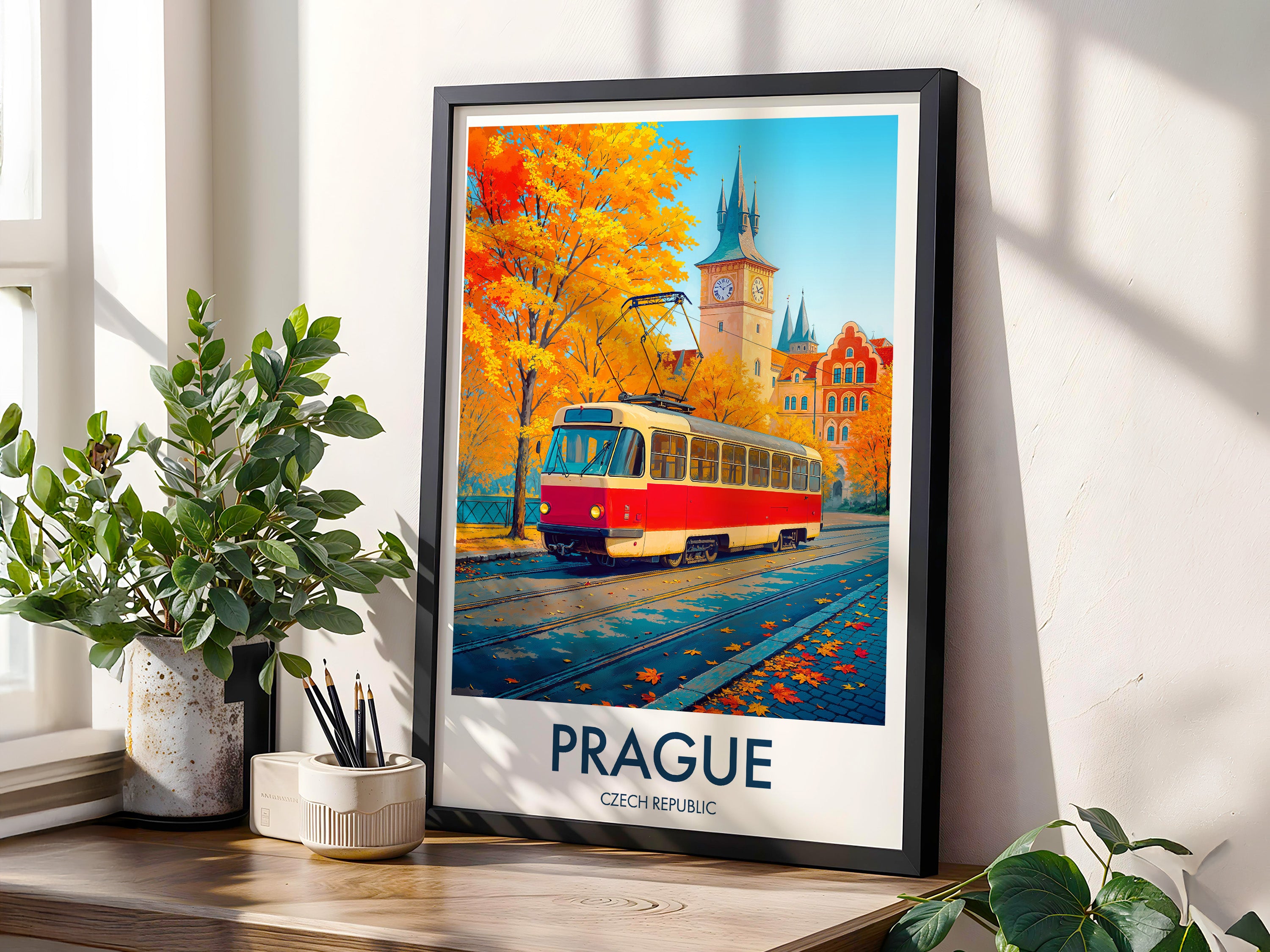 Capture the essence of Prague with this charming illustrated print, featuring an iconic tram passing through the historic streets awash with autumn colours.