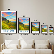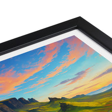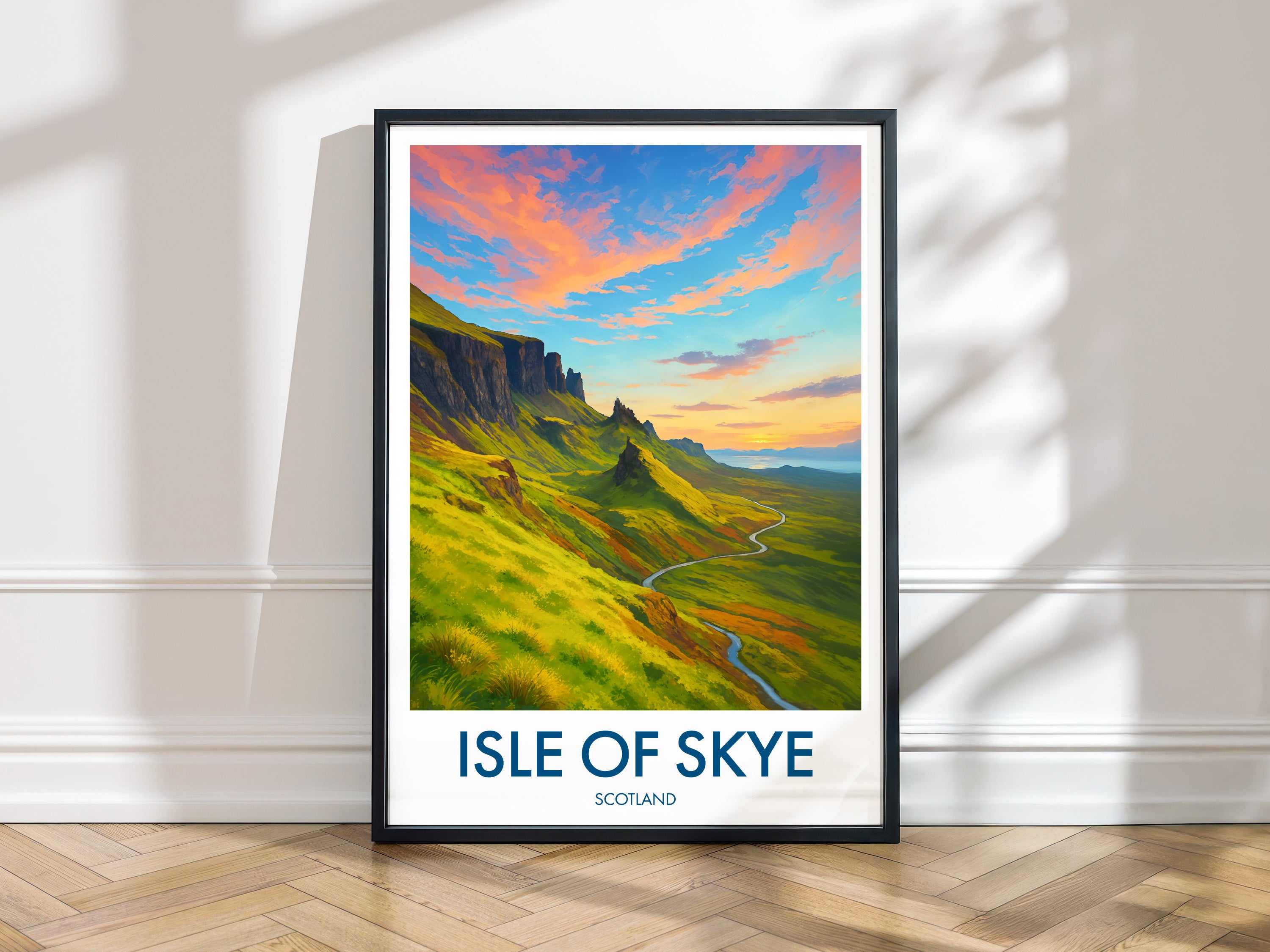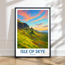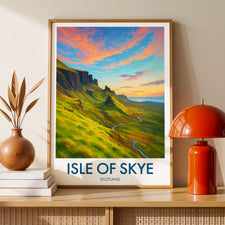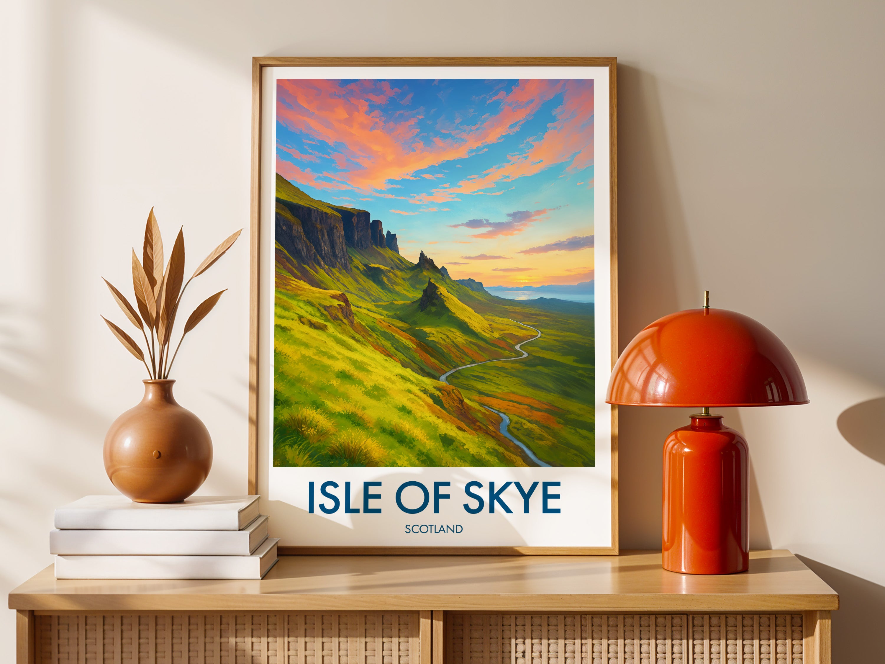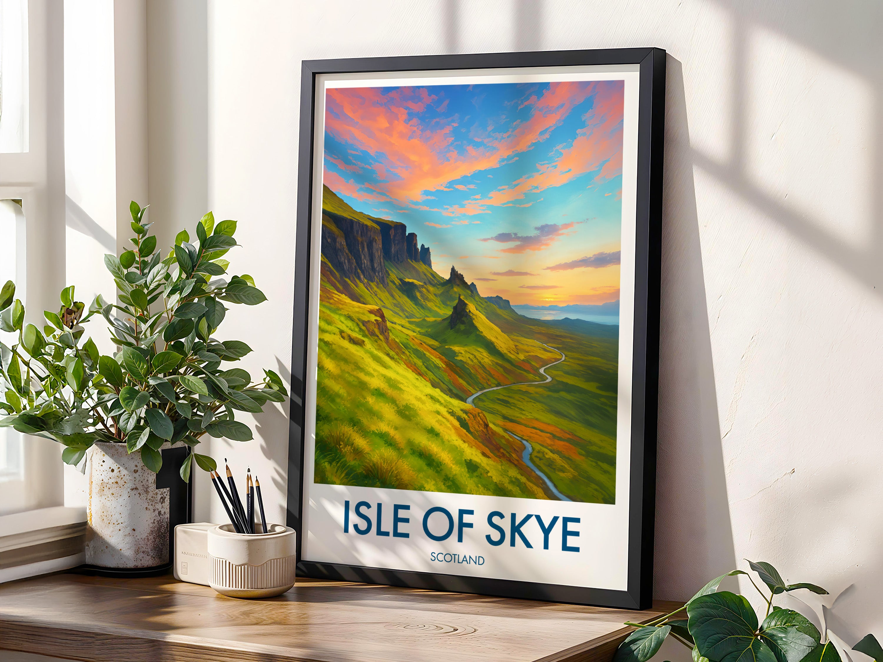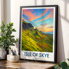 Rolling green slopes and jagged cliffs define the Quiraing on the Isle of Skye. This illustrated print captures the drama and colour of one of Scotland’s most spectacular landscapes.
