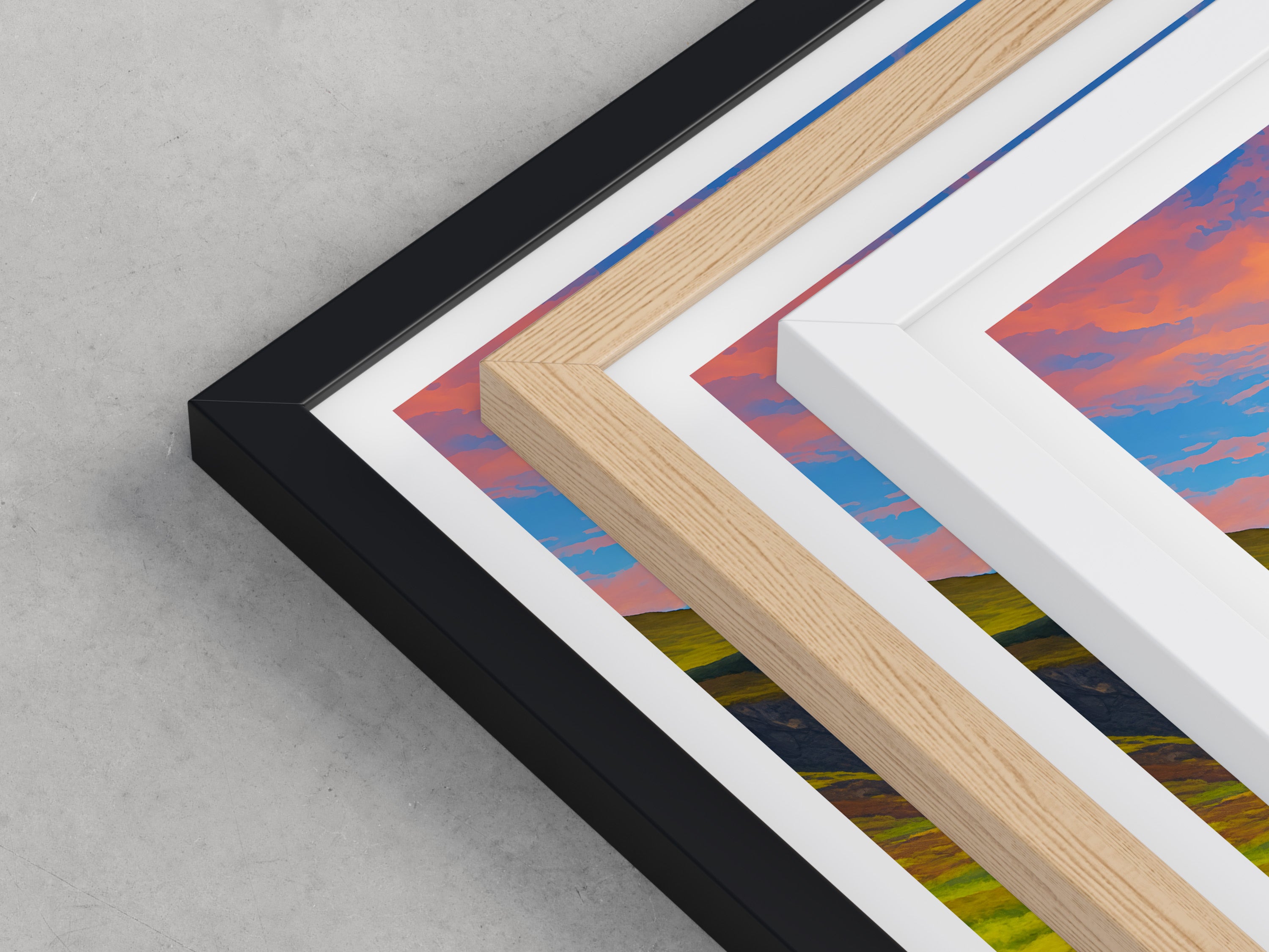 Framed options use sustainably sourced wooden frames in black, white, or natural wood, ready to hang.