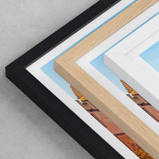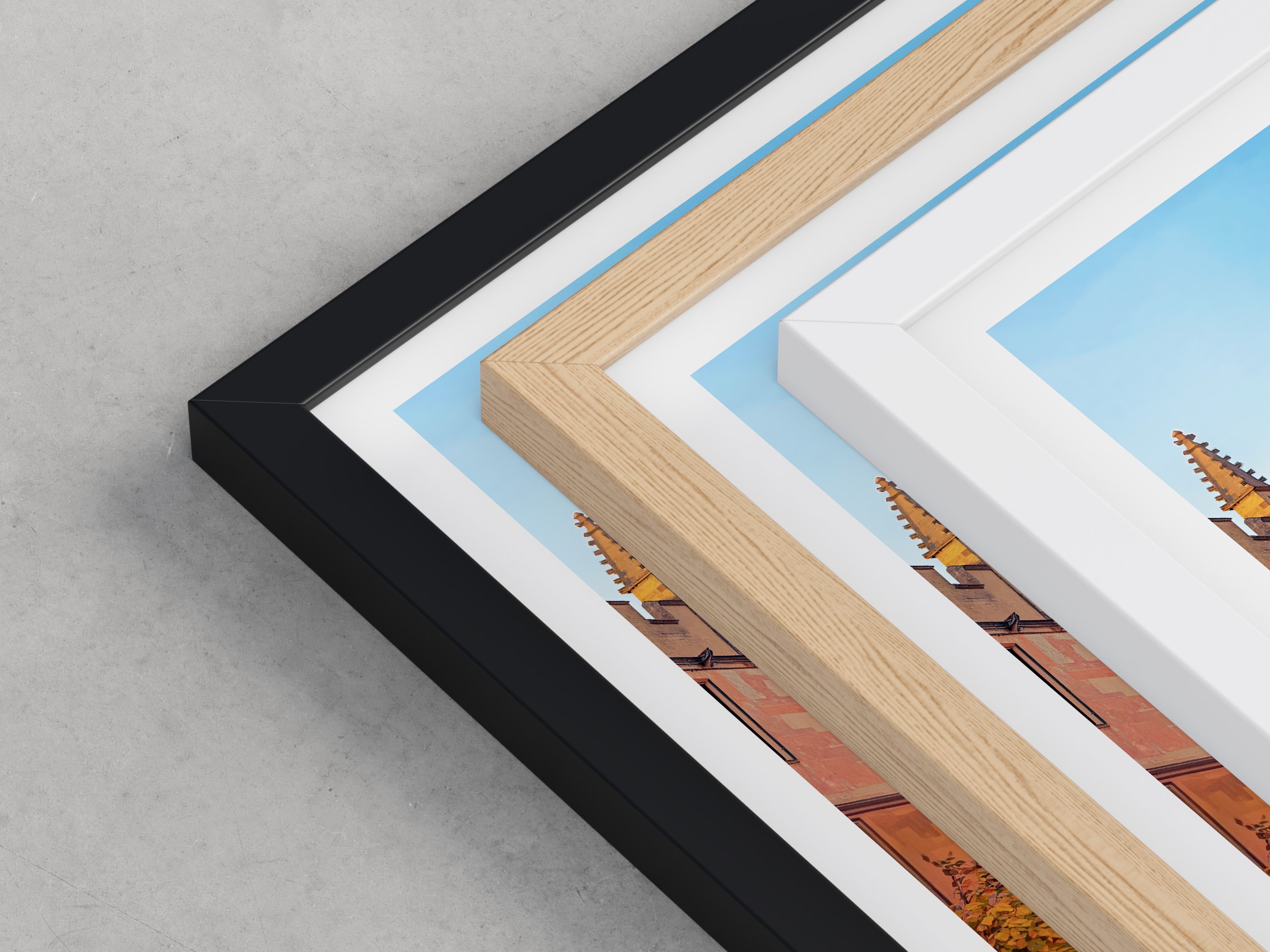 Framed options use sustainably sourced wooden frames in black, white, or natural wood, ready to hang.