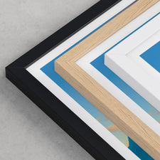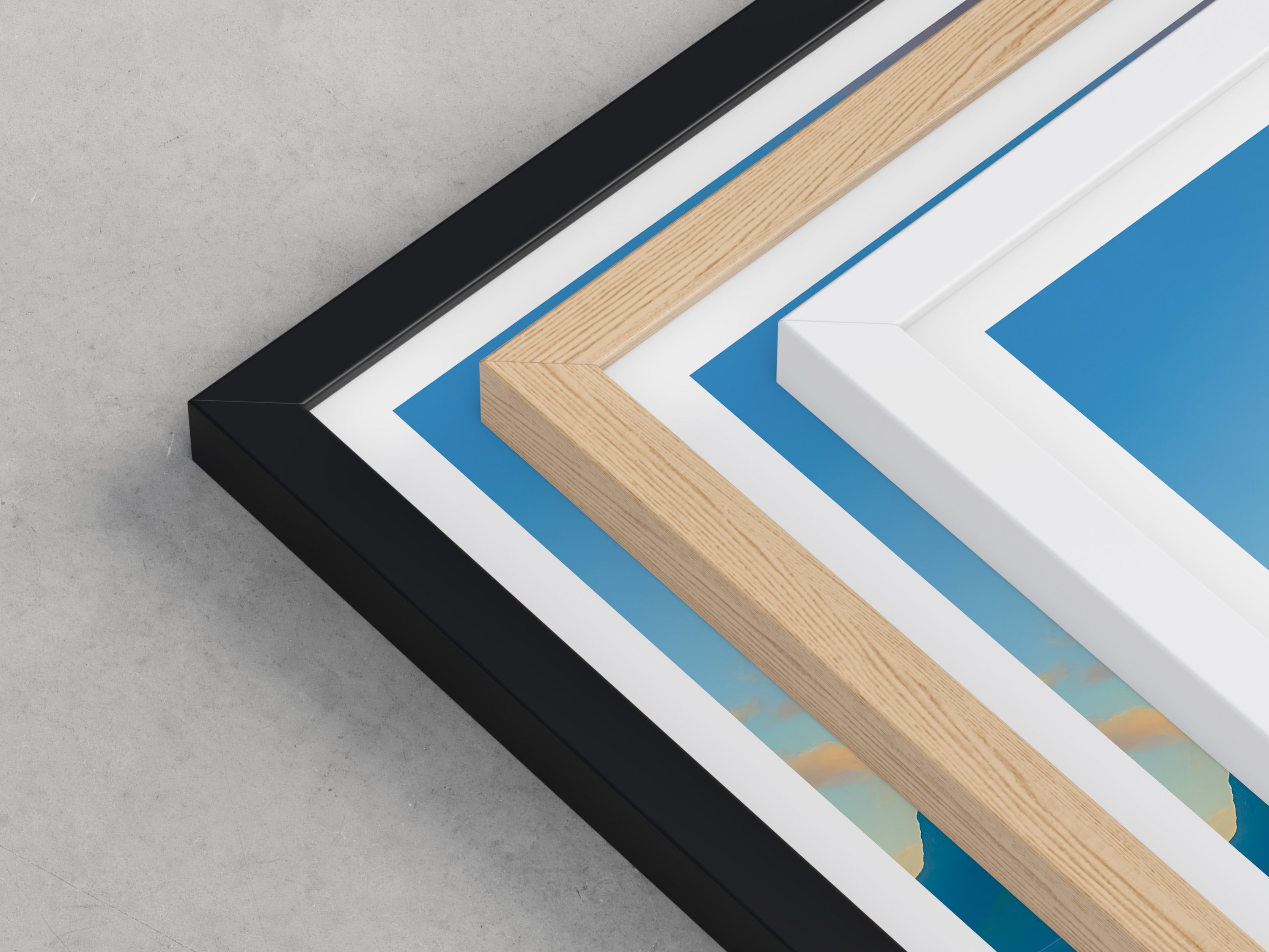 Framed options use sustainably sourced wooden frames in black, white, or natural wood, ready to hang.