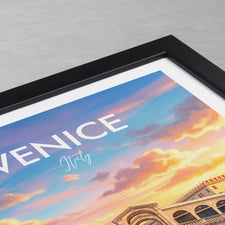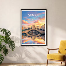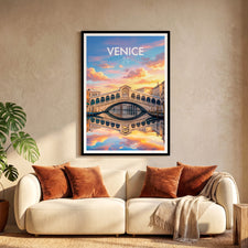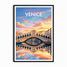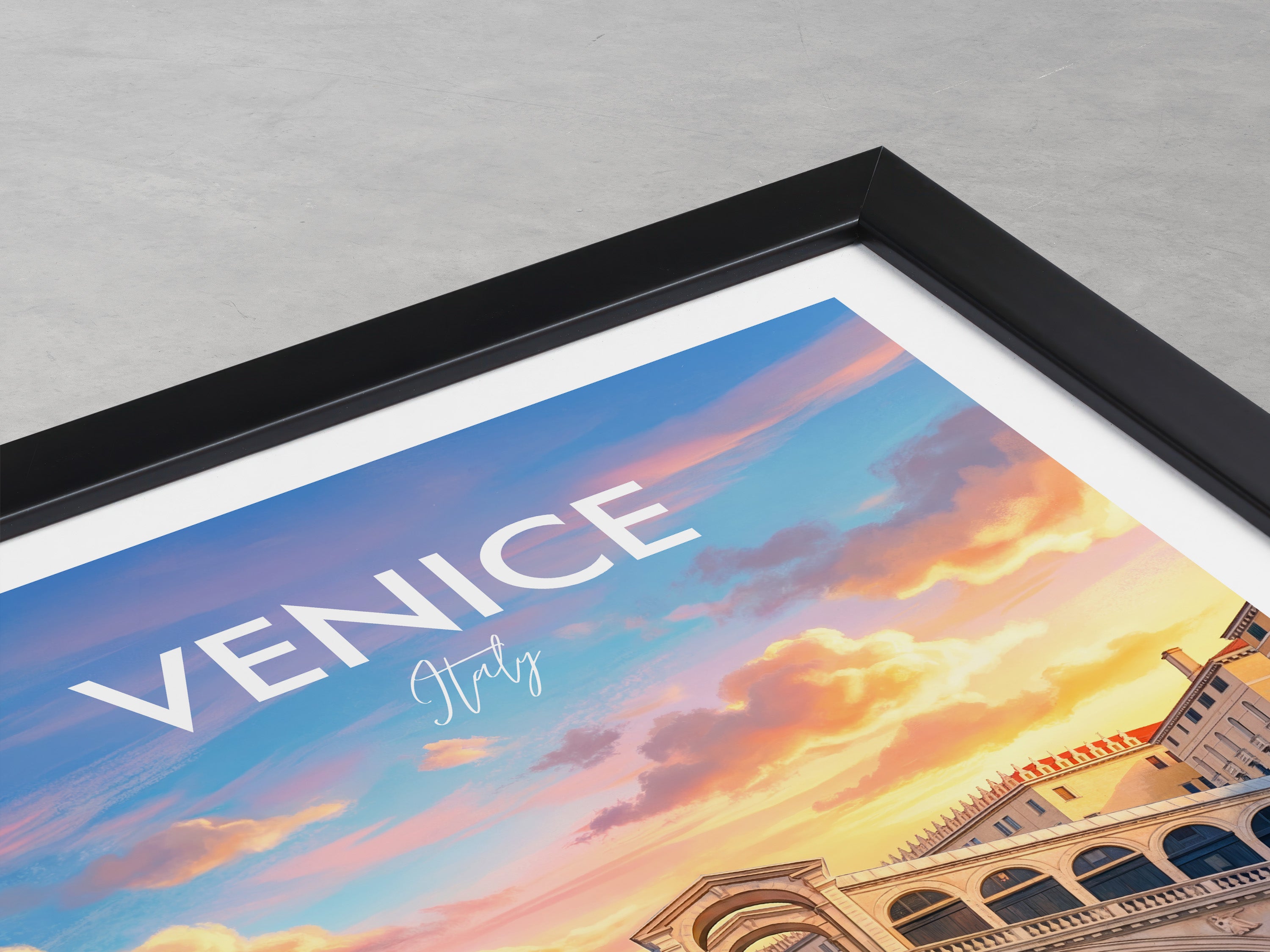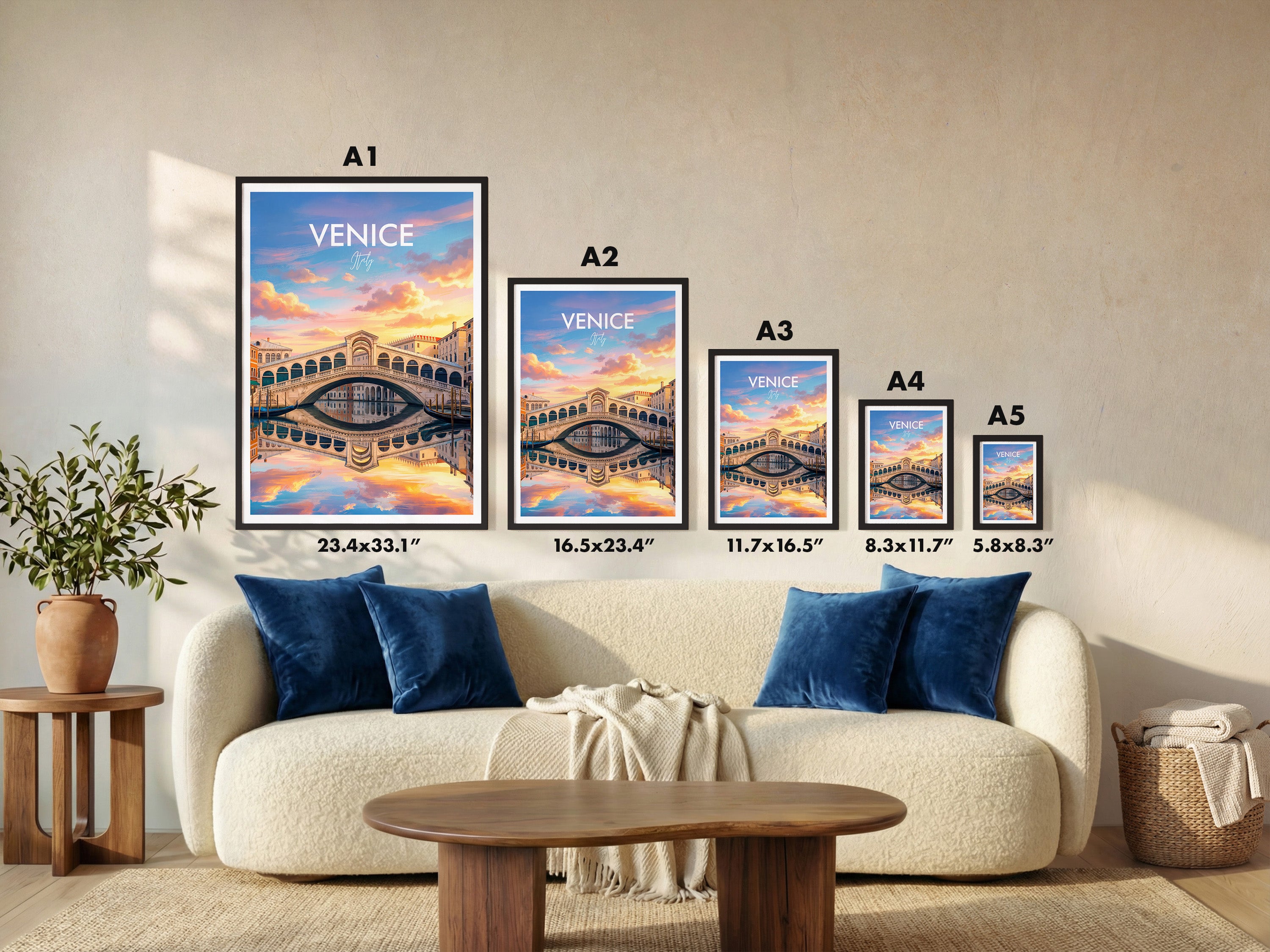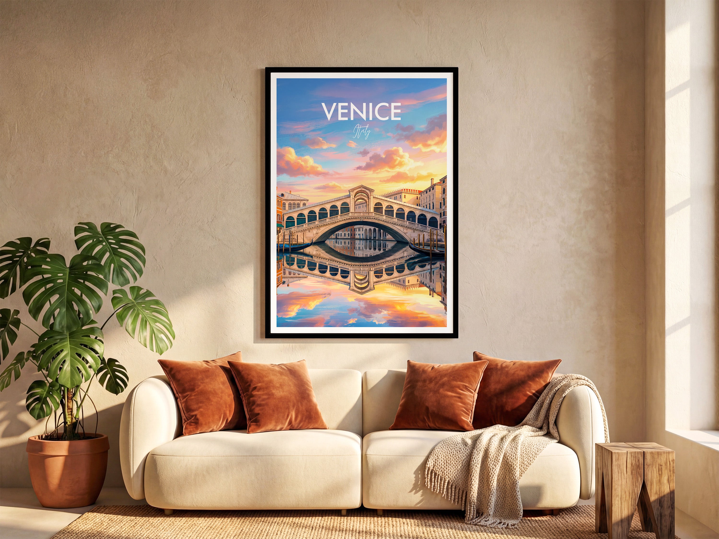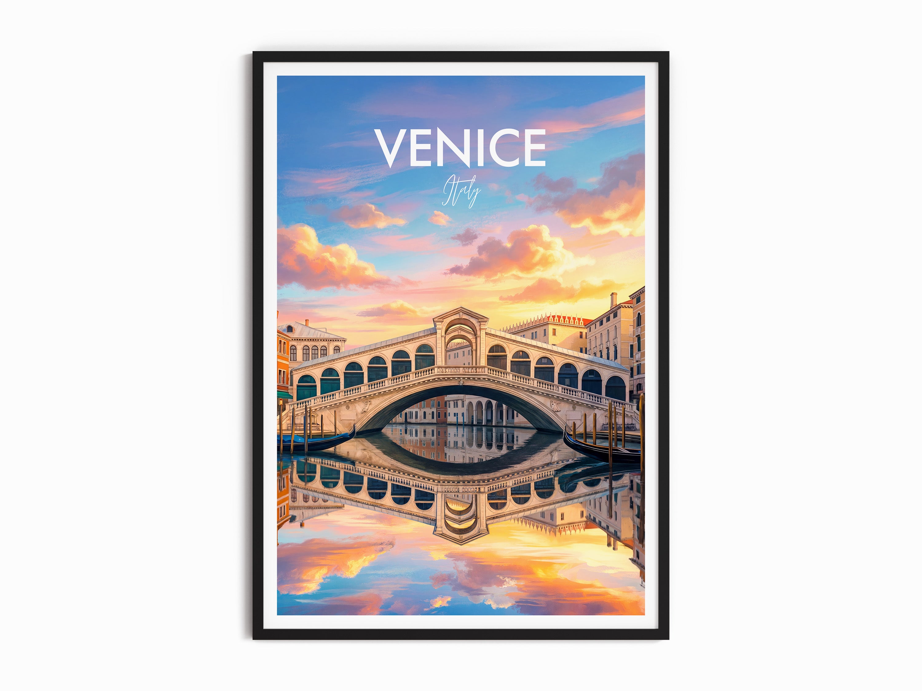 Experience the timeless beauty of Venice with this Rialto Bridge print. Featuring Italy’s iconic landmark and the Grand Canal, this travel poster adds a touch of Venetian charm to your home. Ideal as a thoughtful gift or as an elegant wall art piece, this unique design celebrates the romance and rich history of Italy.