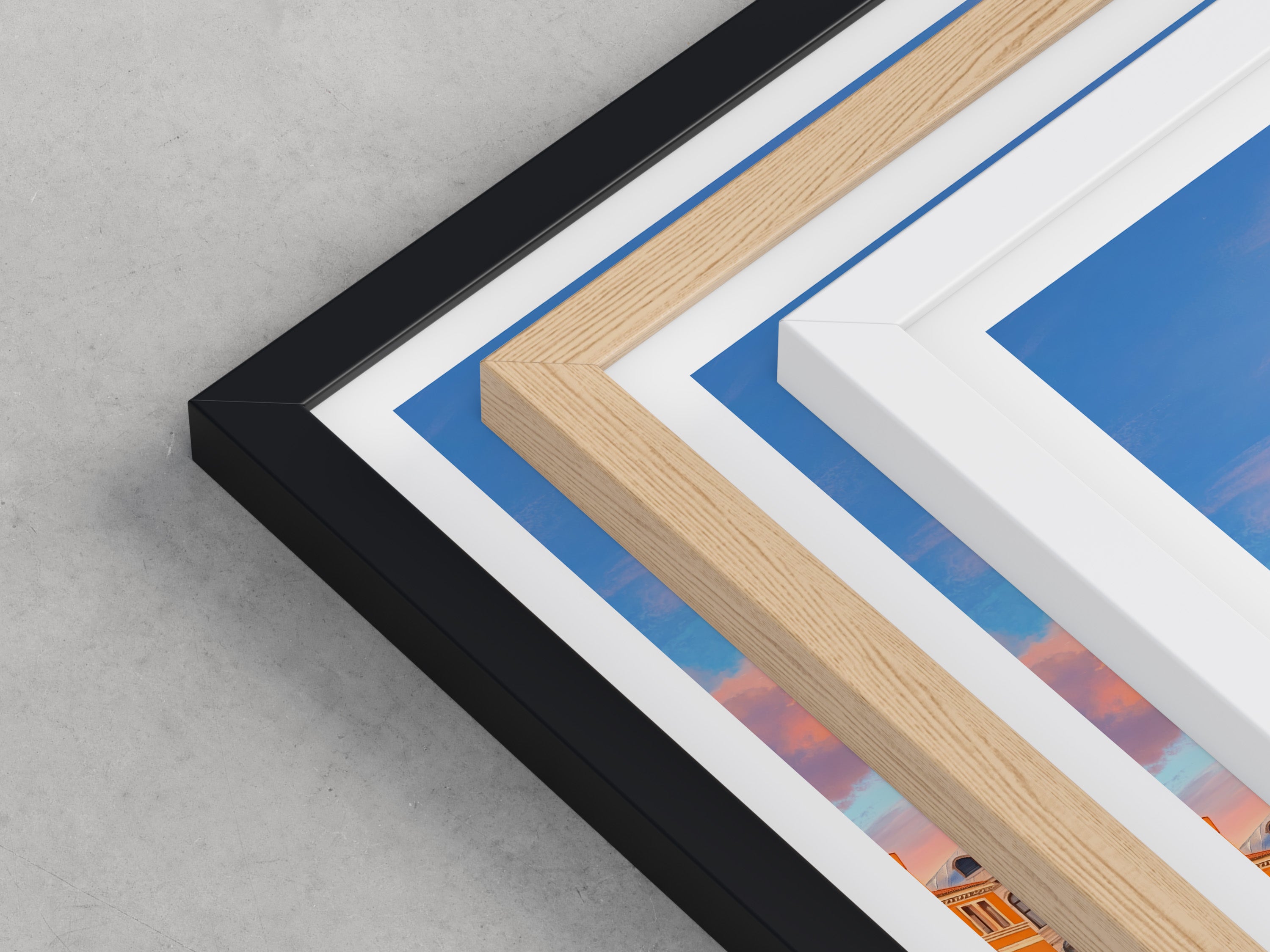 Framed options use sustainably sourced wooden frames in black, white, or natural wood, ready to hang.
