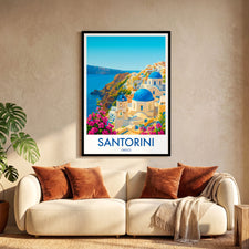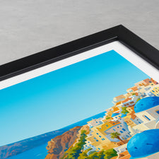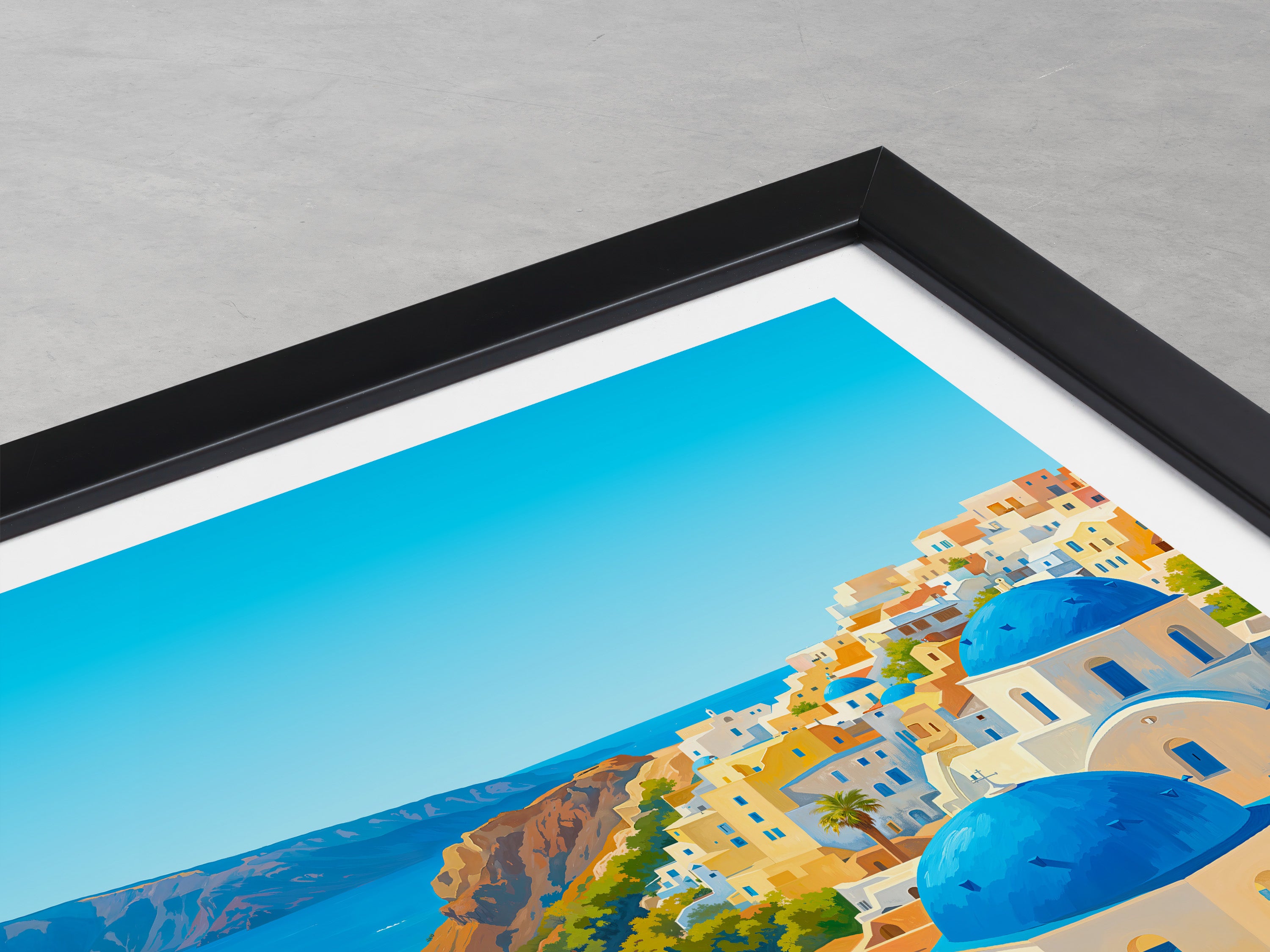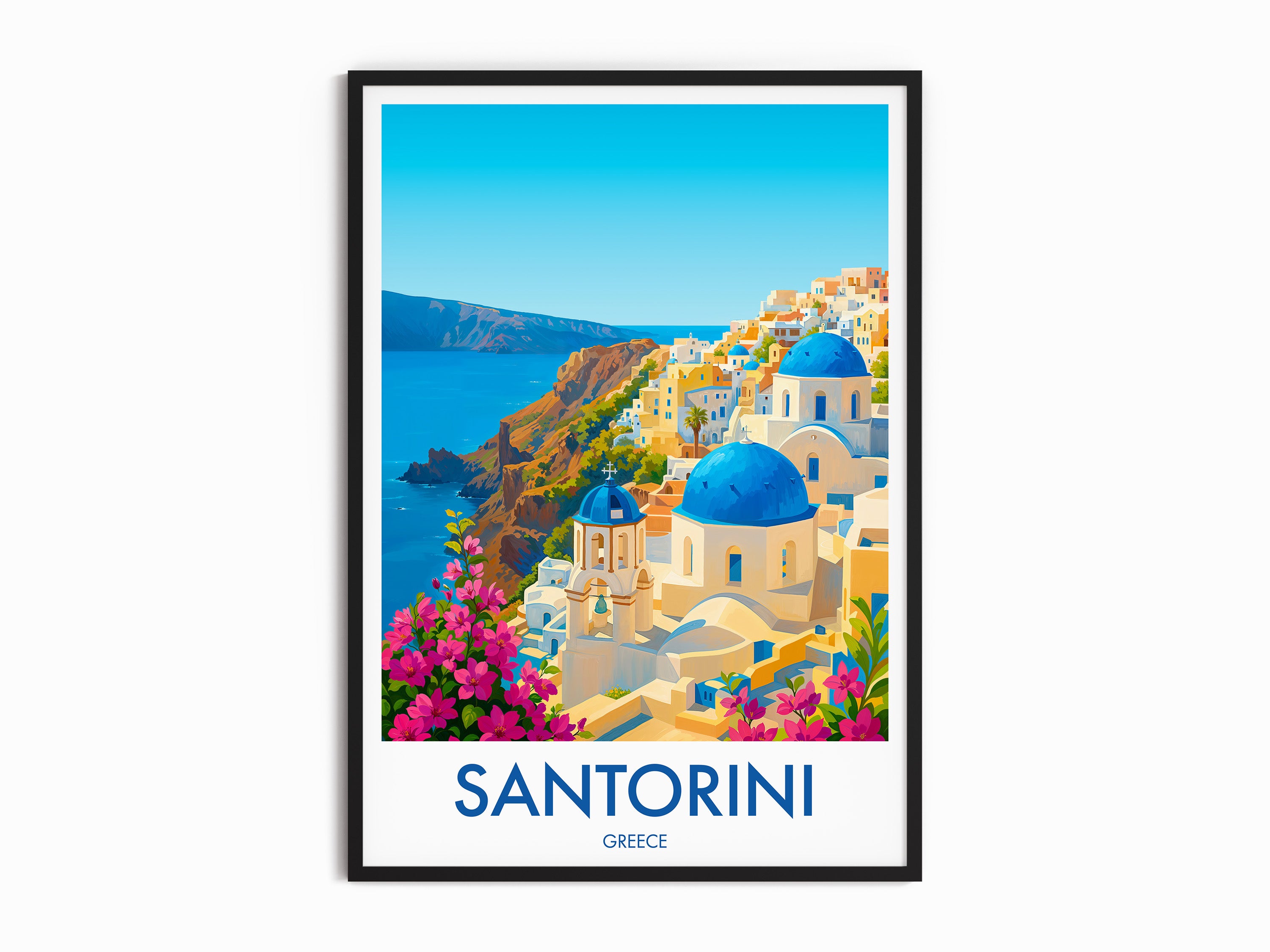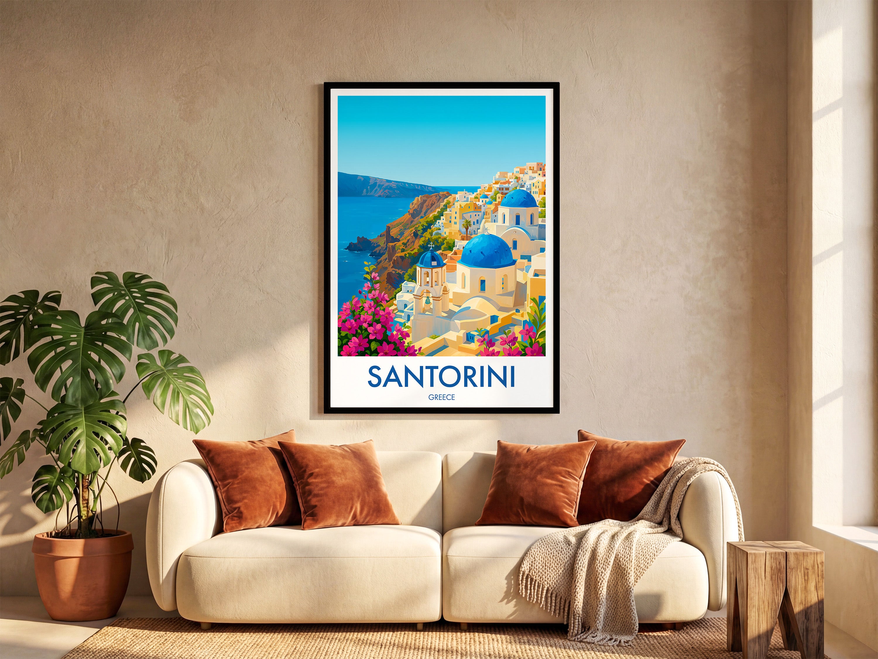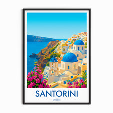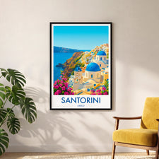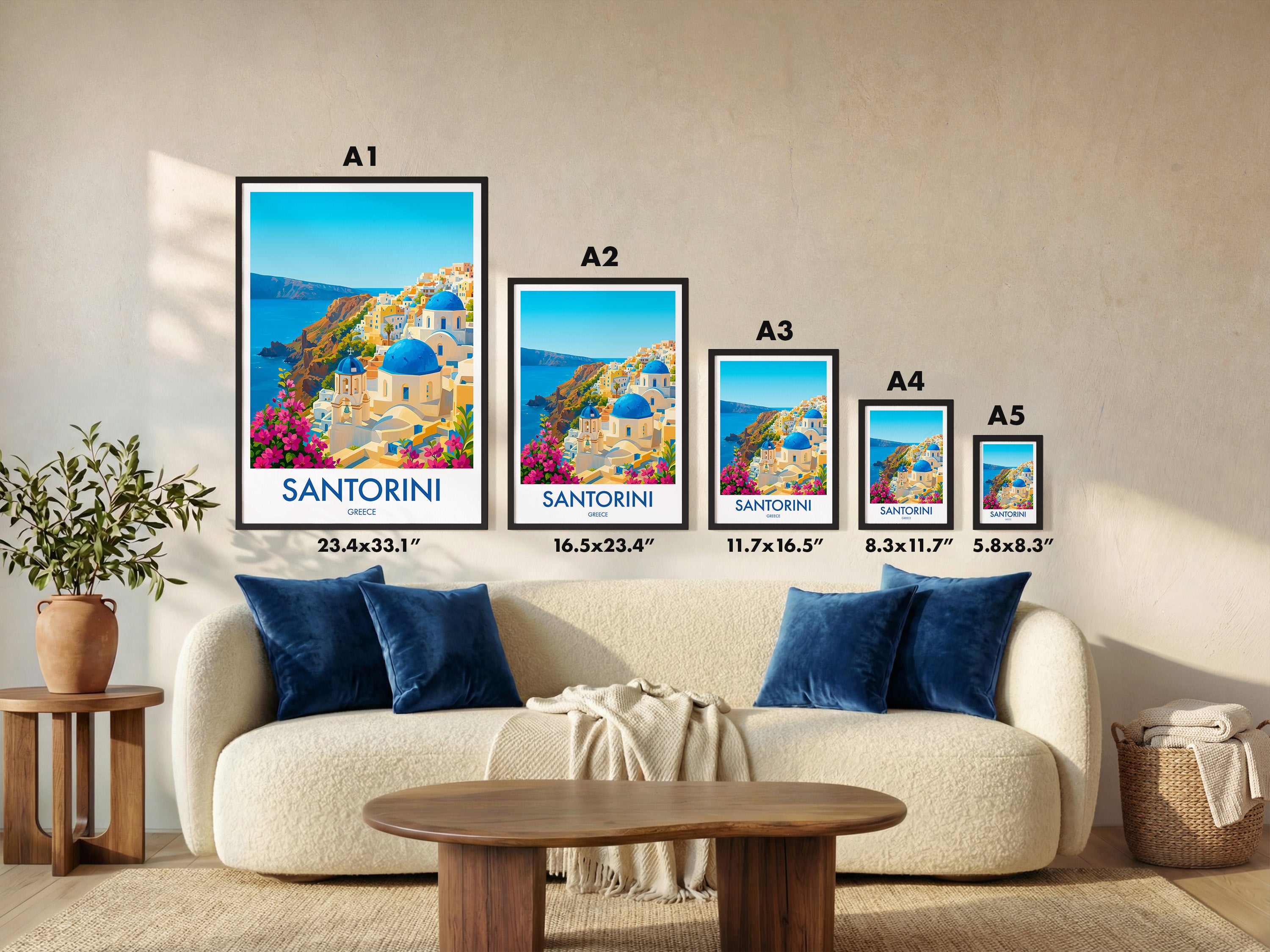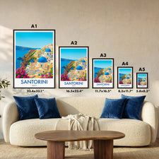 Capture the allure of Santorini with this vibrant print featuring Oia's iconic blue-domed churches and sun-drenched cliffs. Perfect for adding a Mediterranean touch to any room.