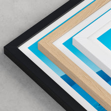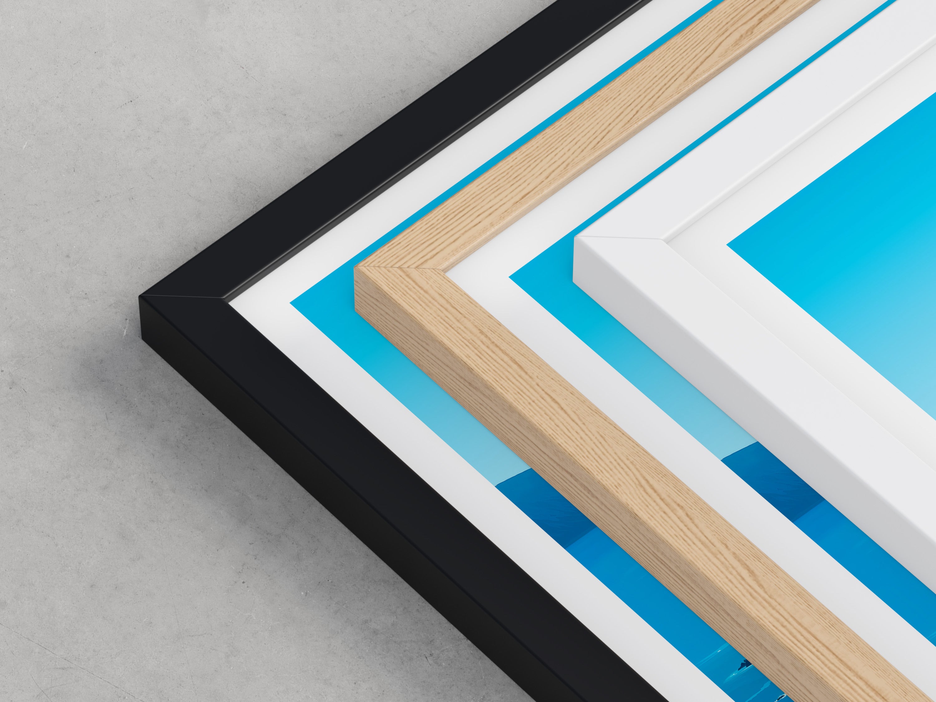 Framed options use sustainably sourced wooden frames in black, white, or natural wood, ready to hang.