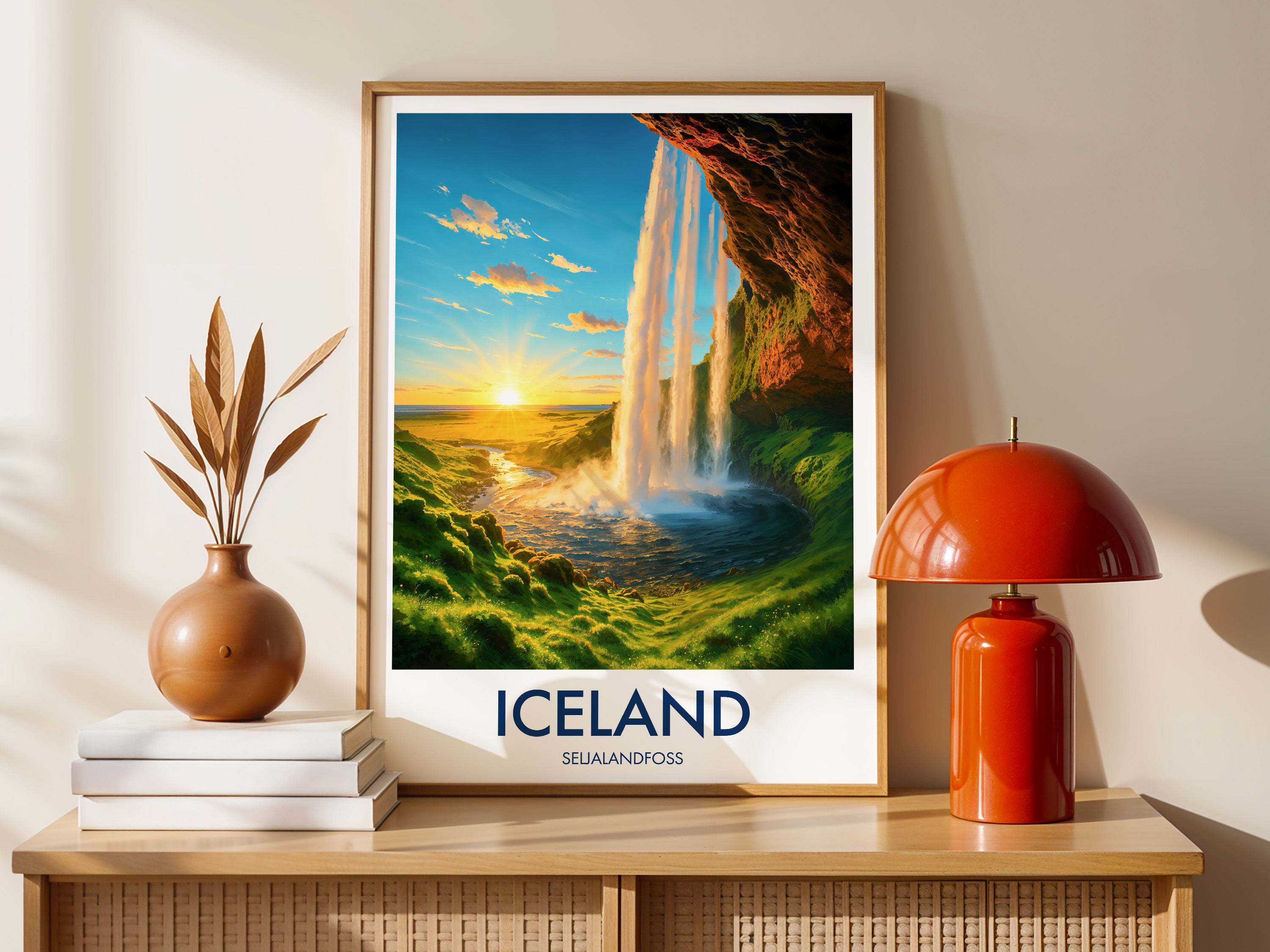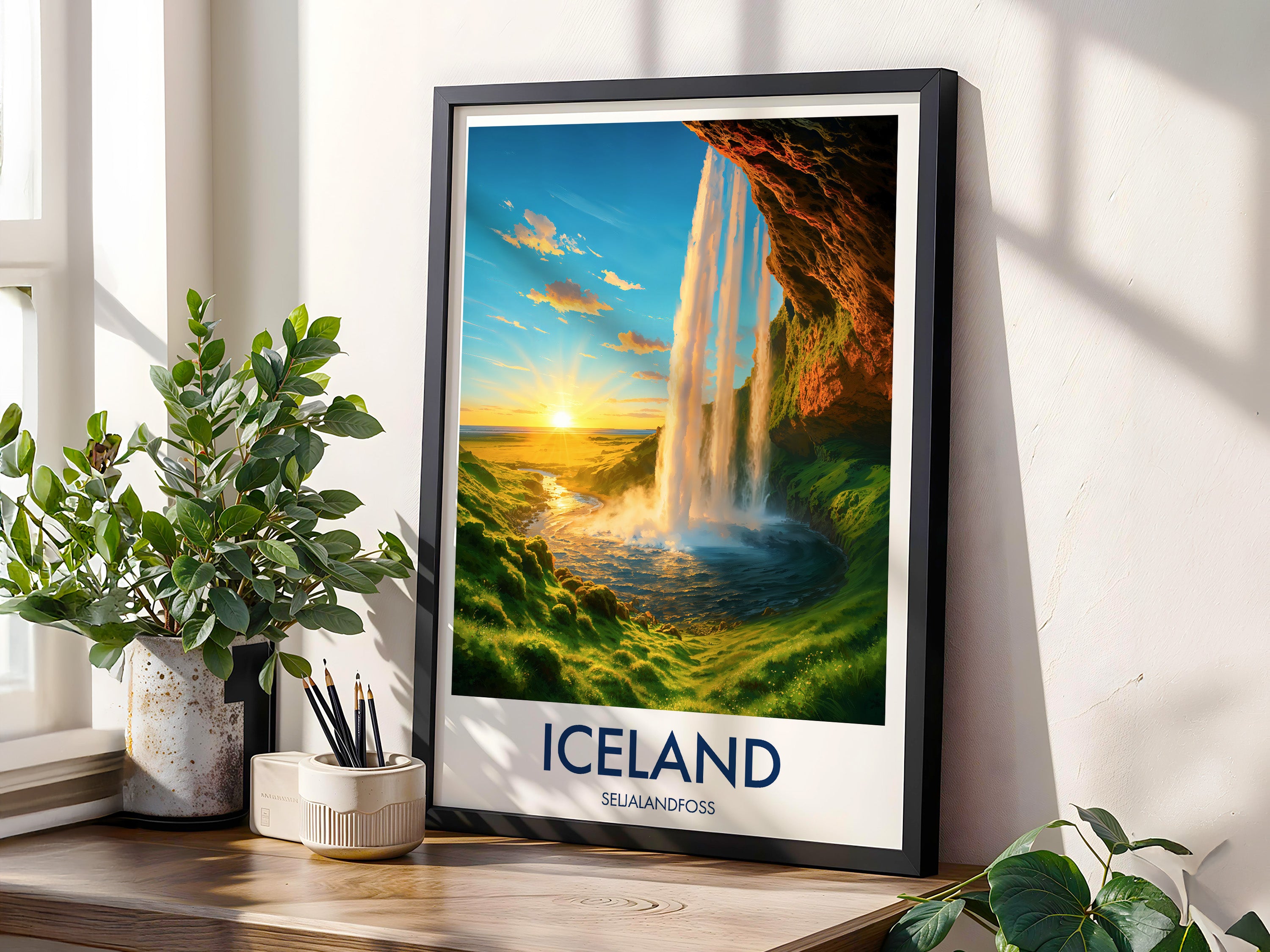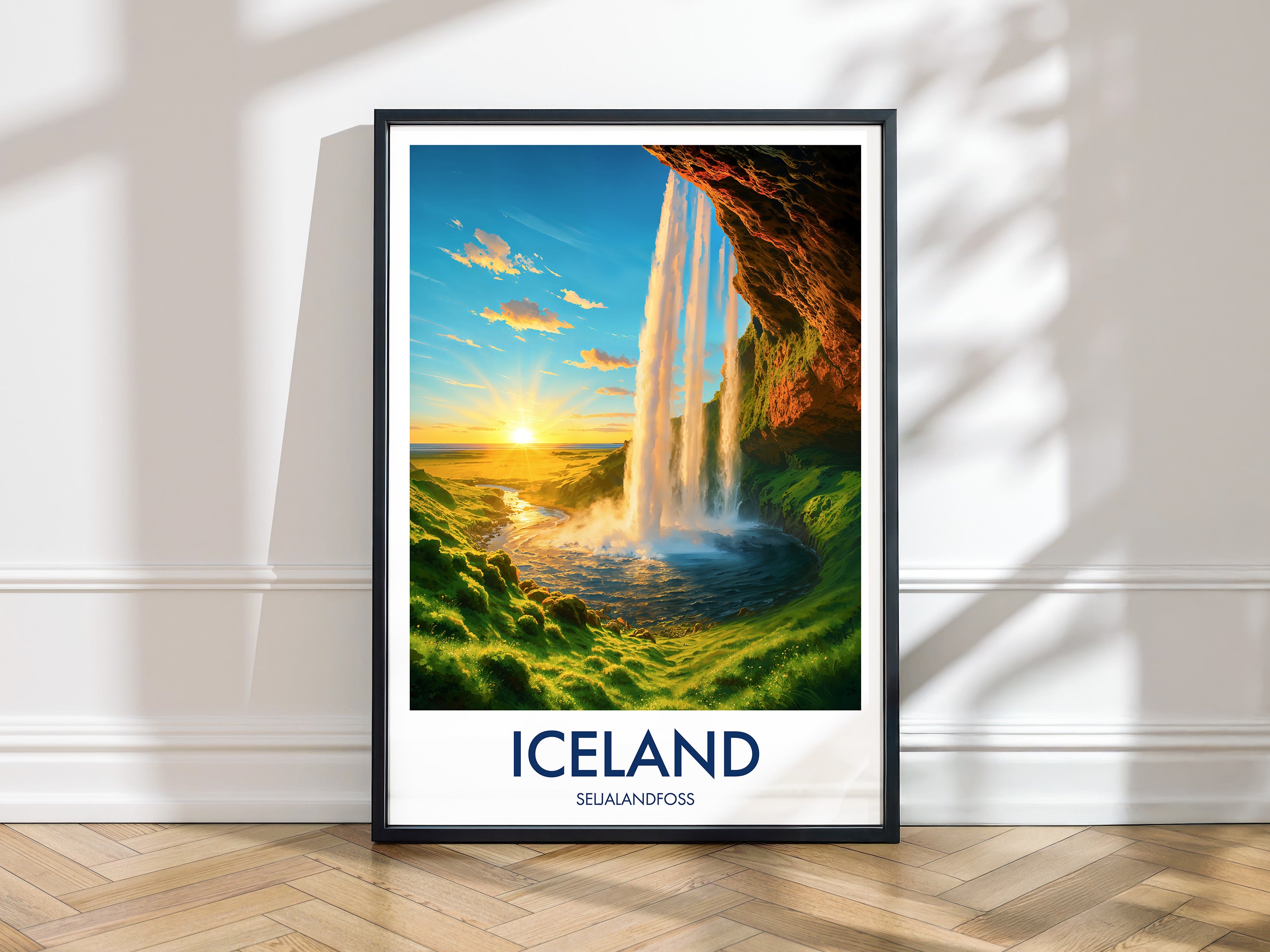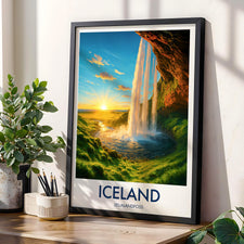 Capture the magic of Iceland’s Seljalandfoss at sunset with this vibrant illustrated print. Celebrate dramatic falls, golden light, and lush Nordic scenery.