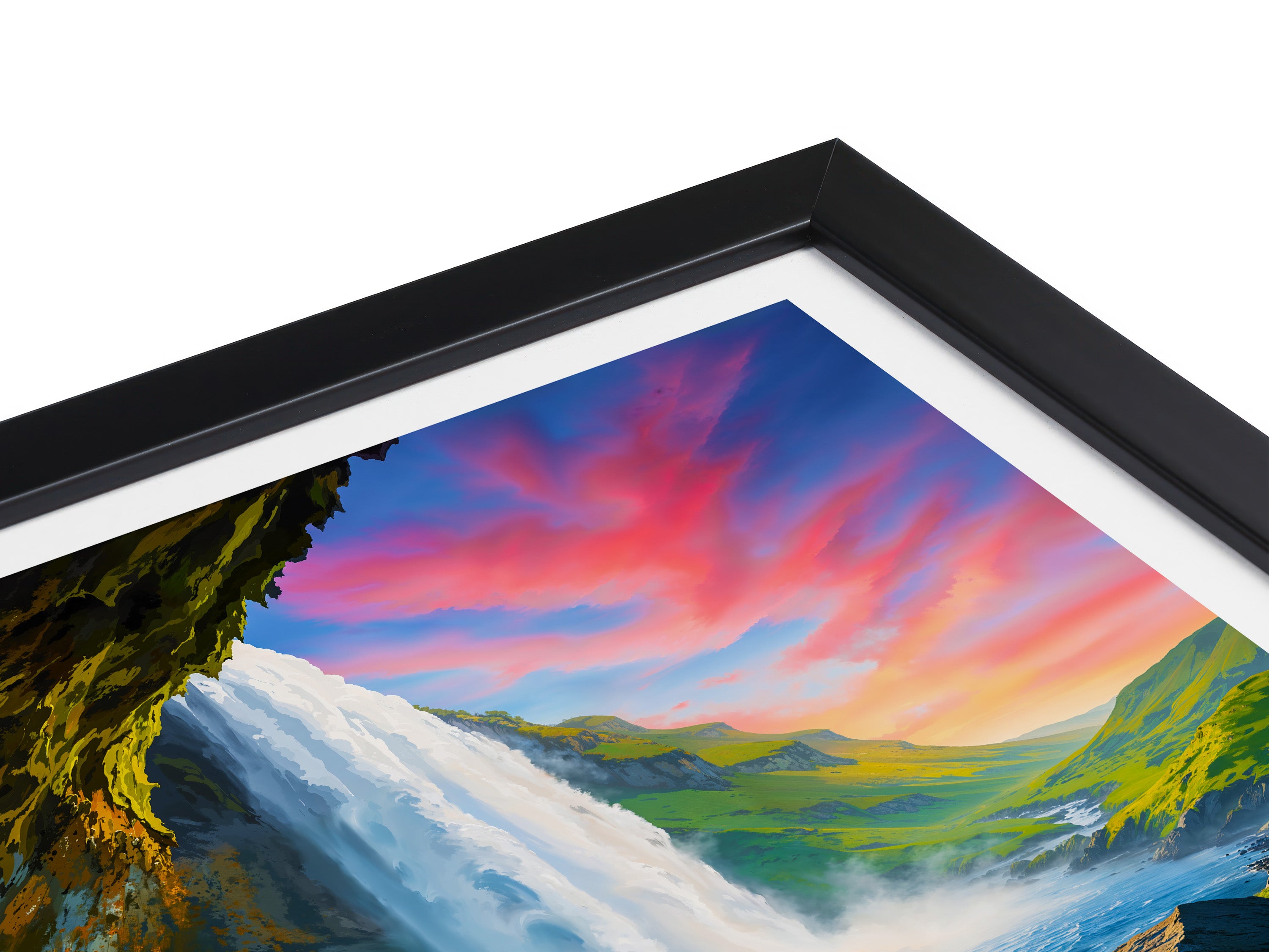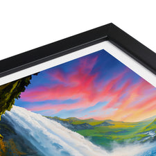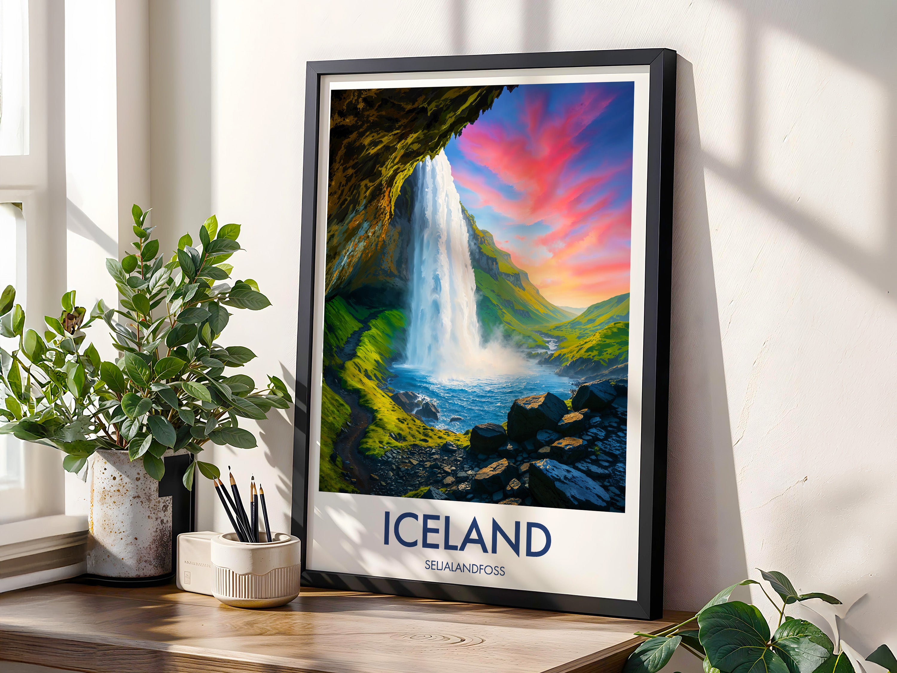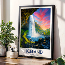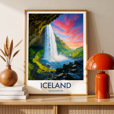 Capture the majestic Seljalandsfoss waterfall against a fiery red sky with this exquisite print. The tranquil waters meet vibrant skies, creating an awe-inspiring backdrop synonymous with Iceland's beauty.
