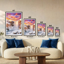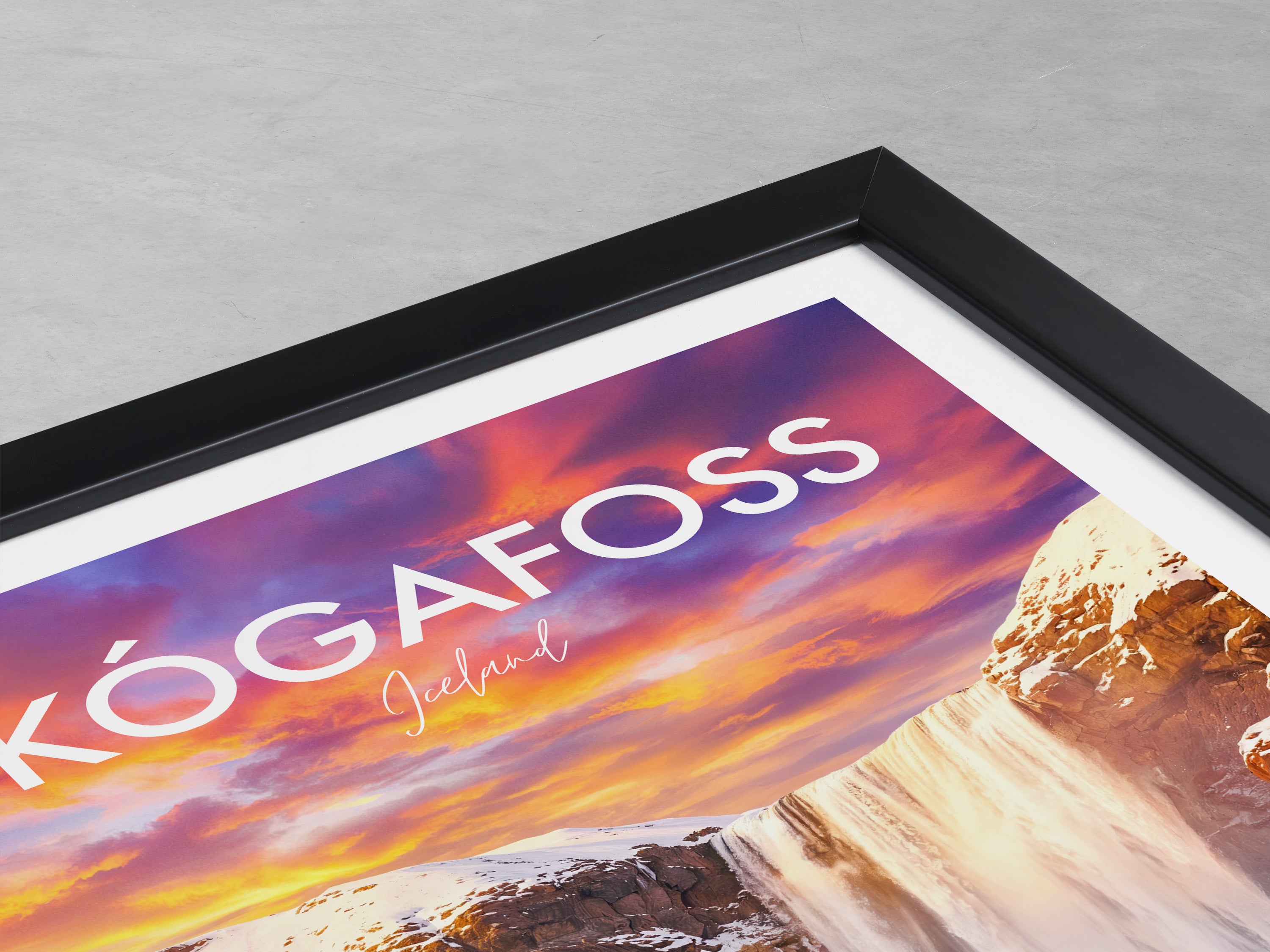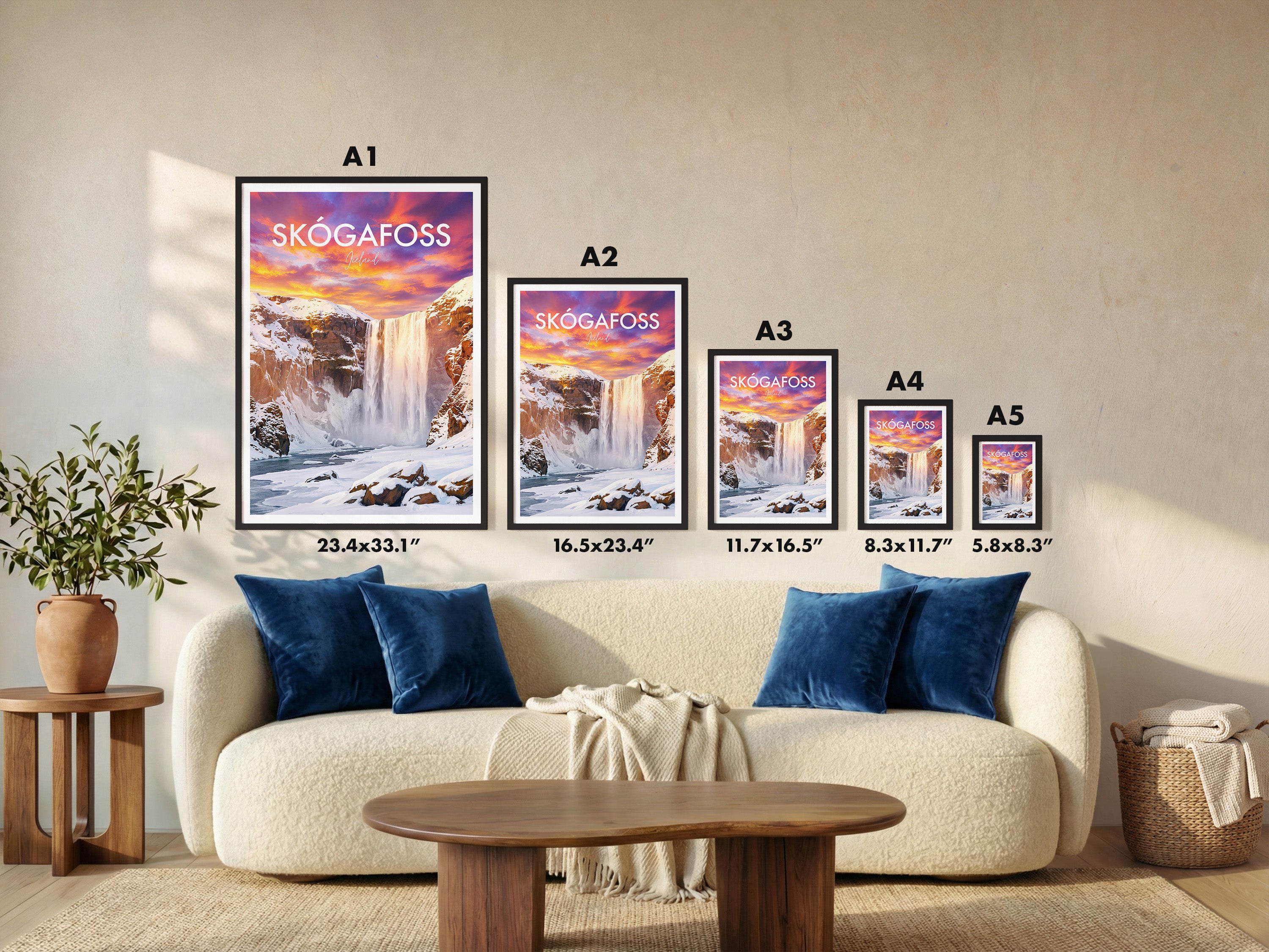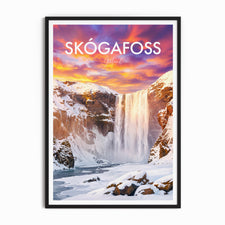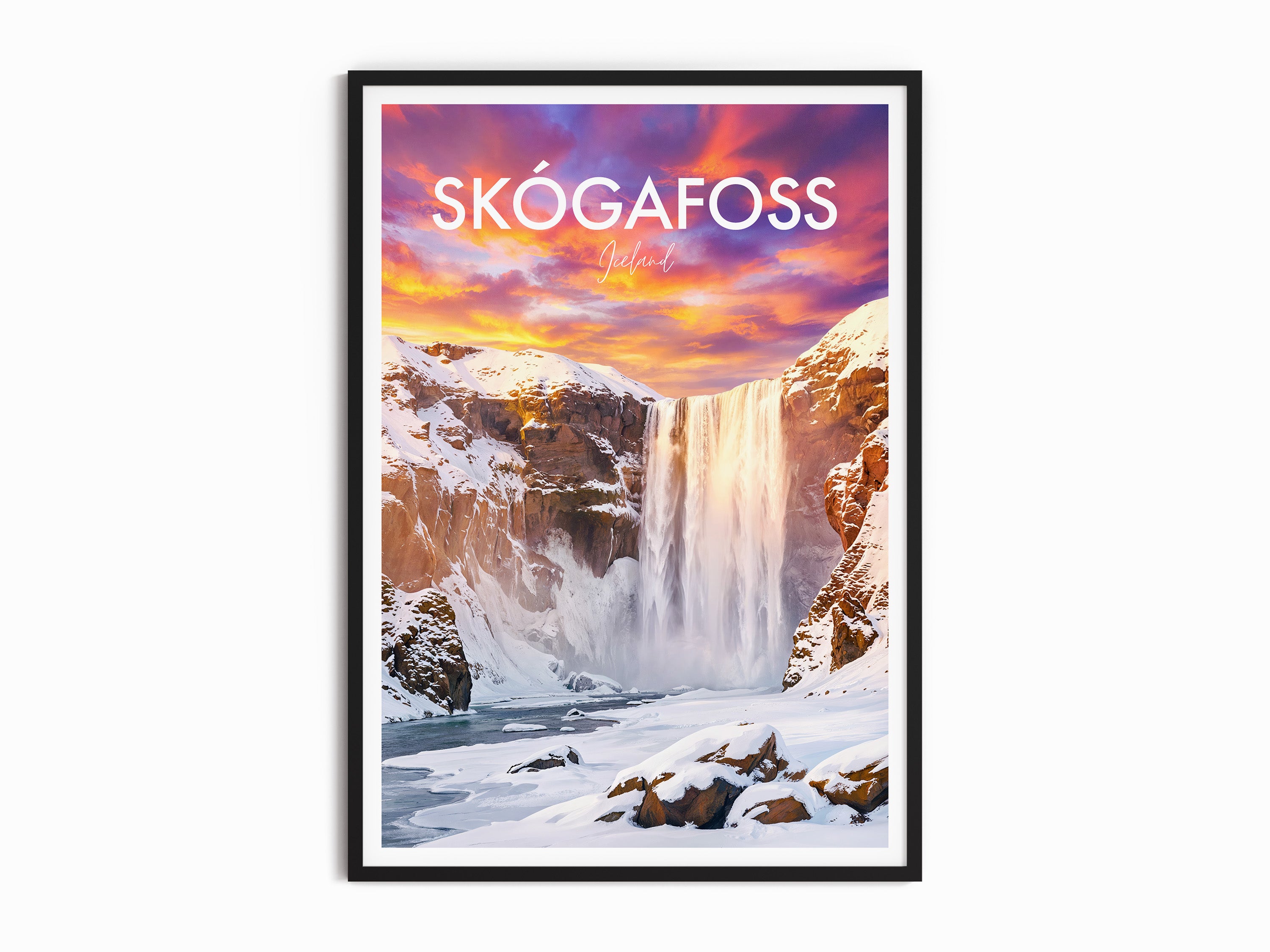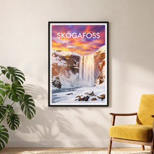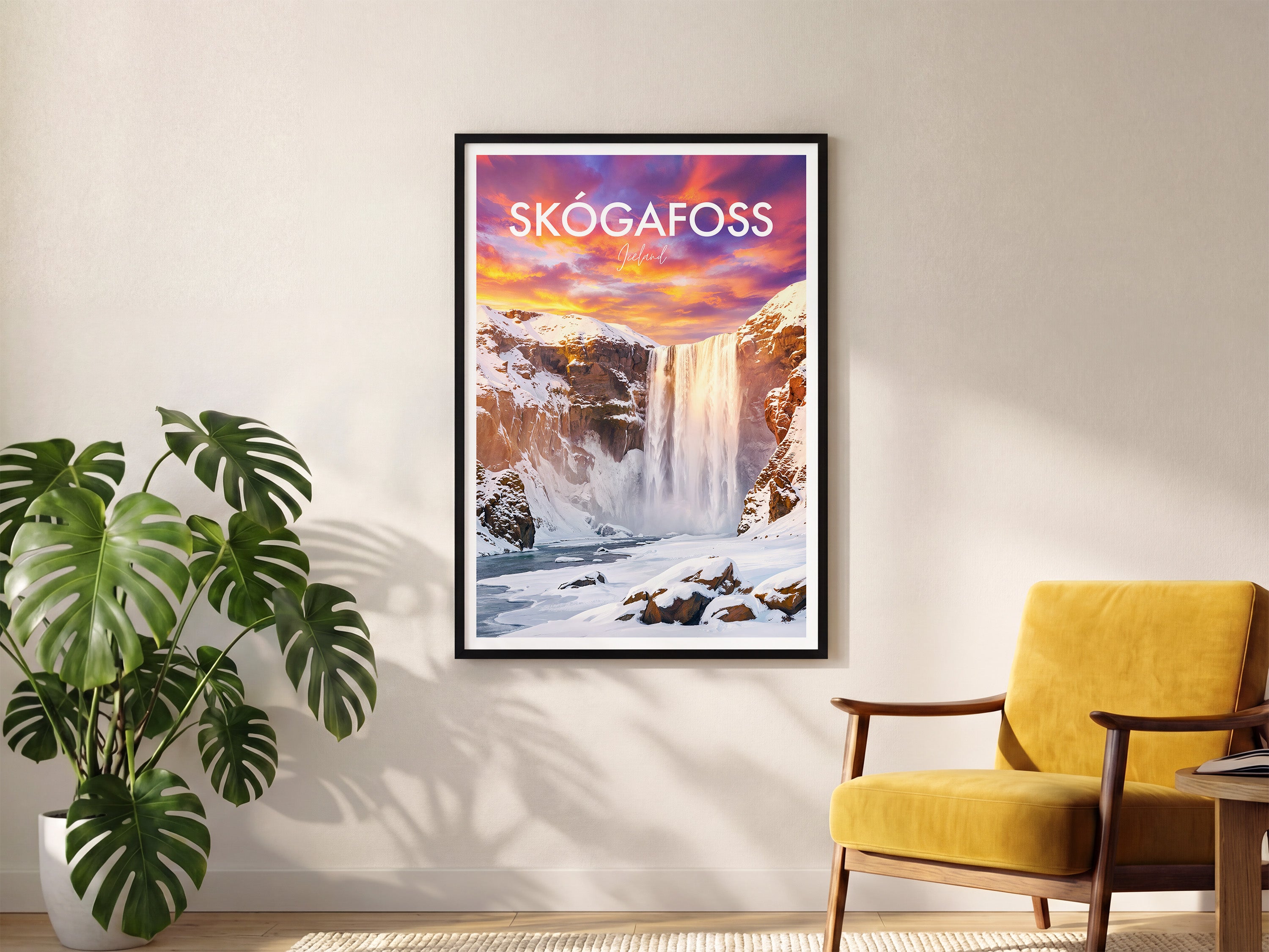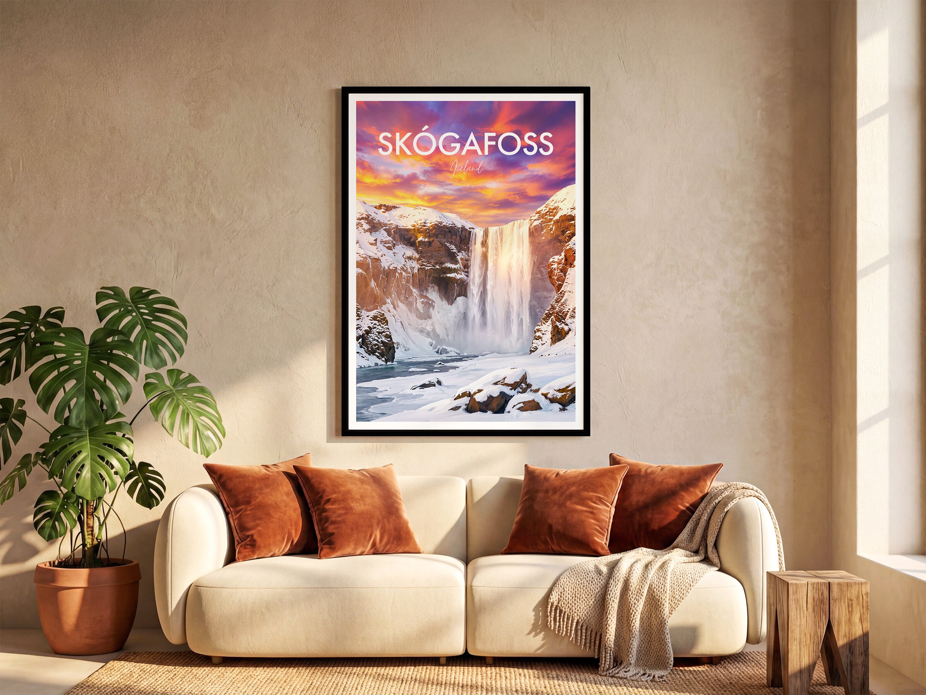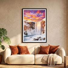 Bring a touch of Icelandic beauty to your home with this Skogafoss print. Skogafoss, the iconic Icelandic waterfall, stands as a tranquil icon perfect for travel poster collections or wanderlust wall art. Ideal for Nordic decor lovers and gifting, this art print adds serene waterfall charm to any space.