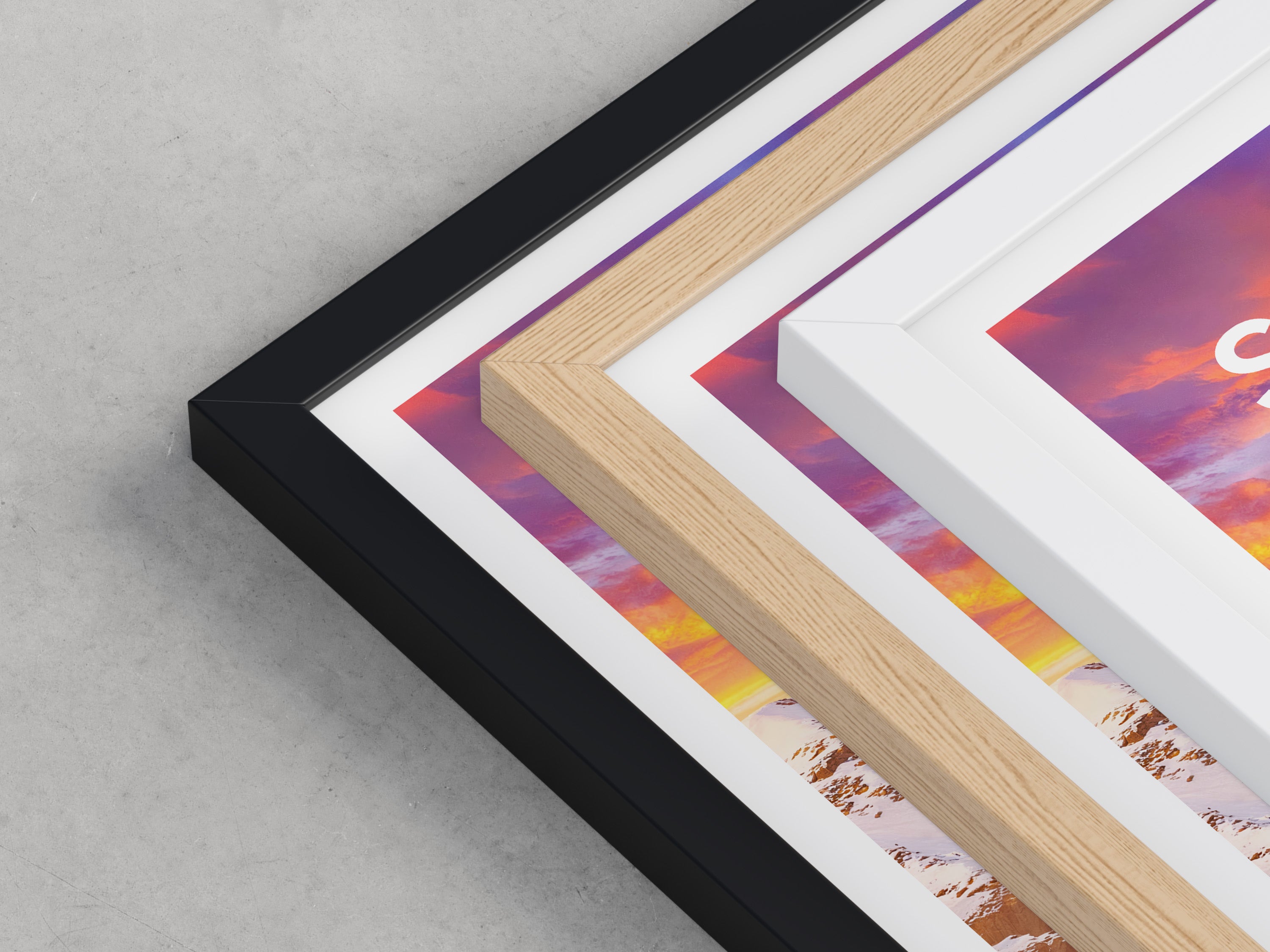Framed options use sustainably sourced wooden frames in black, white, or natural wood, ready to hang.