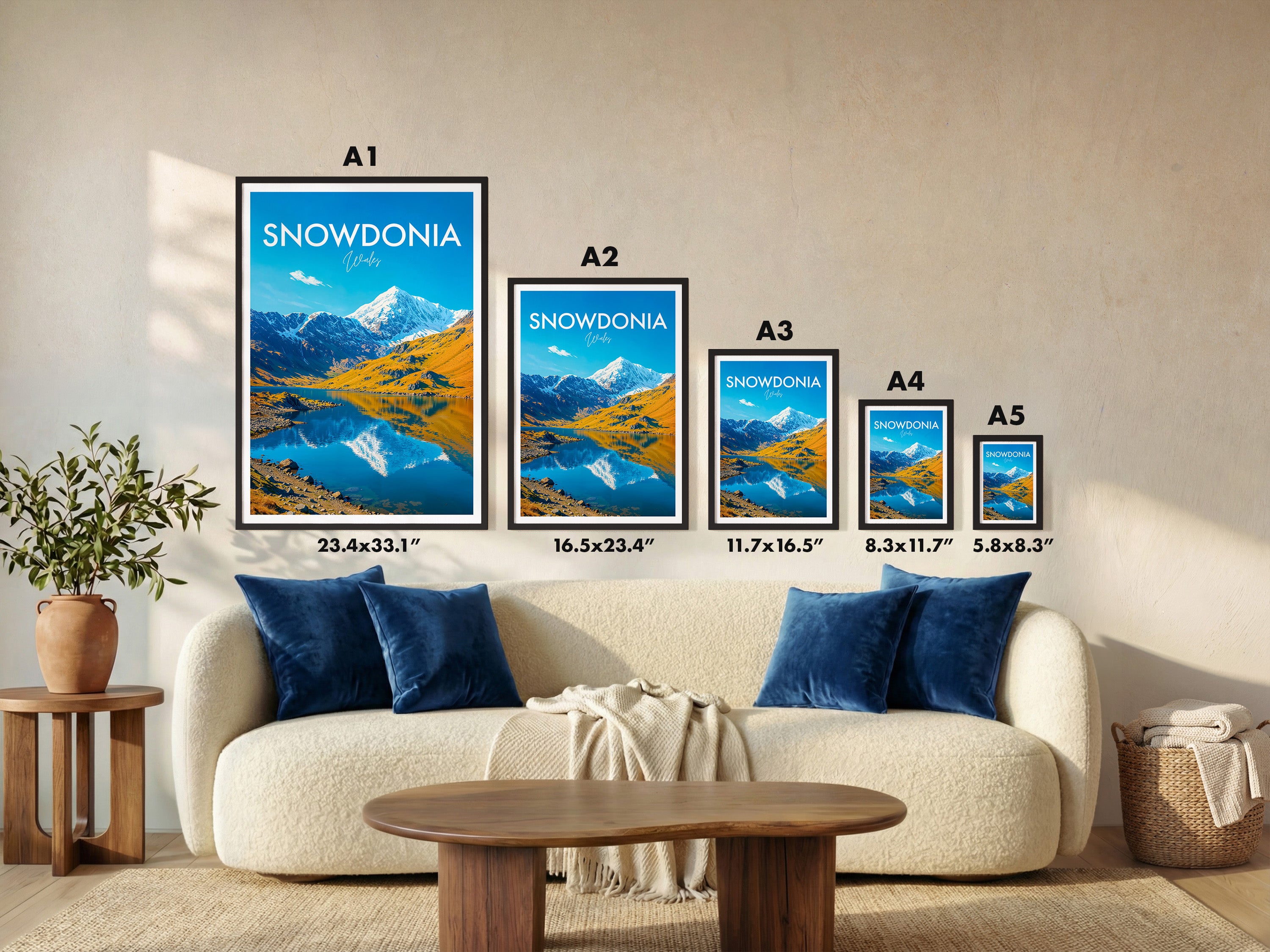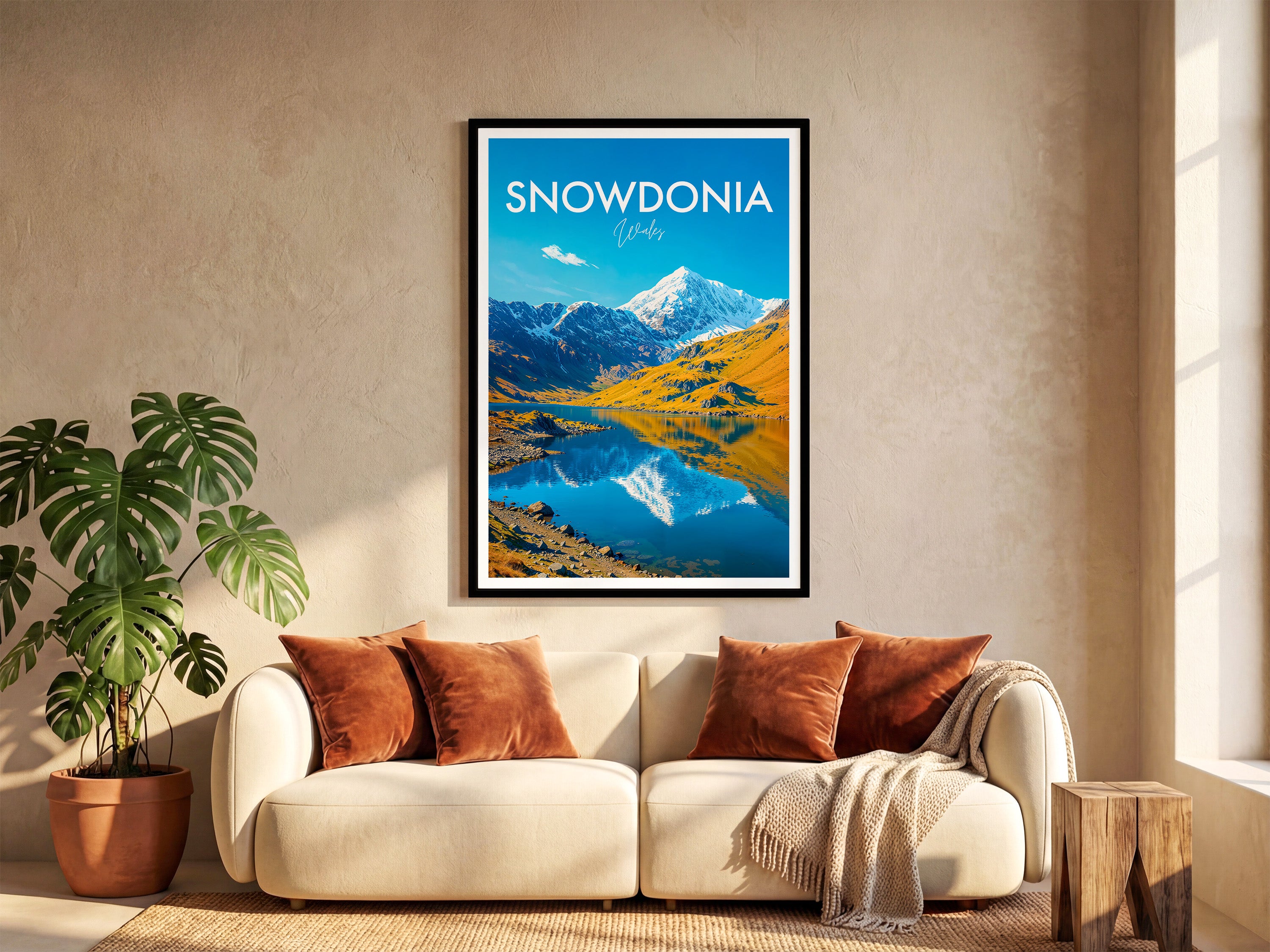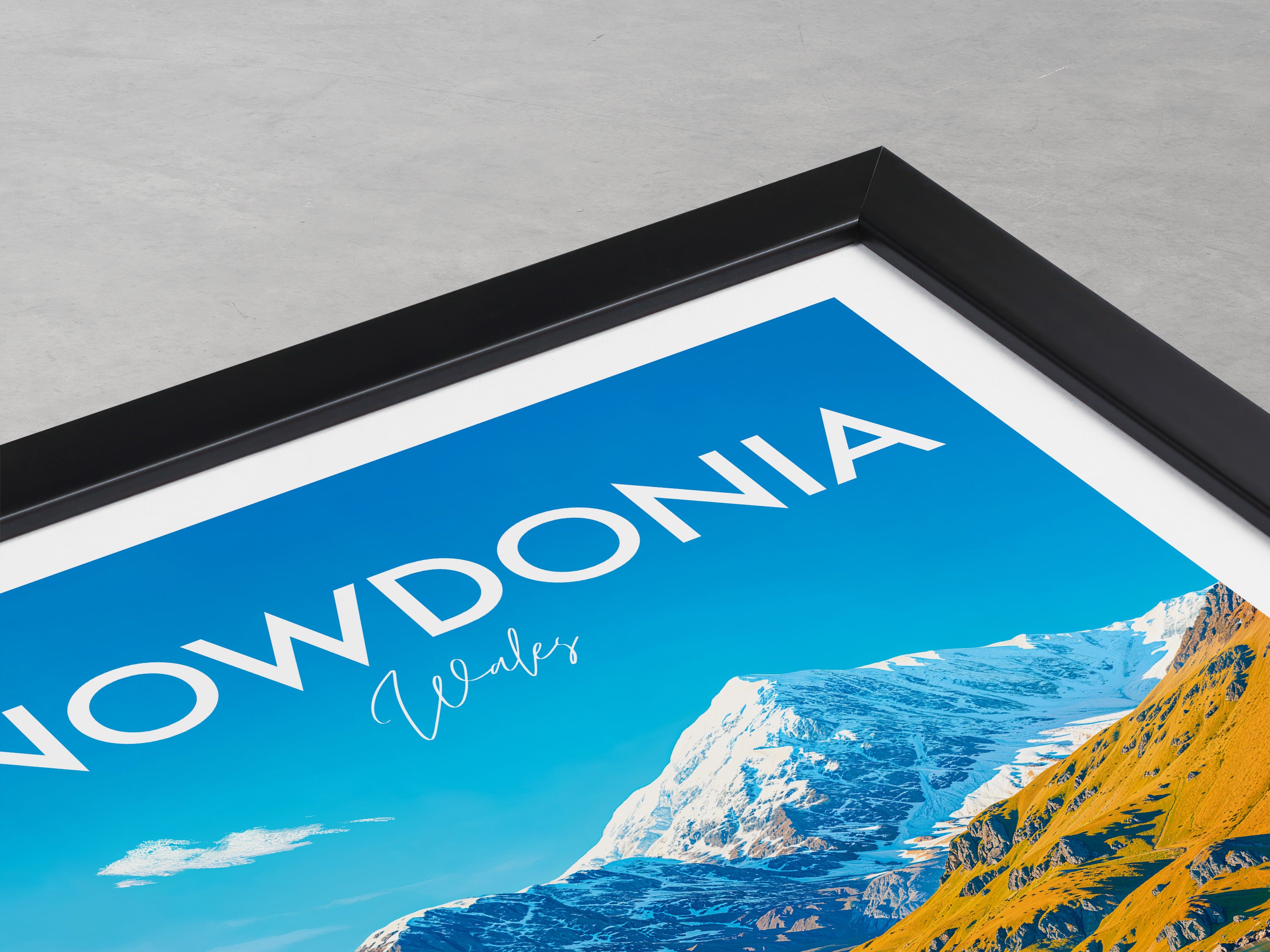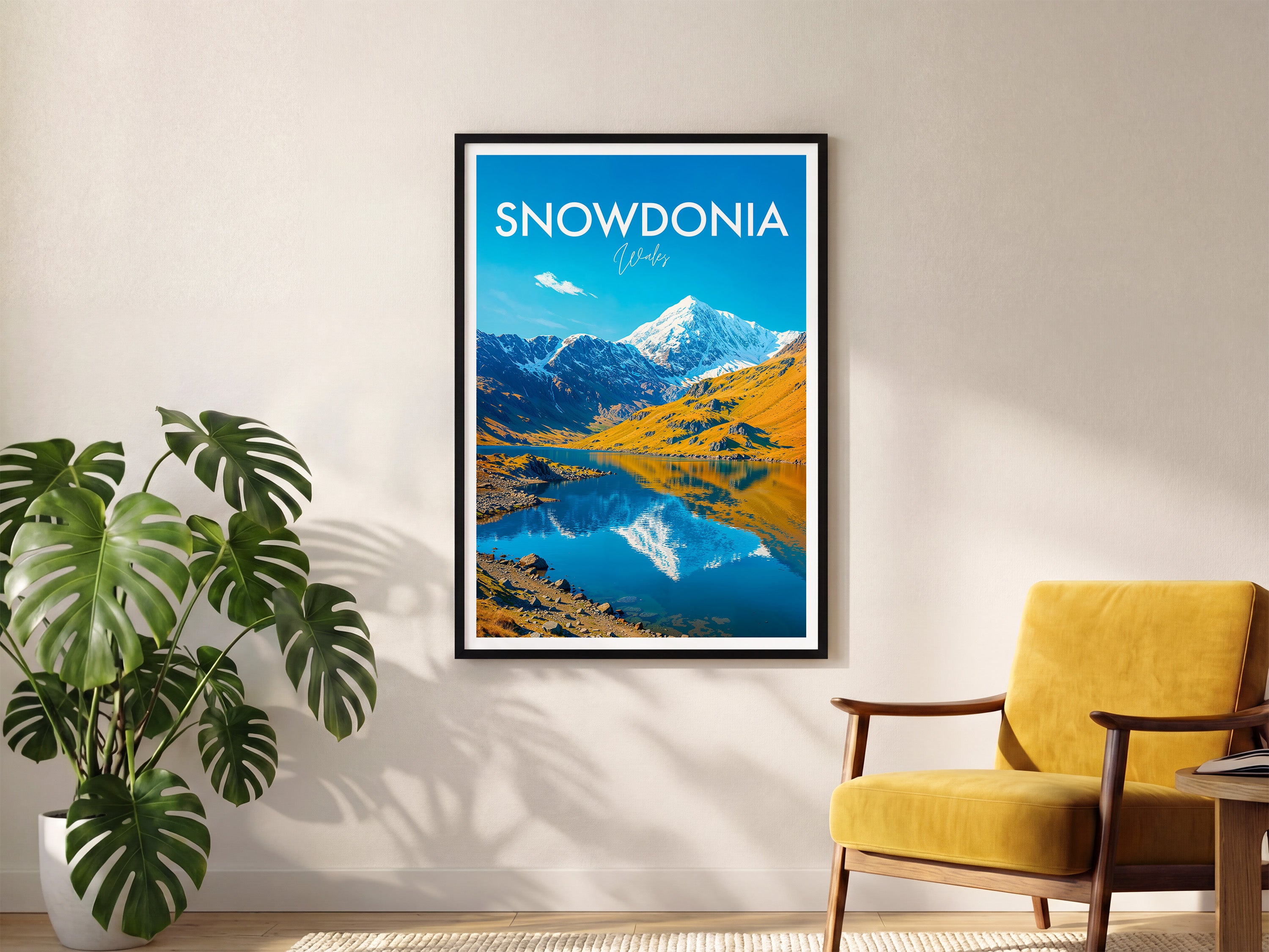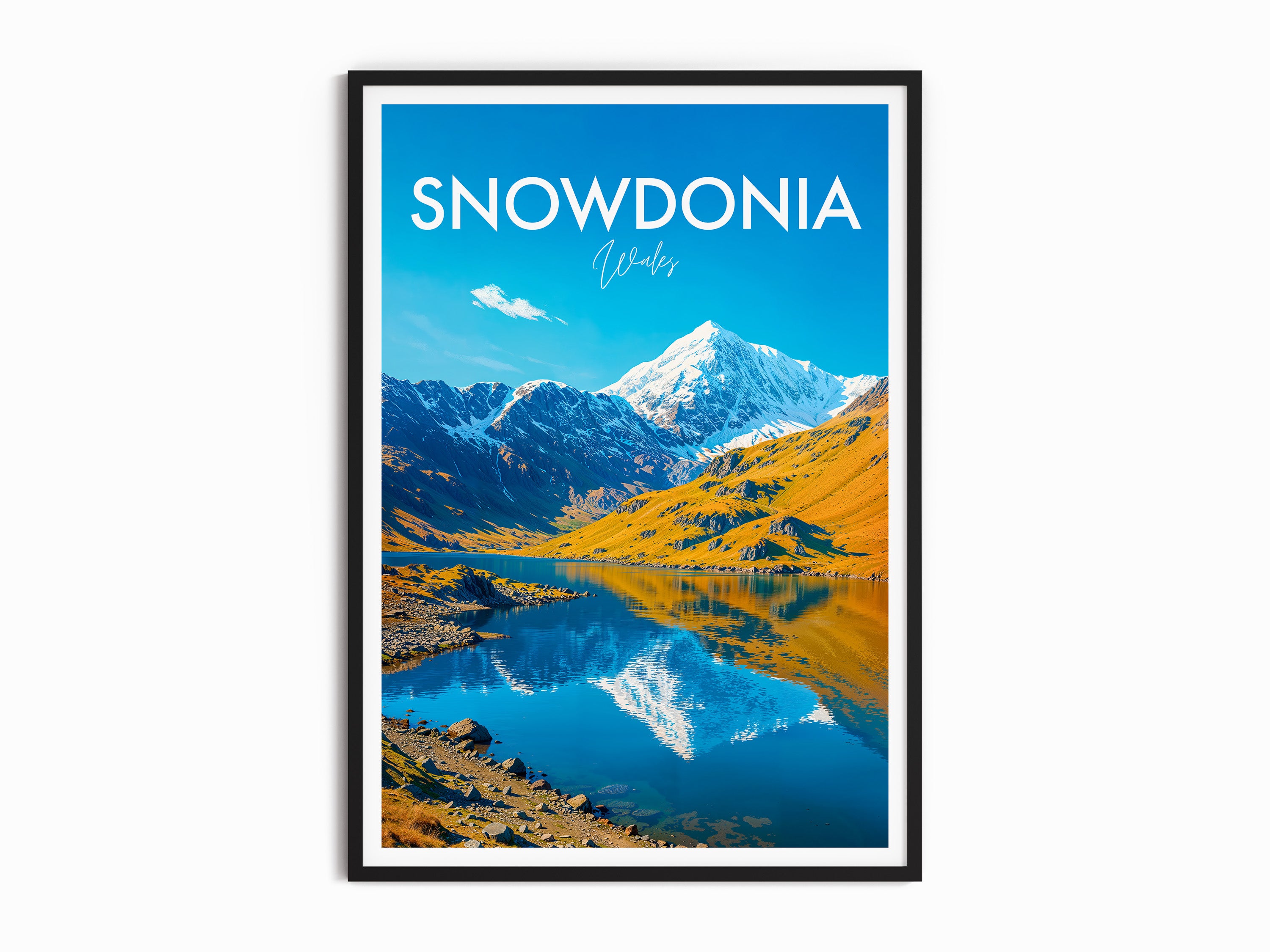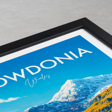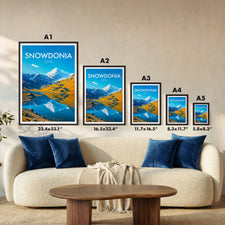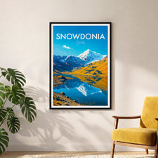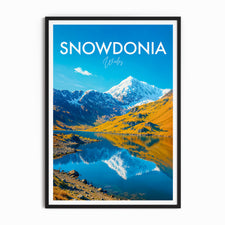 Celebrate the beauty of Snowdonia with this illustrated print of Snowdon. Featuring vivid peaks mirrored in clear lakes, it's perfect for mountain lovers and Welsh scenery enthusiasts.