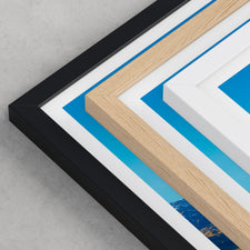 Framed options use sustainably sourced wooden frames in black, white, or natural wood, ready to hang.