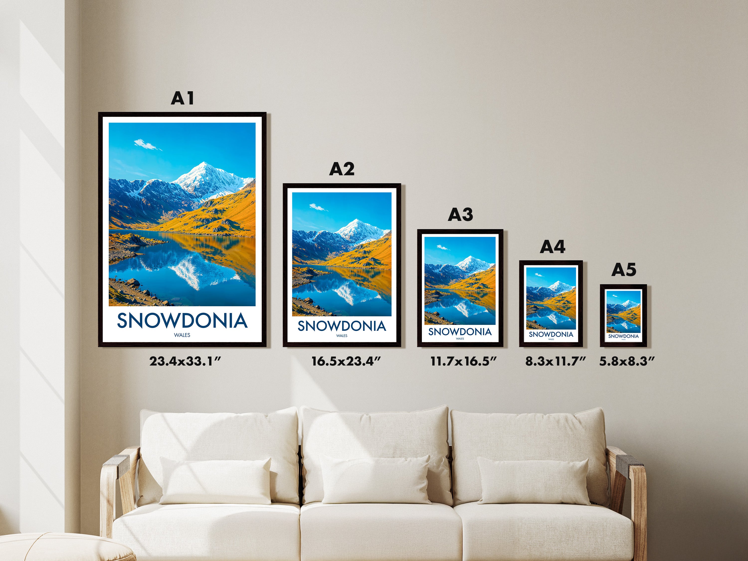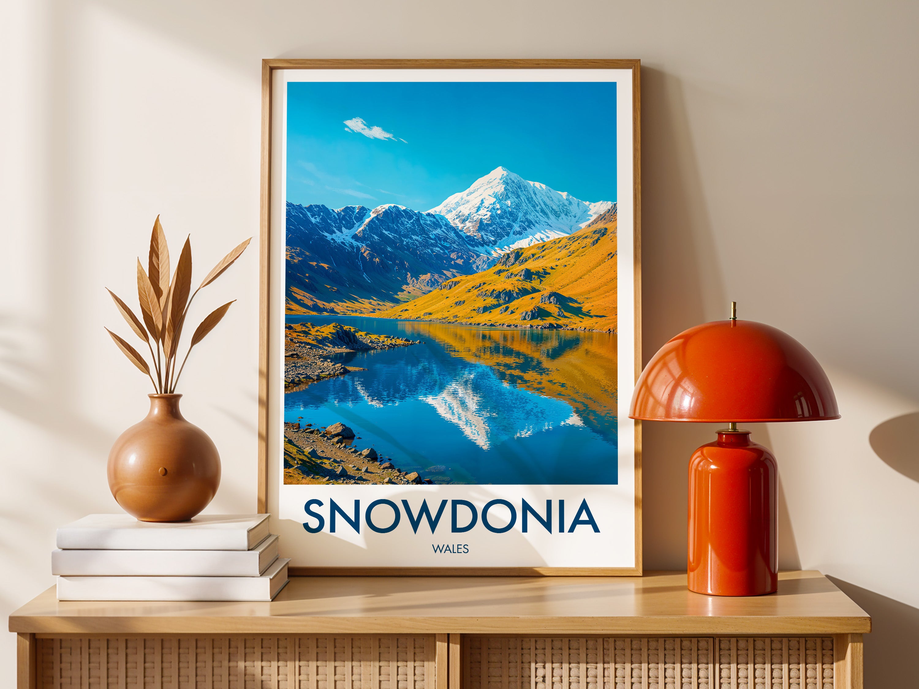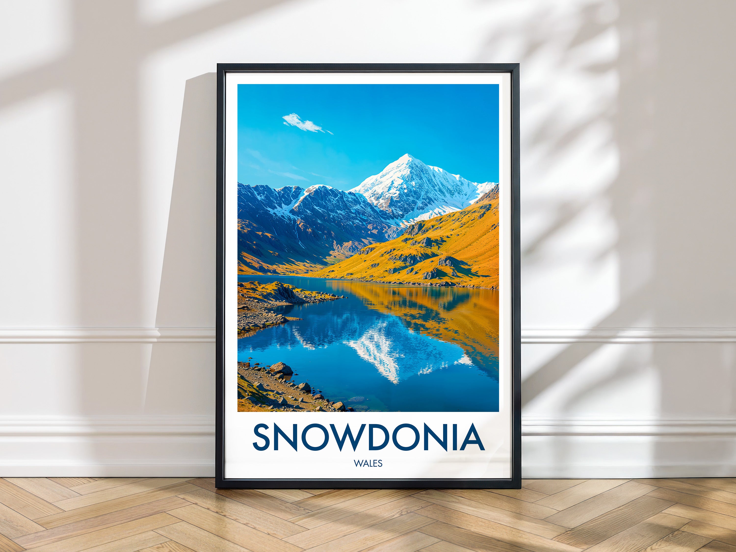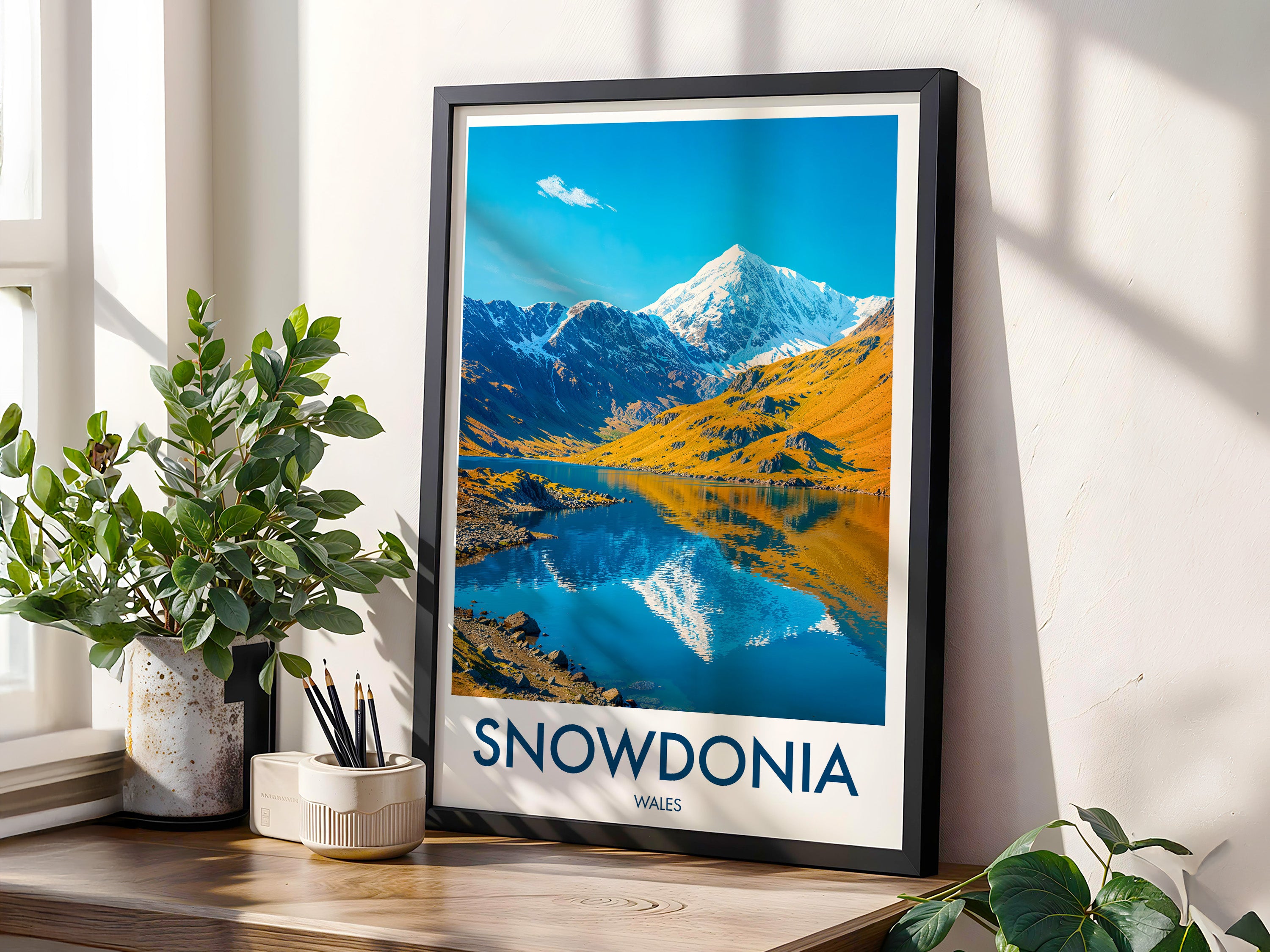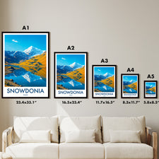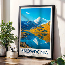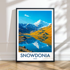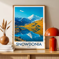Celebrate the beauty of Snowdonia with this illustrated print of Snowdon. Featuring vivid peaks mirrored in clear lakes, it's perfect for mountain lovers and Welsh scenery enthusiasts.