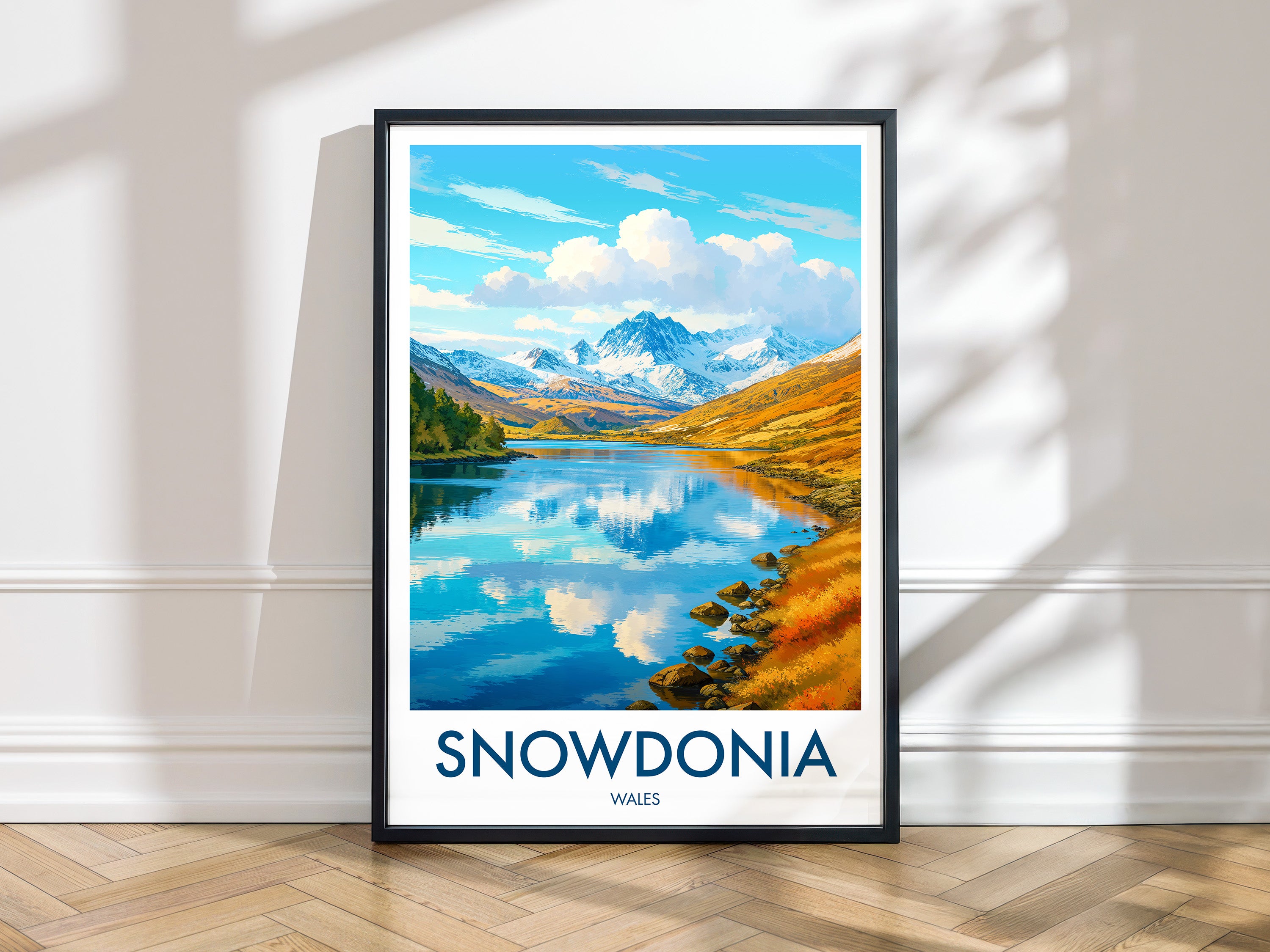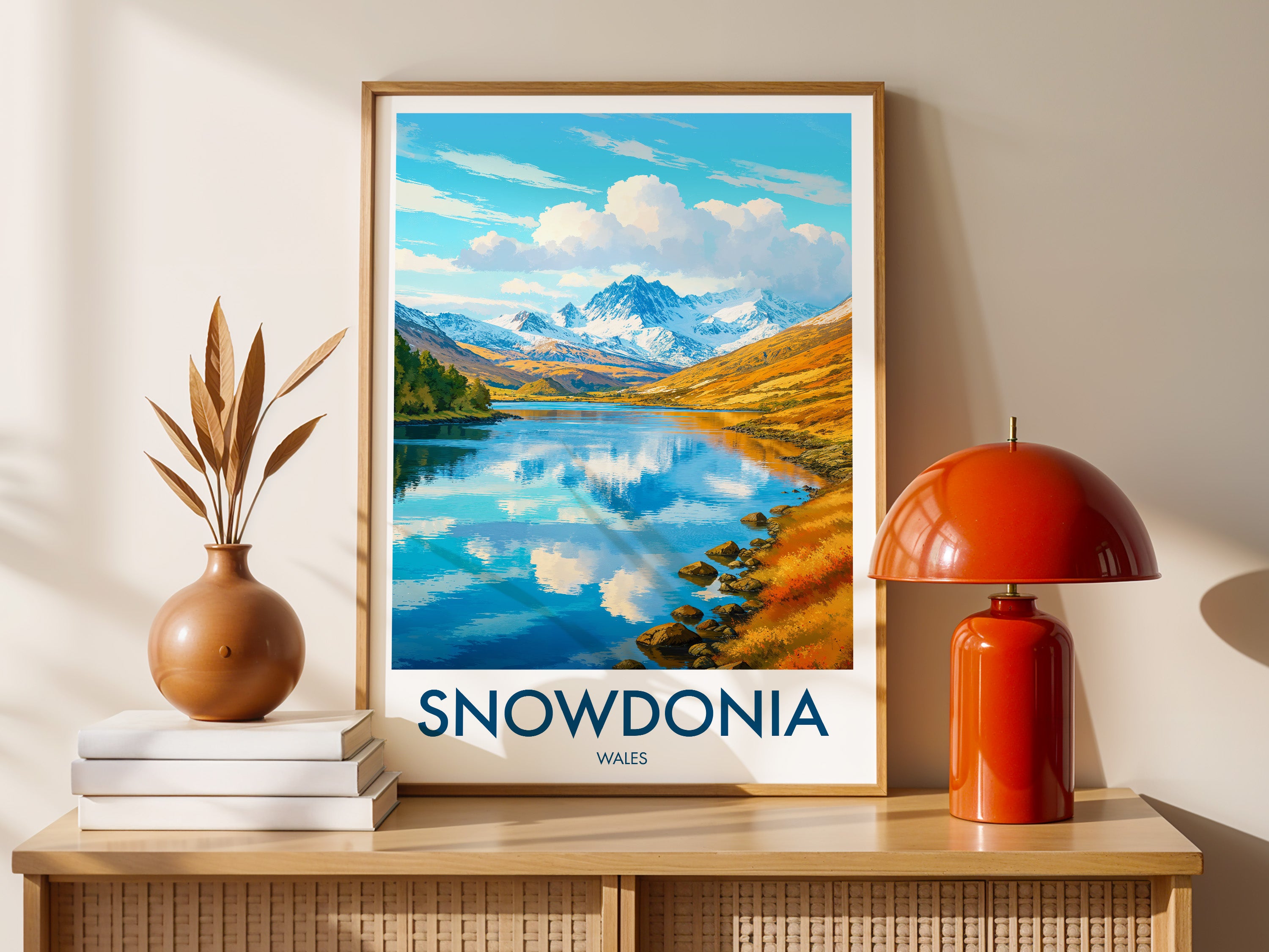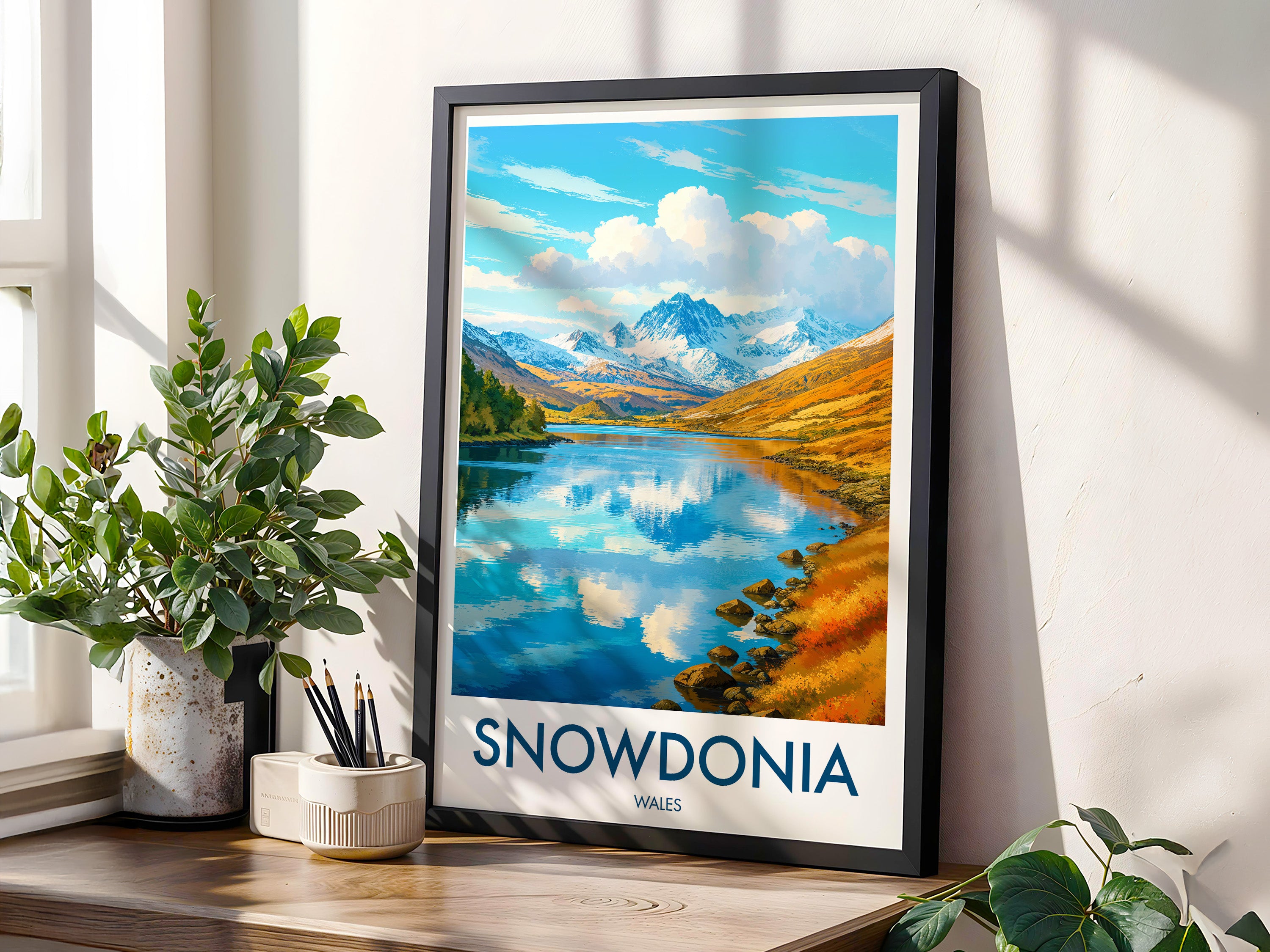 Experience Snowdonia’s rugged beauty with this illustrated Snowdon print, capturing the mountain’s iconic snow-capped peak reflected in a tranquil Welsh lake.