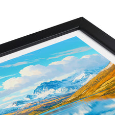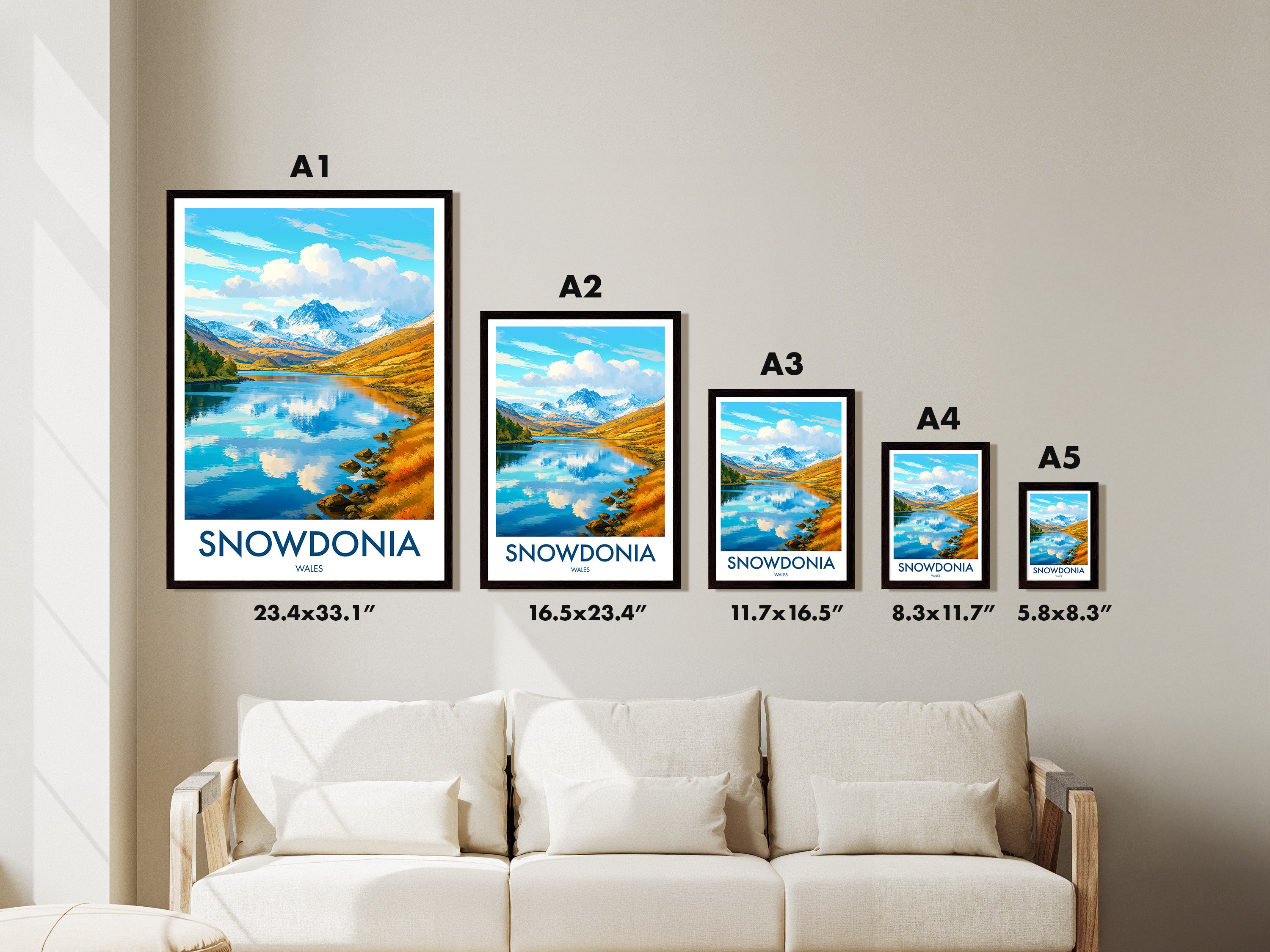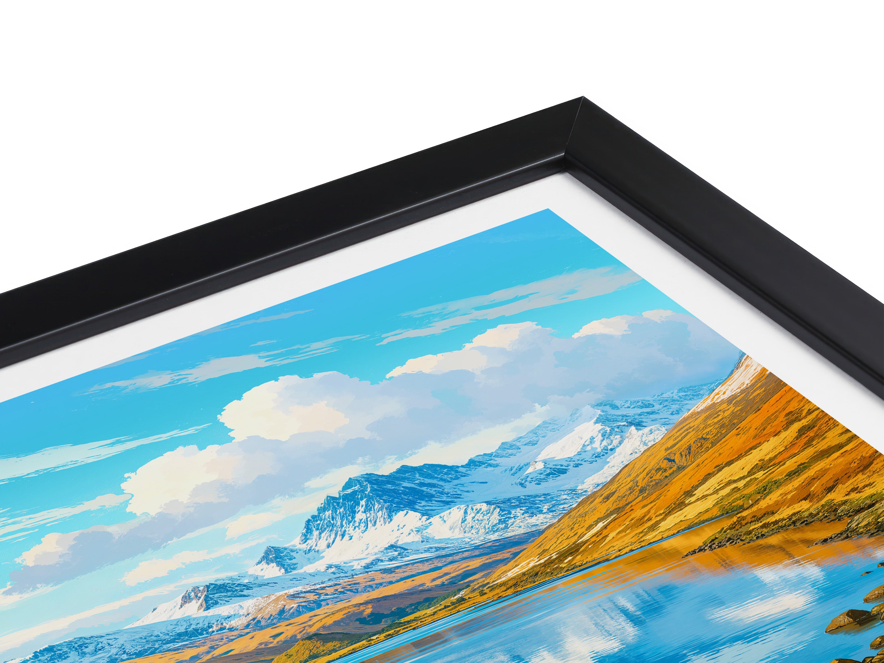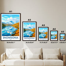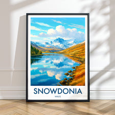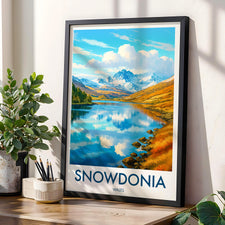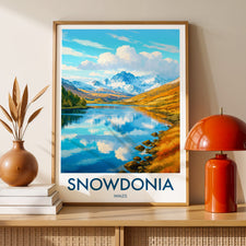 Experience Snowdonia’s rugged beauty with this illustrated Snowdon print, capturing the mountain’s iconic snow-capped peak reflected in a tranquil Welsh lake.
